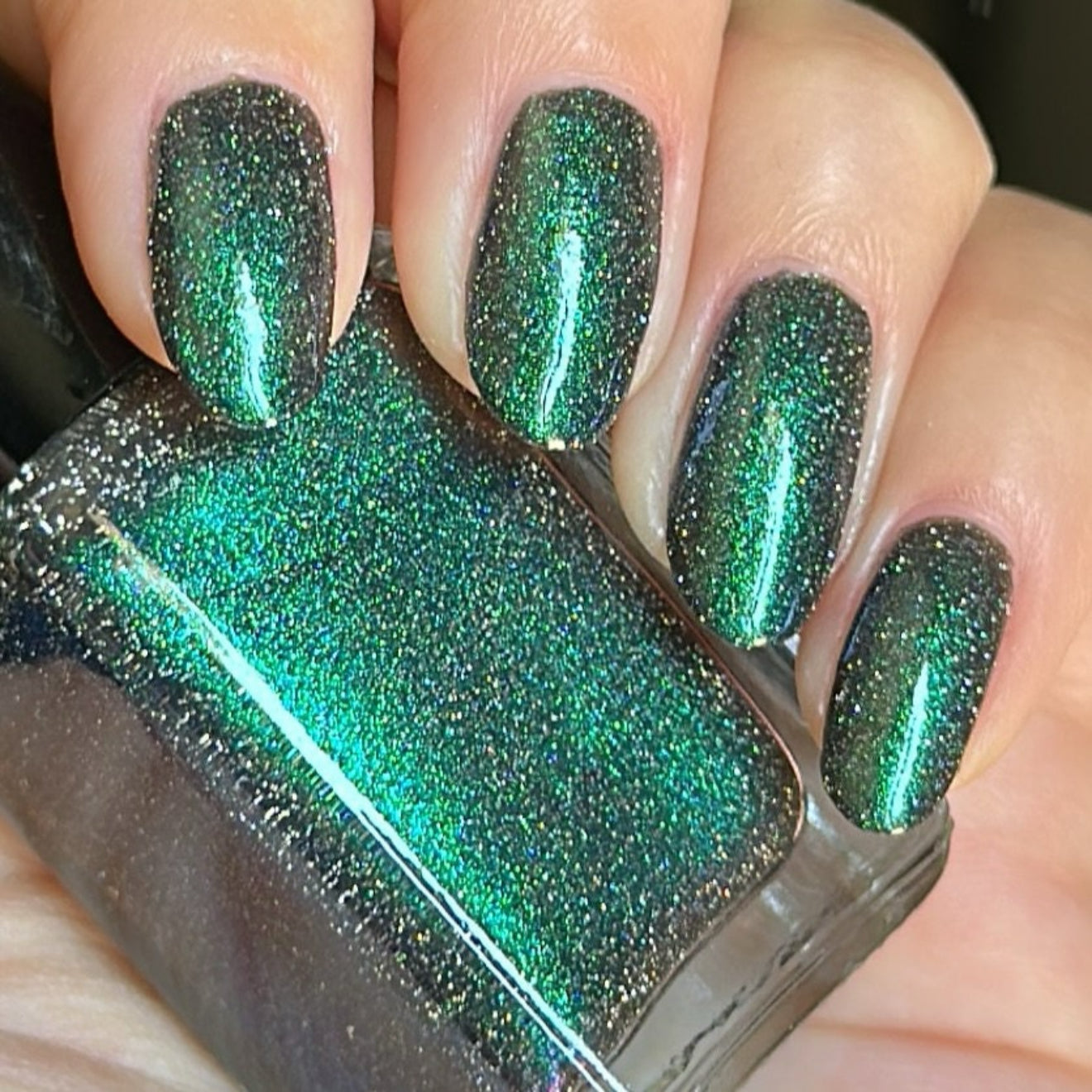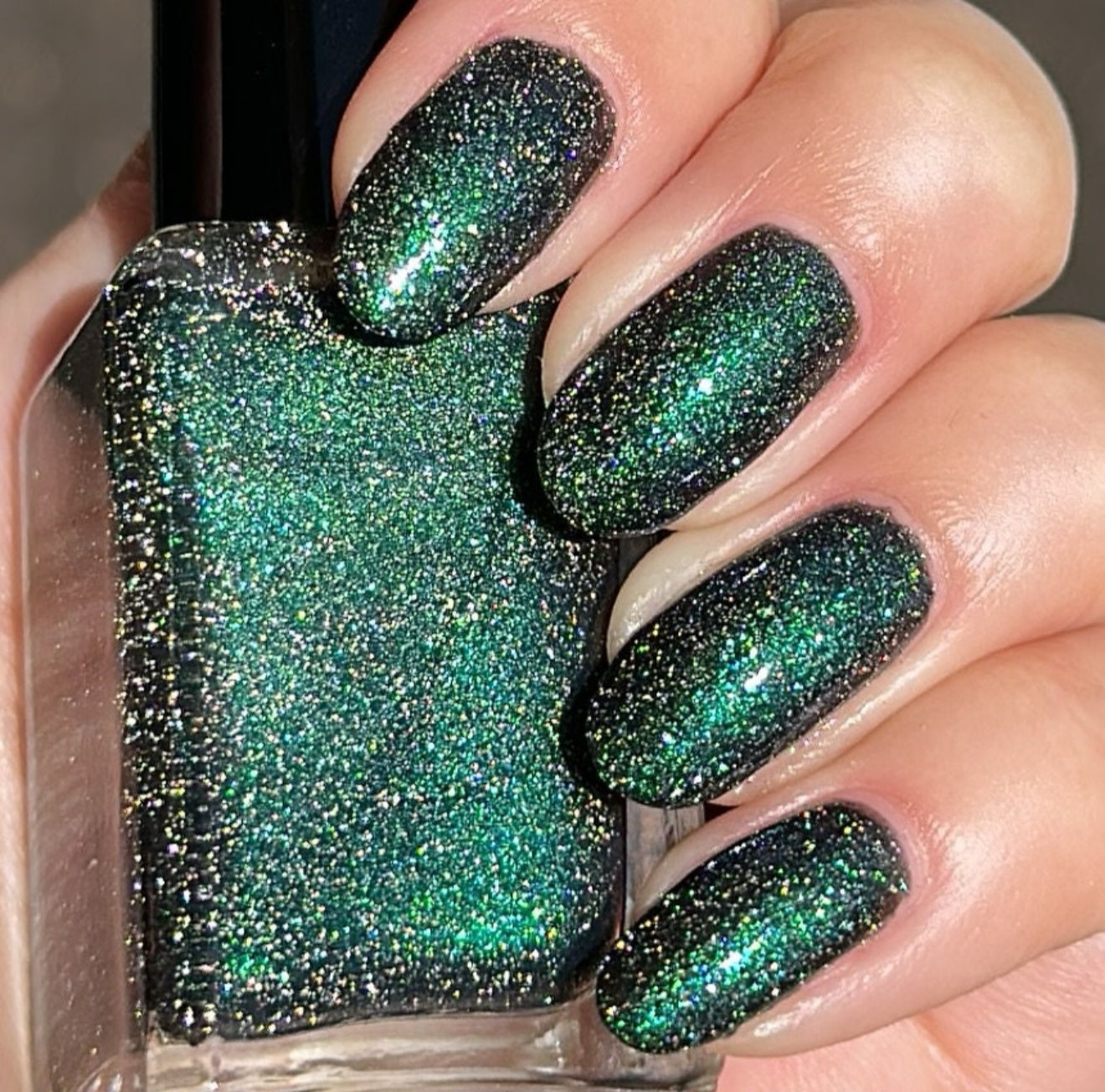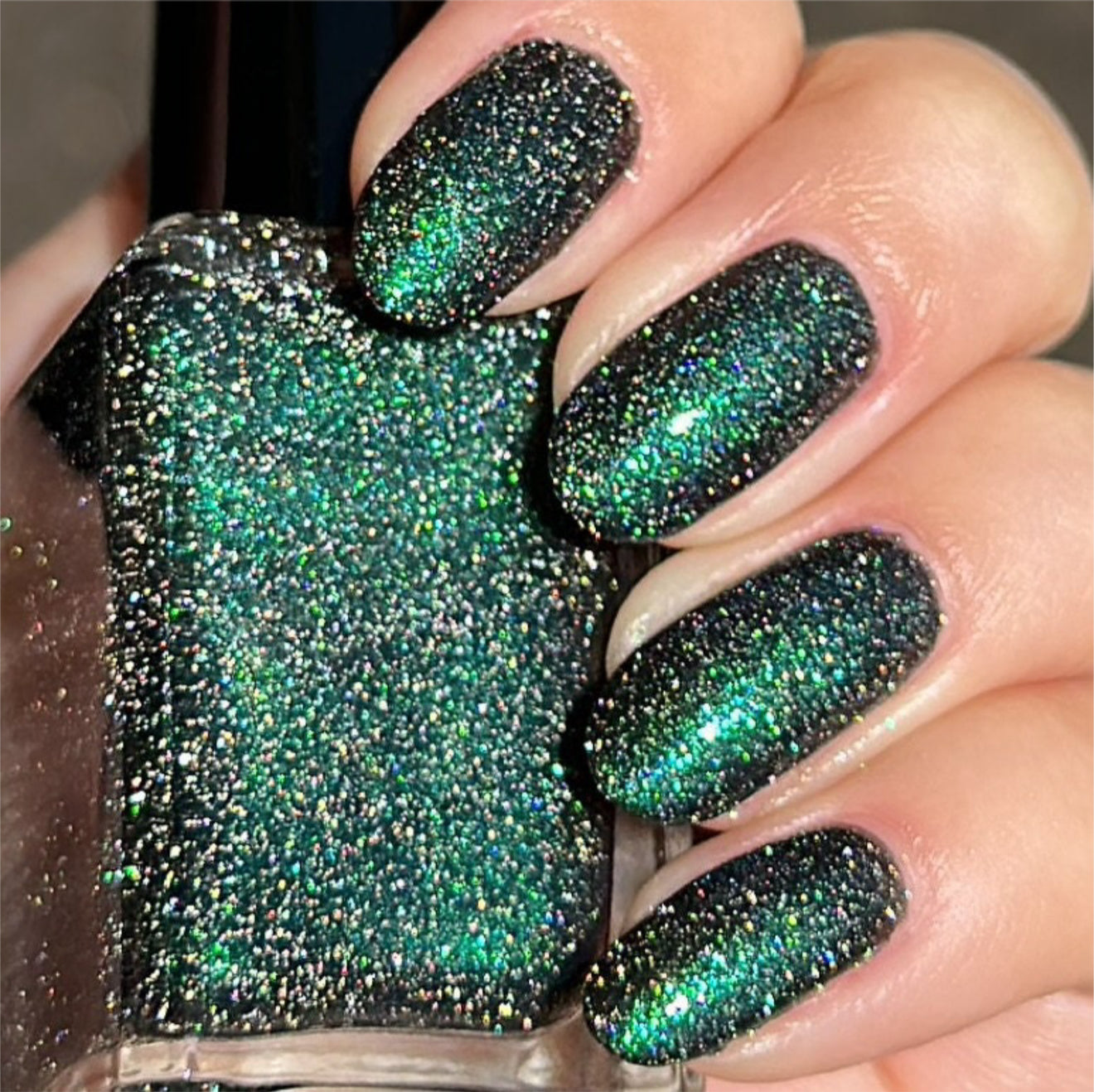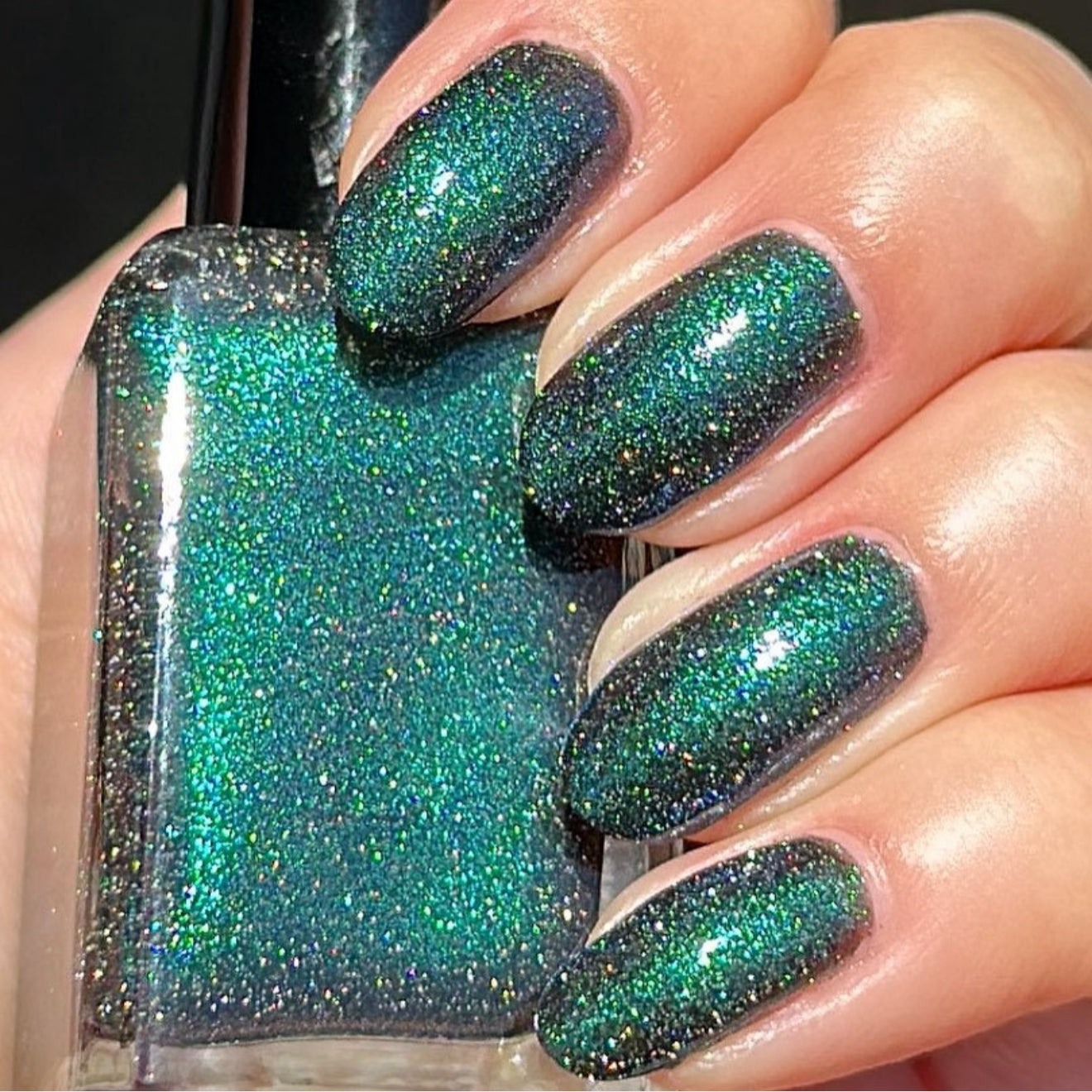 This is an inky black shade with bright turquoise iridescent shimmer and silver reflective glitter. The swatches show three coats with Top Glass top coat. .5 fl oz/15ml, 10 Free, hand mixed nail polish.