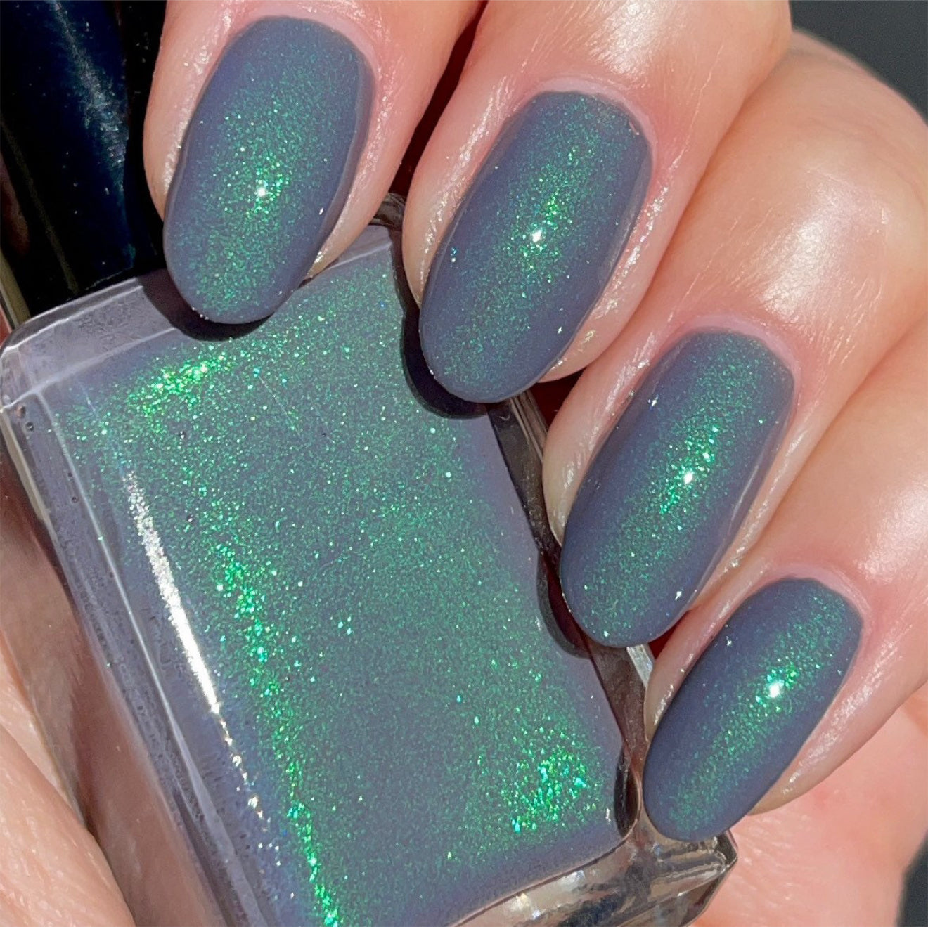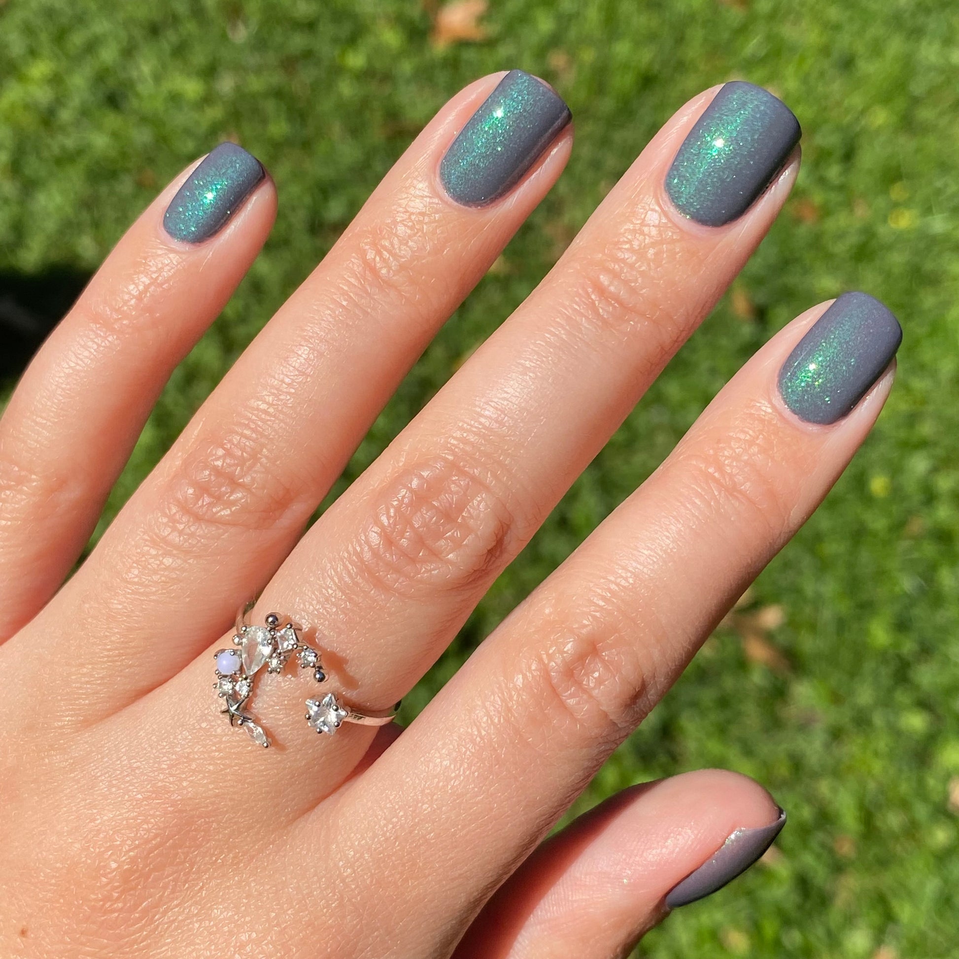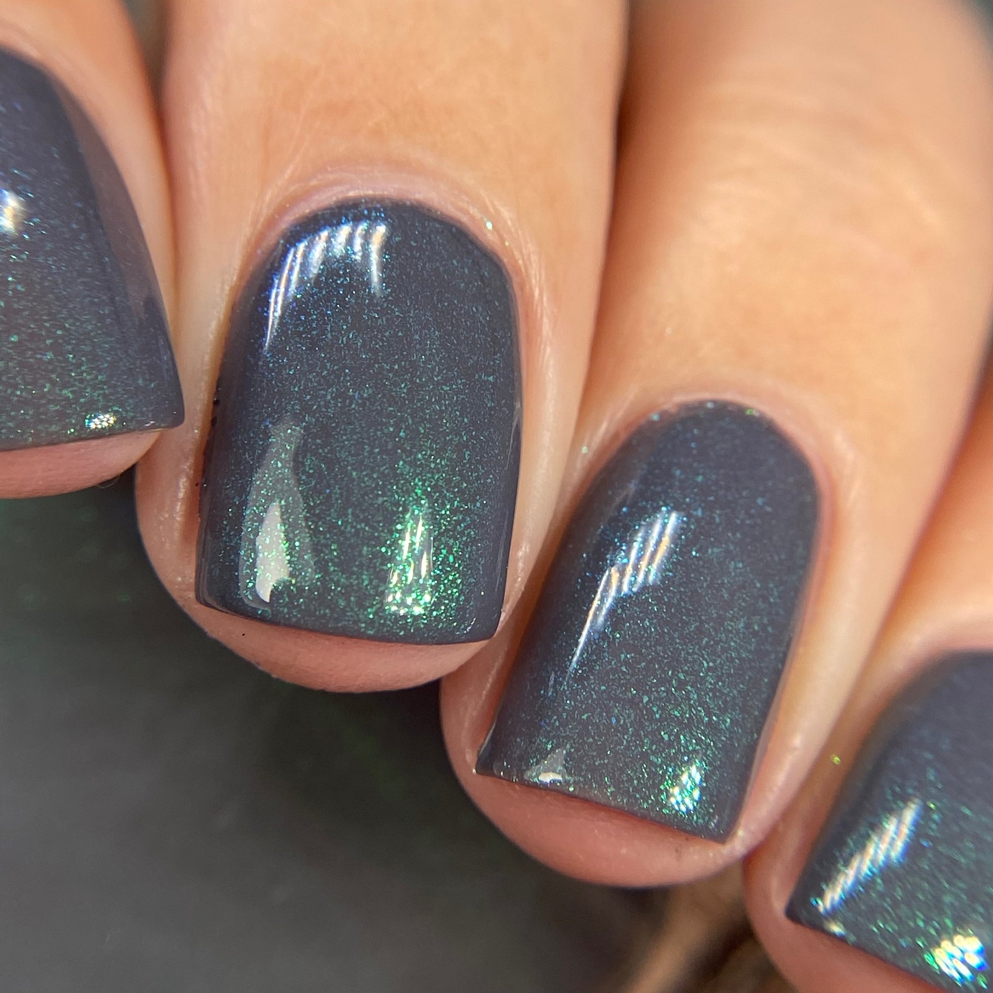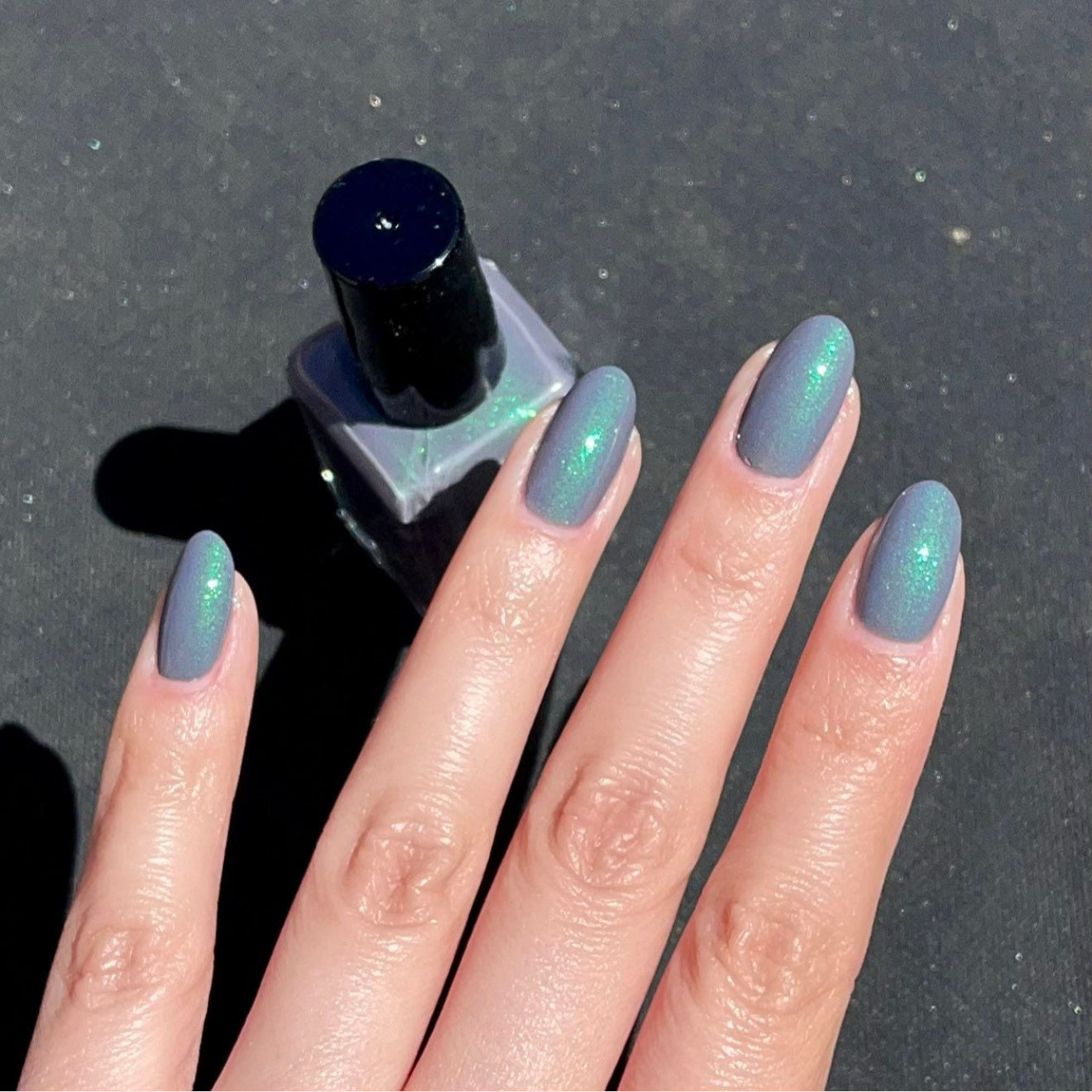 This is a grey shade with red-violet undertones, and bright green iridescent shimmer. The swatches show three coats with Top Glass top coat. .5 fl oz/15ml, 10 Free, hand mixed nail polish.