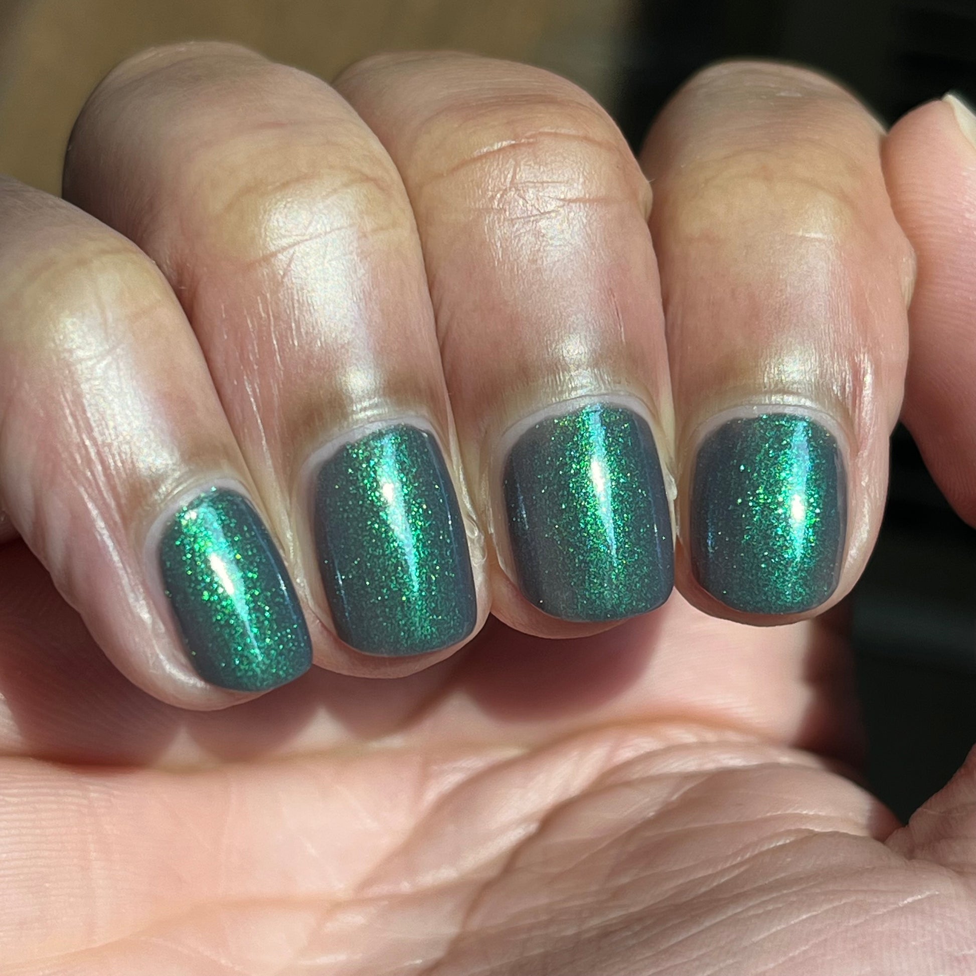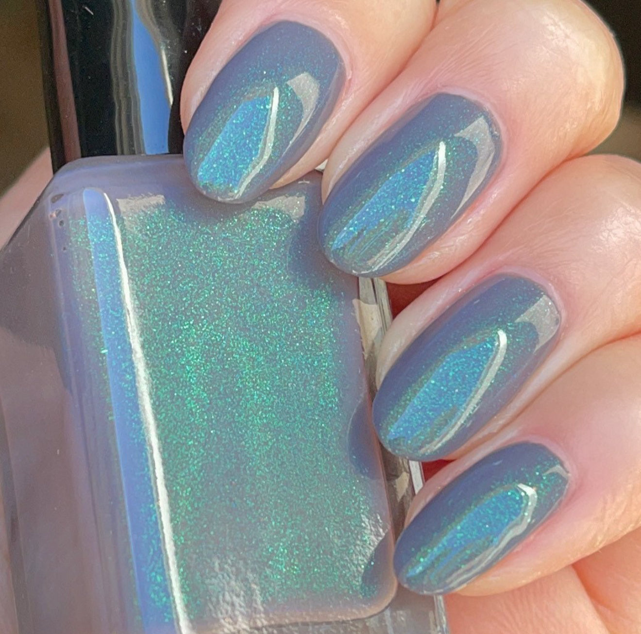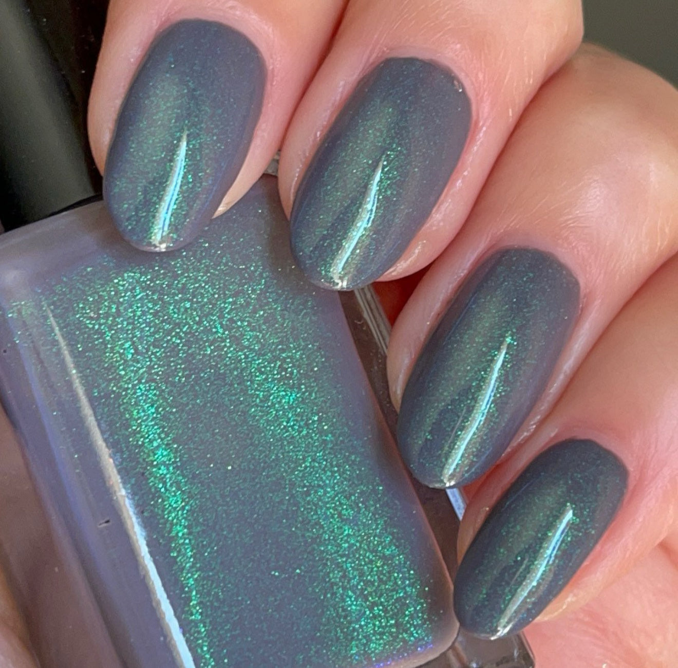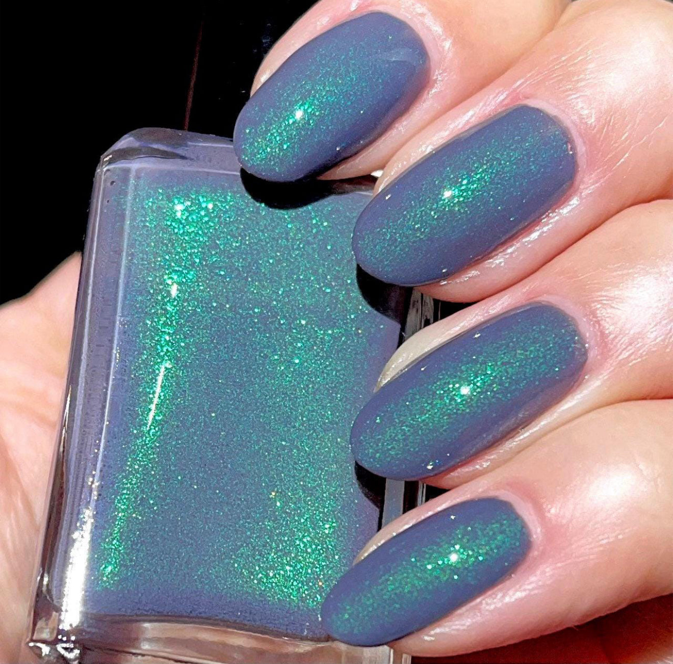 This is a grey shade with red-violet undertones, and bright green iridescent shimmer. The swatches show three coats with Top Glass top coat. .5 fl oz/15ml, 10 Free, hand mixed nail polish.