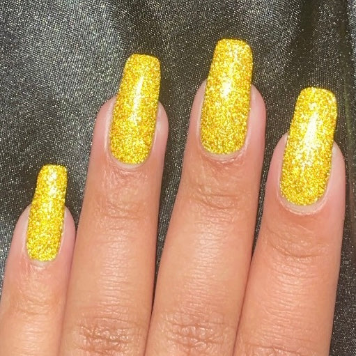 This polish features bright green shimmer and silver reflective glitter in a yellow base. The swatches show three coats with Top Glass top coat. .5 fl oz/15ml, 10 Free, hand mixed nail polish.