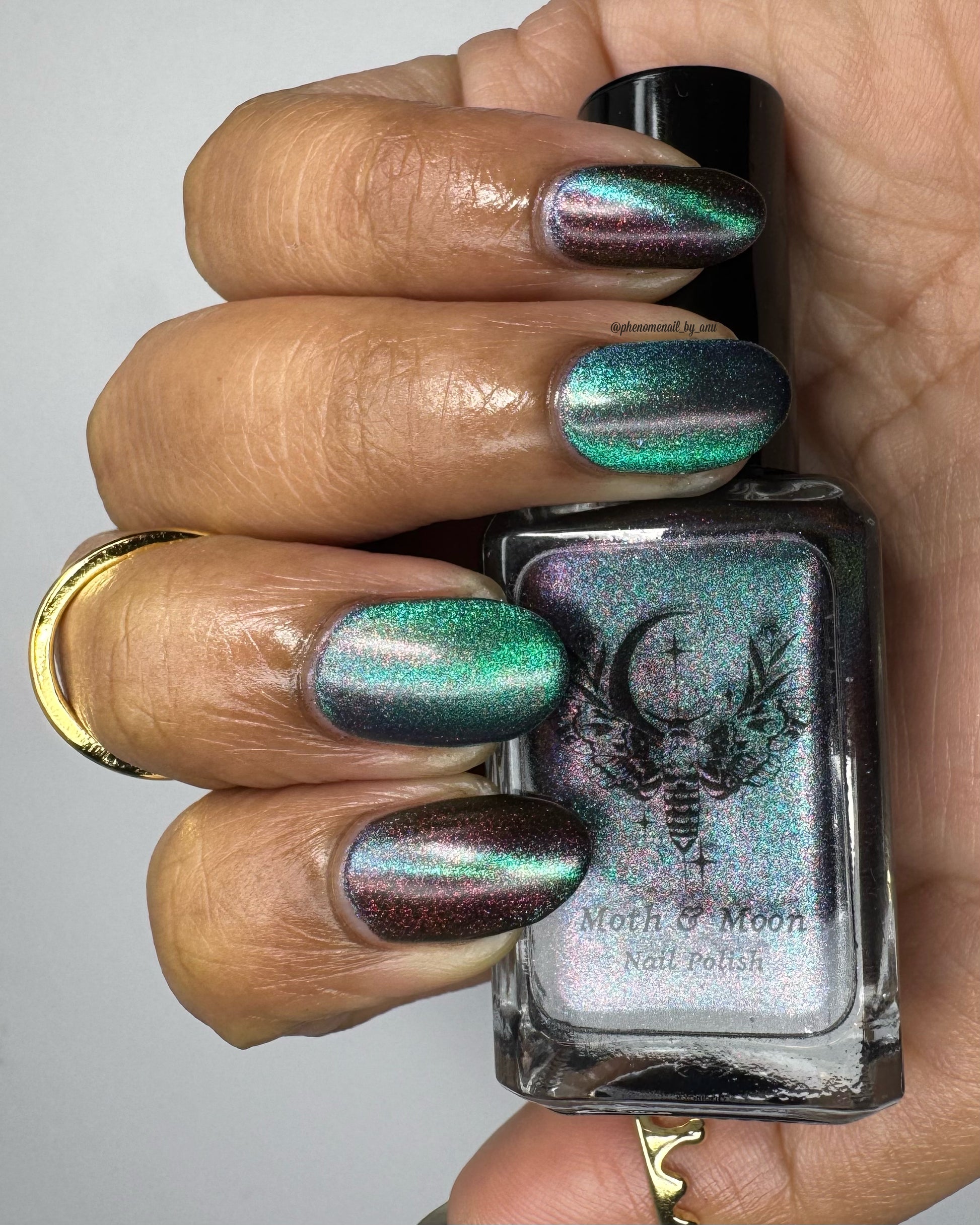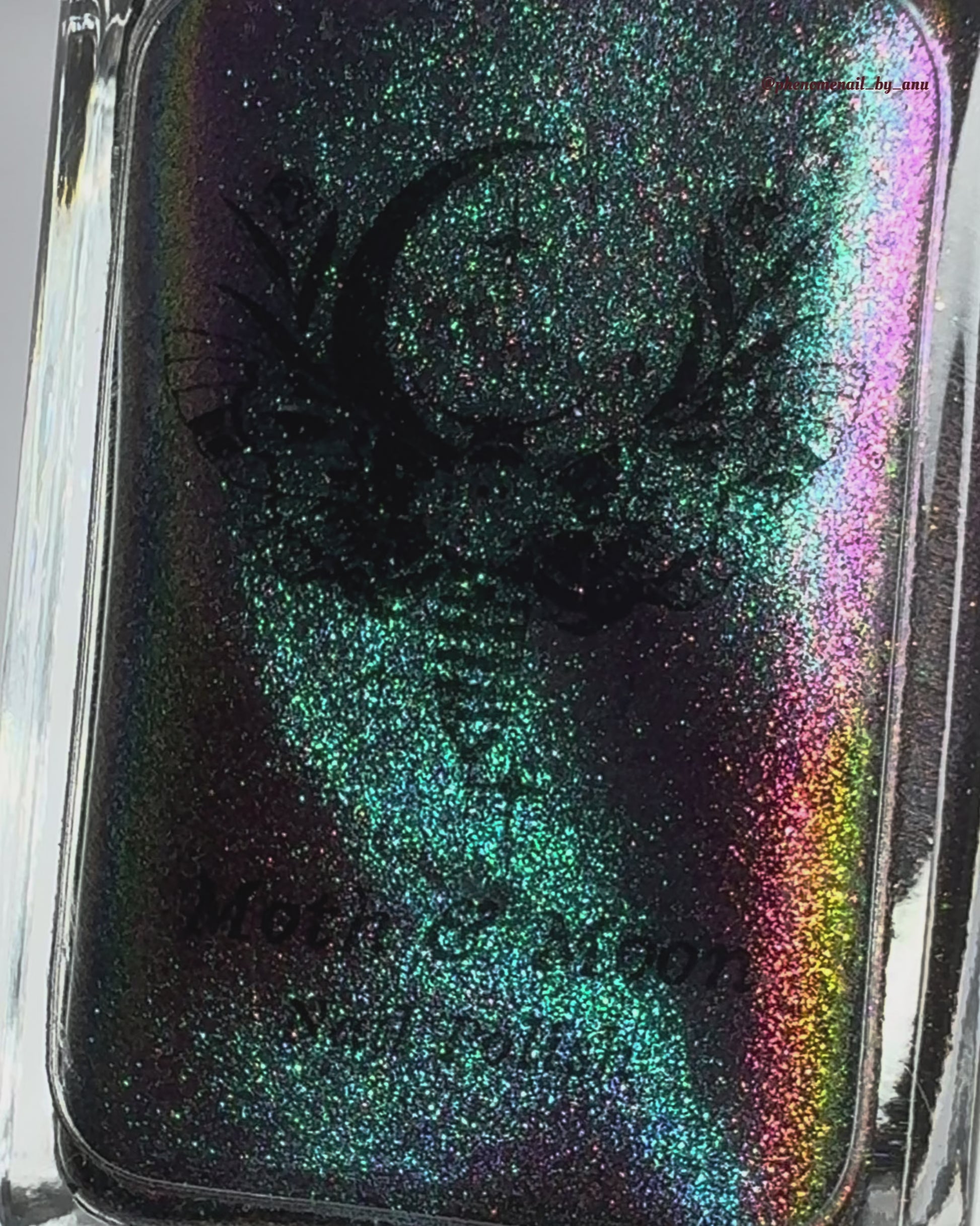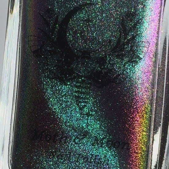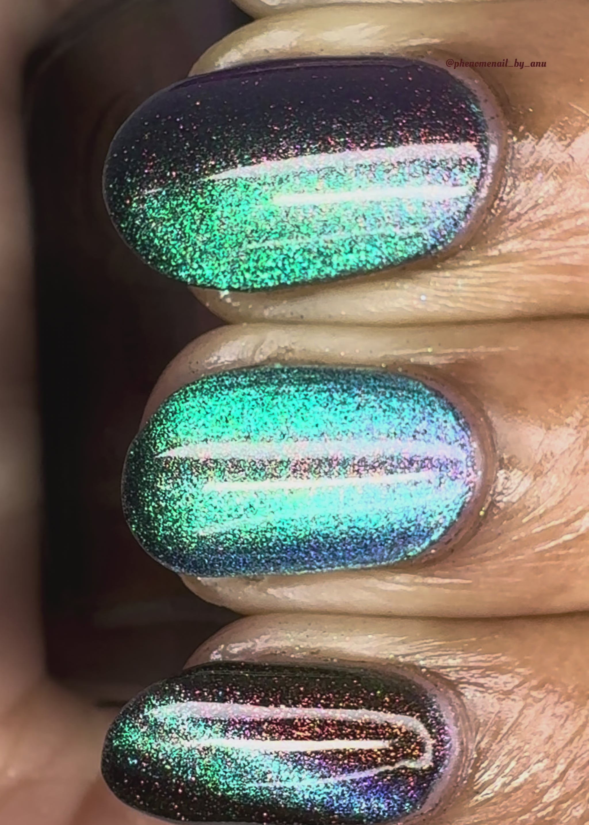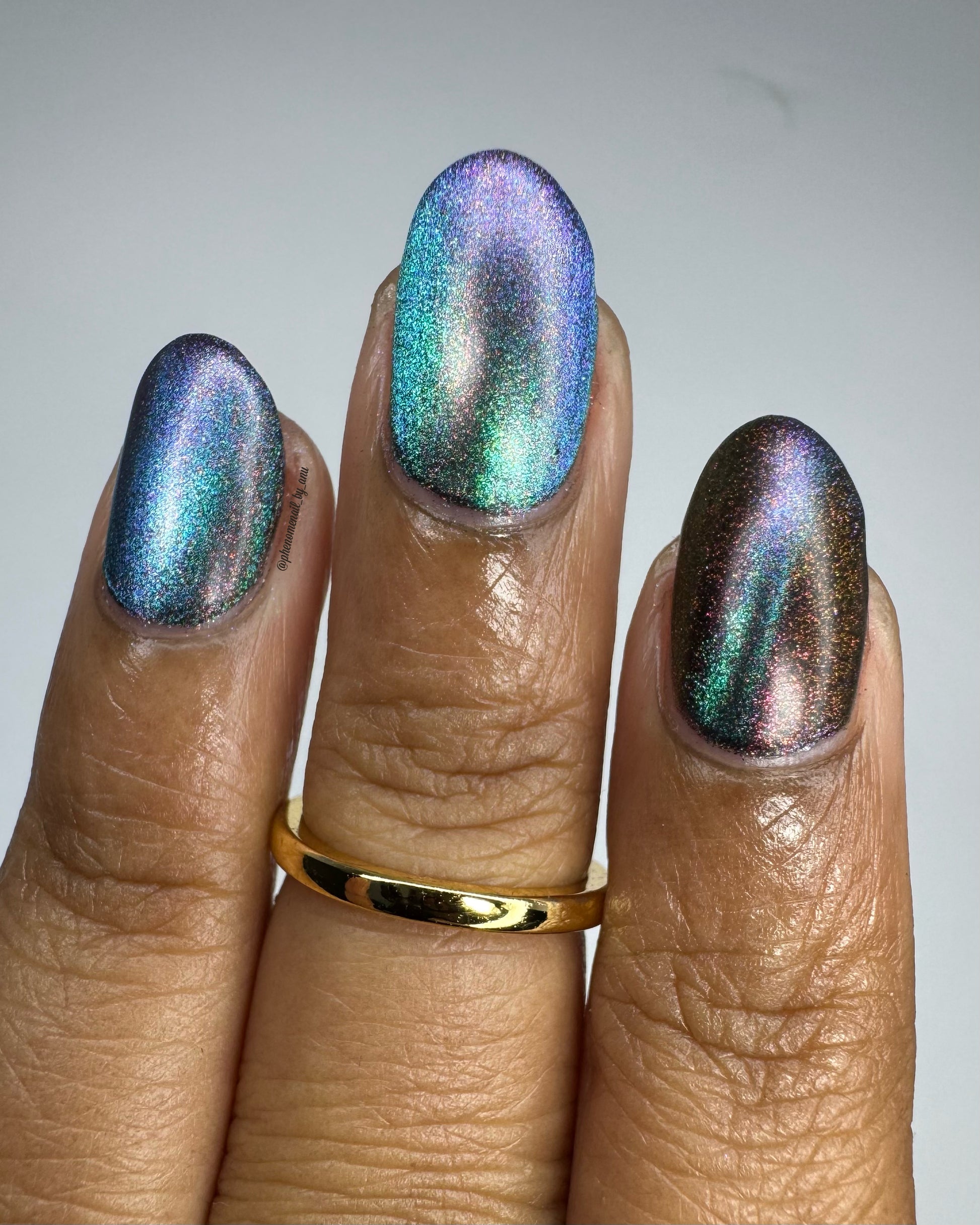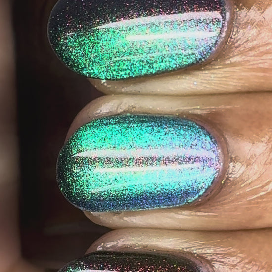 This is a magnetic polish with contrasting multichrome shimmers! This polish will look different in various lighting situations and angles. The swatches show three coats with velvet and cat eye effects, and Top Glass top coat. .5 fl oz/15ml, 10 Free, hand mixed nail polish.
