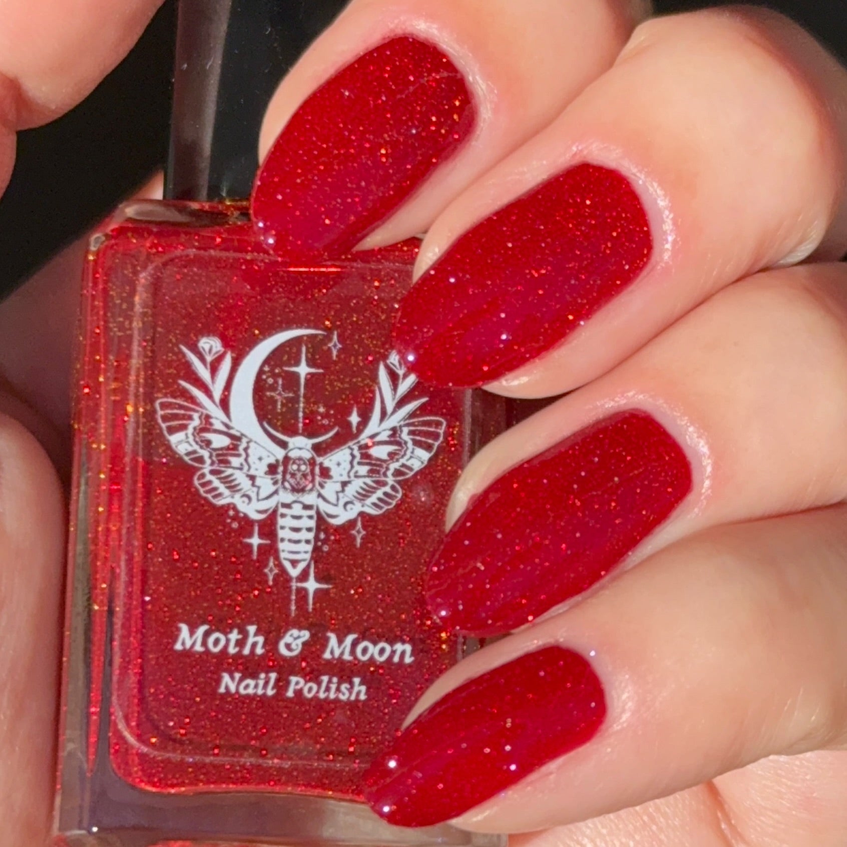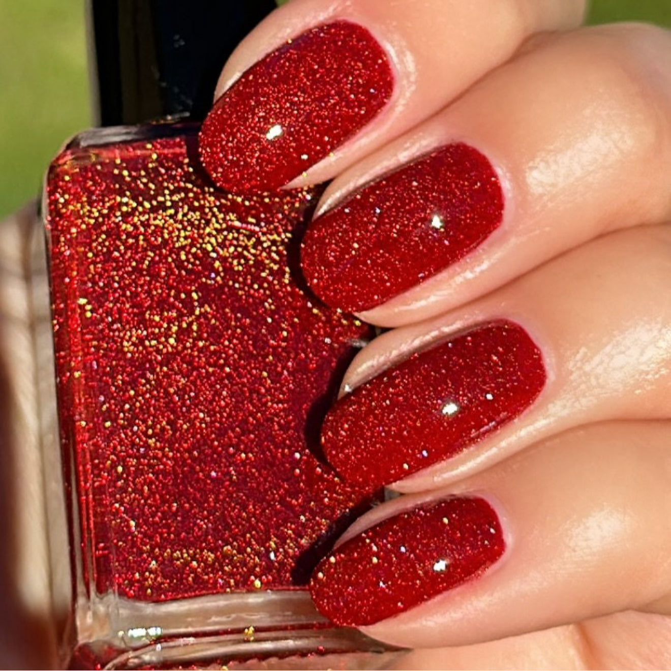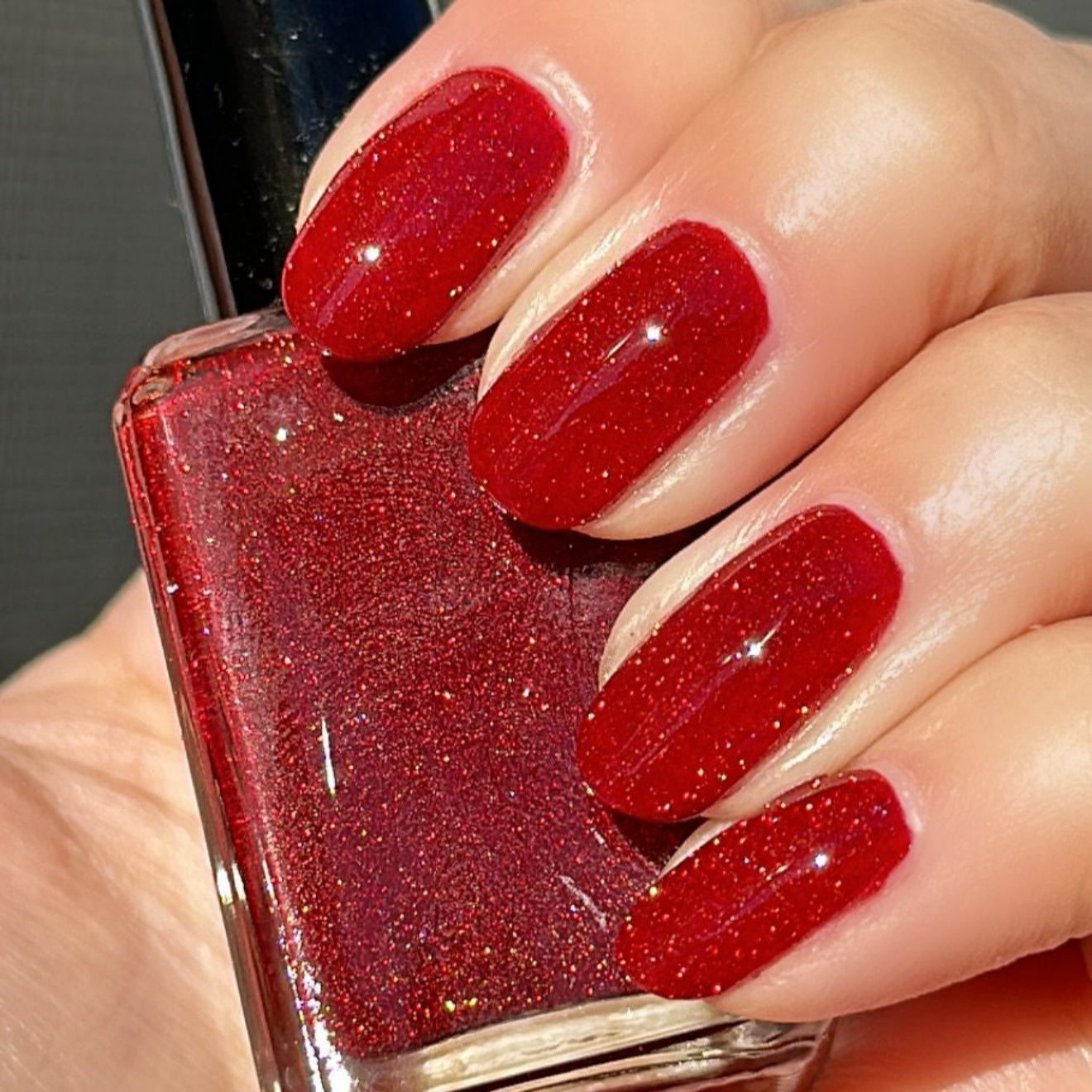 This is a holiday red shade with gold reflective glitter throughout. The gold will flash when hit with direct light. The swatches show three coats with Top Glass top coat. .5 fl oz/15ml, 10 Free, hand mixed nail polish.