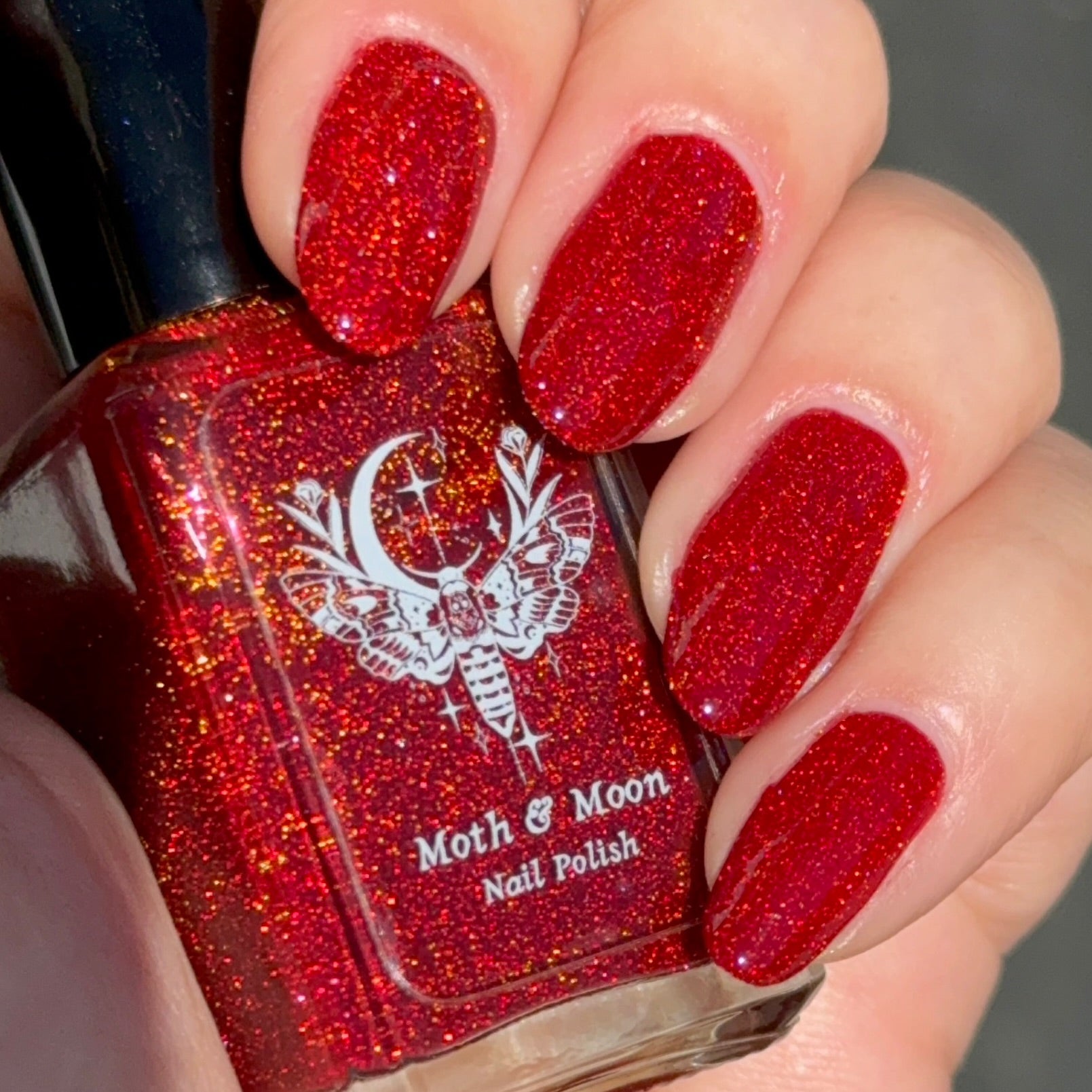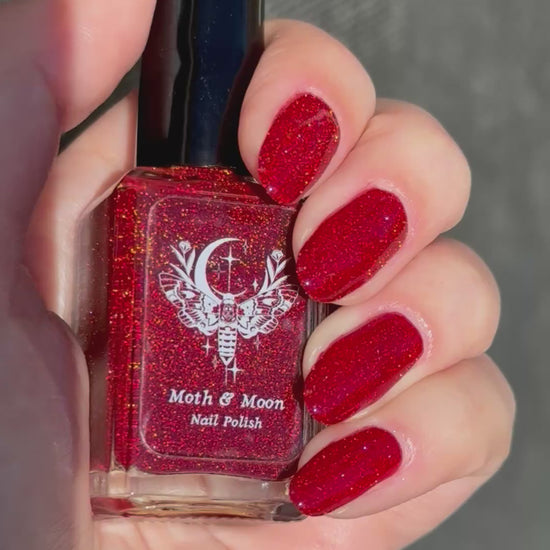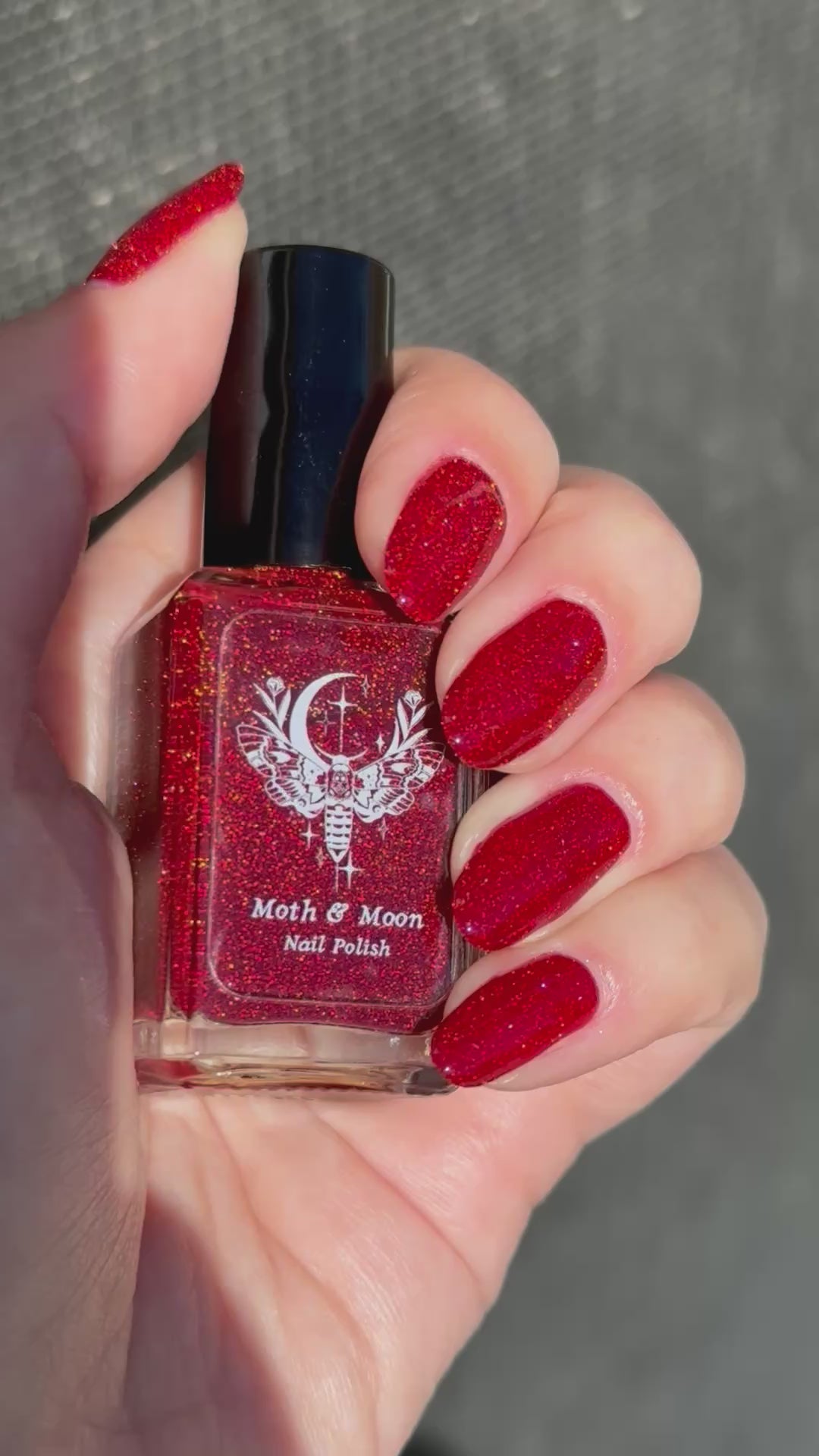 This is a holiday red shade with gold reflective glitter throughout. The gold will flash when hit with direct light. The swatches show three coats with Top Glass top coat. .5 fl oz/15ml, 10 Free, hand mixed nail polish.