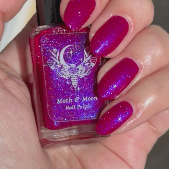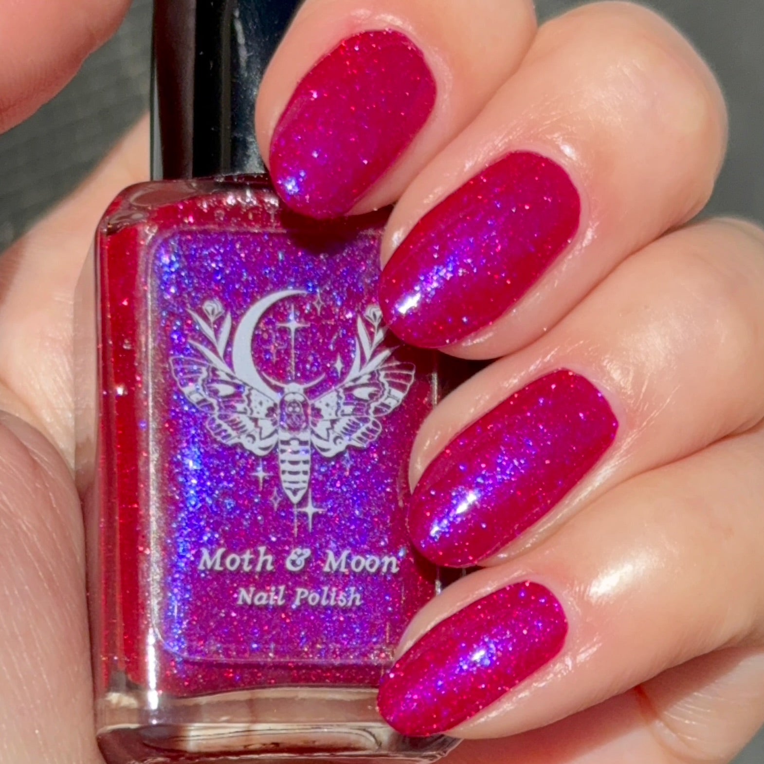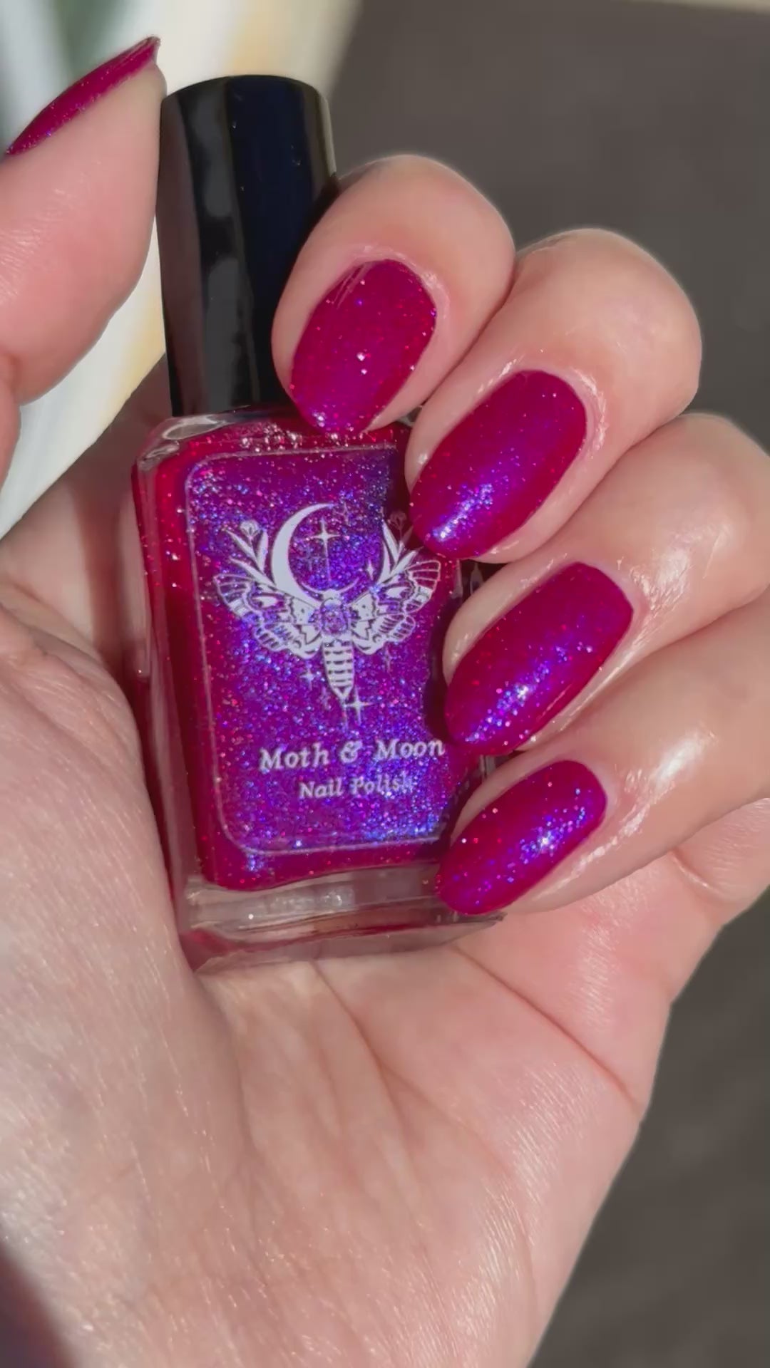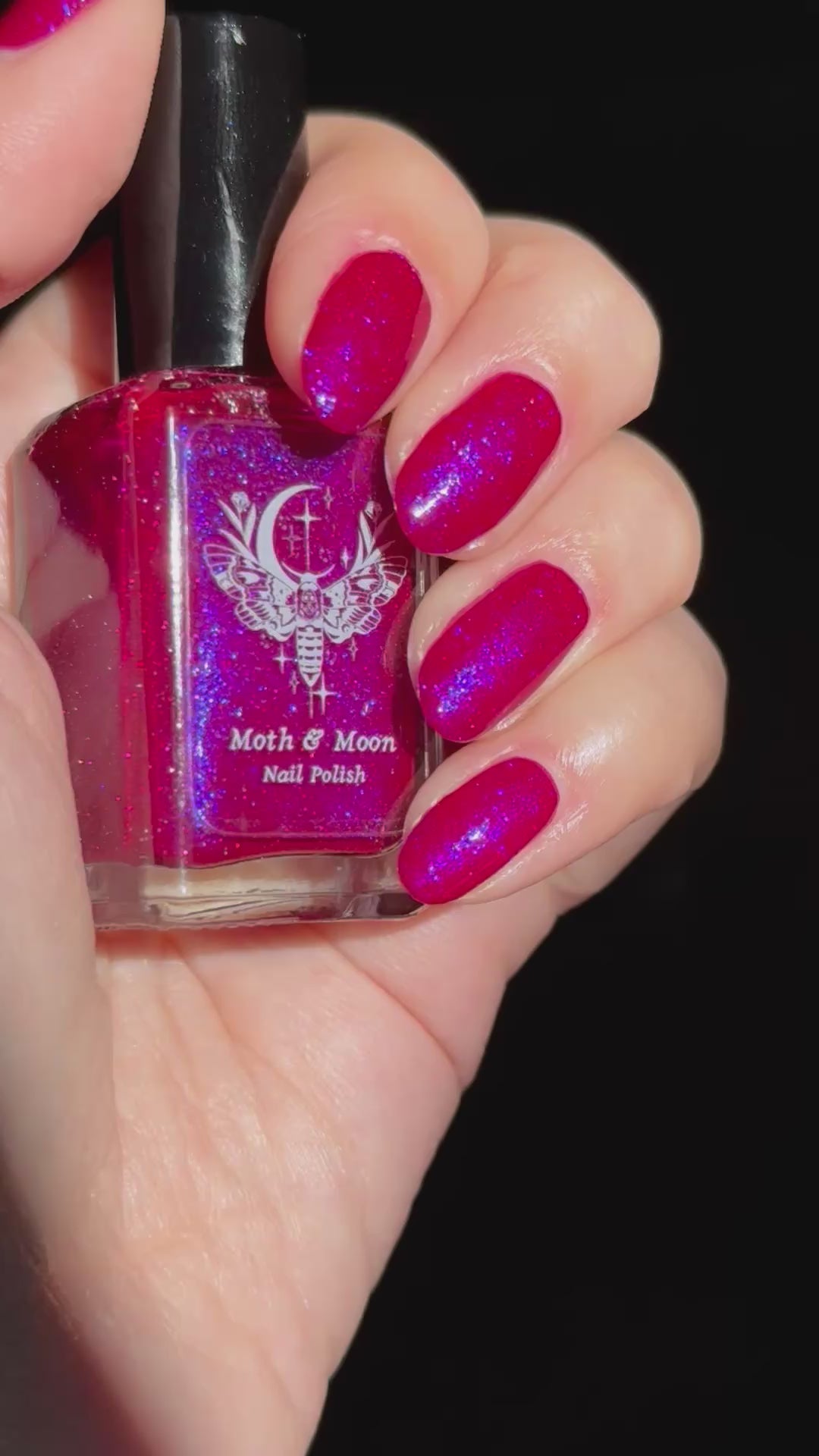 This is a deep magenta shade with blue iridescent shimmers and silver reflective glitter.