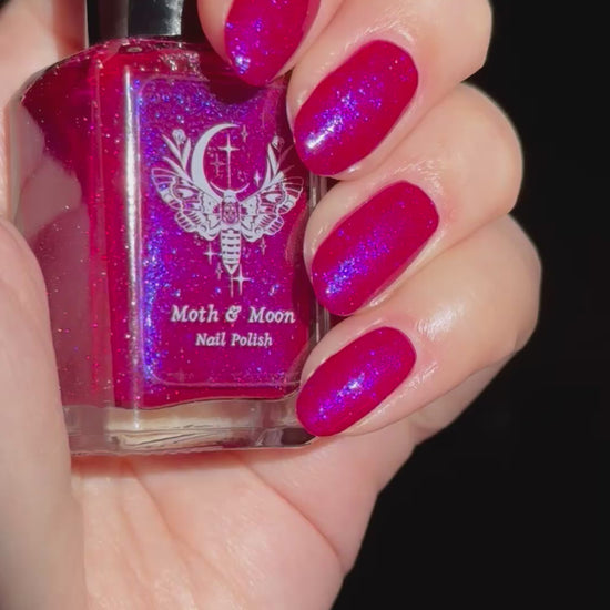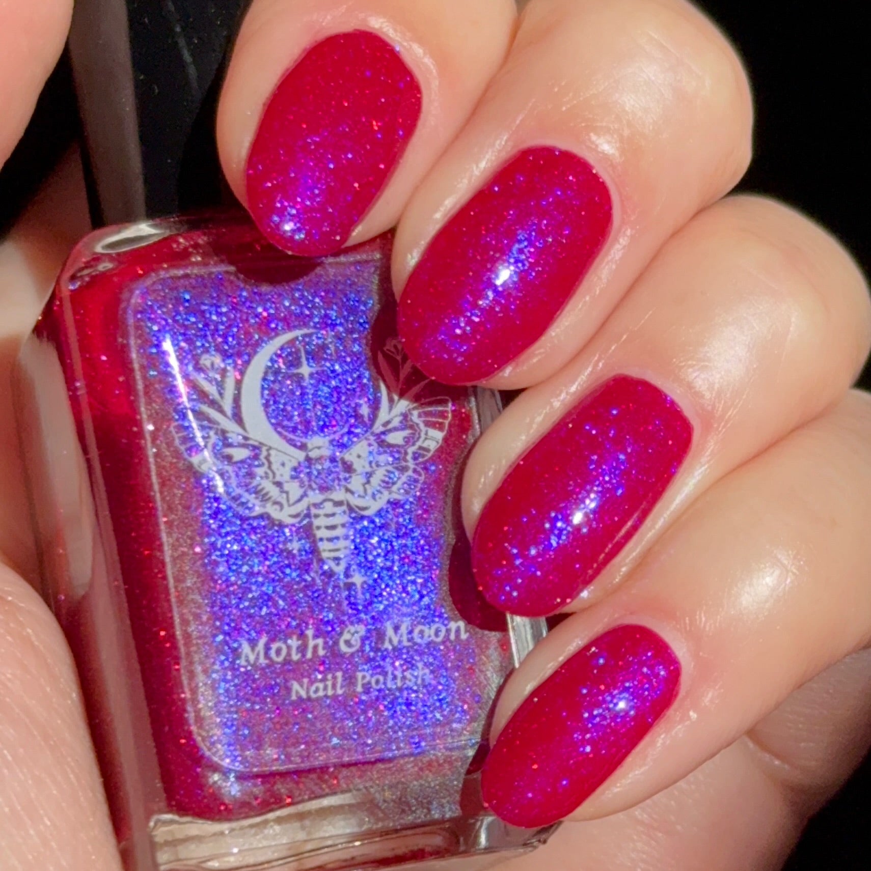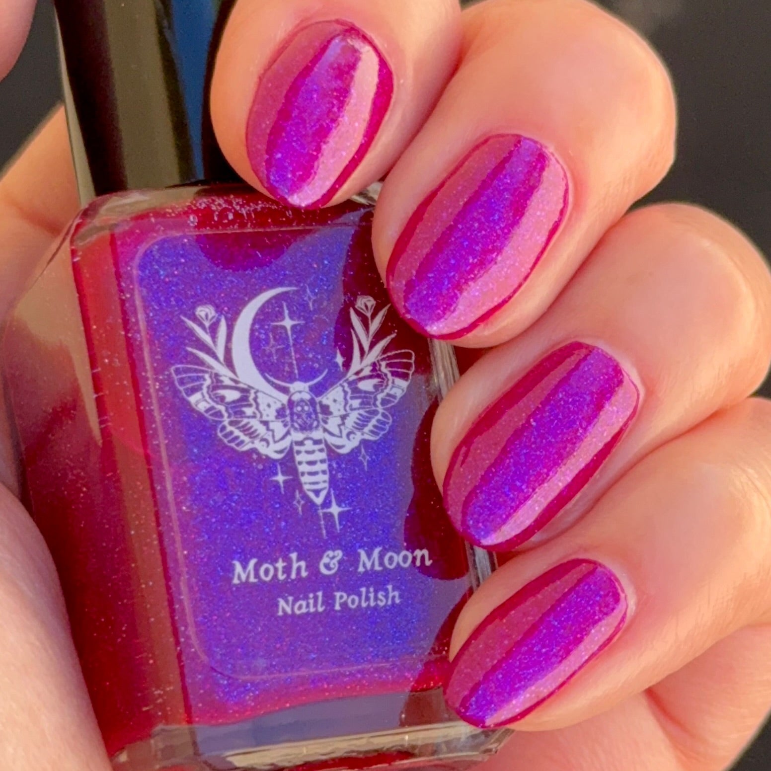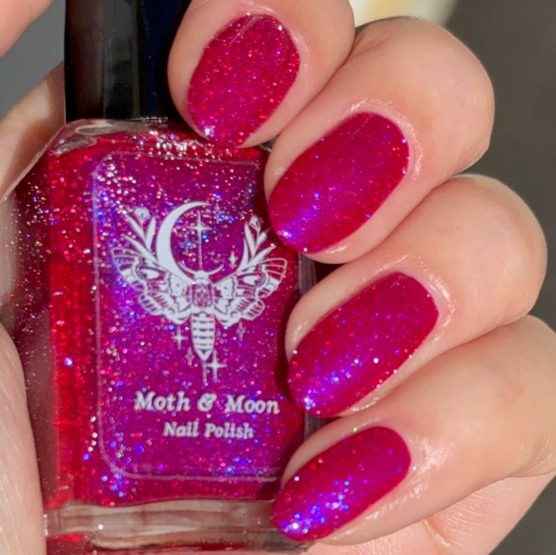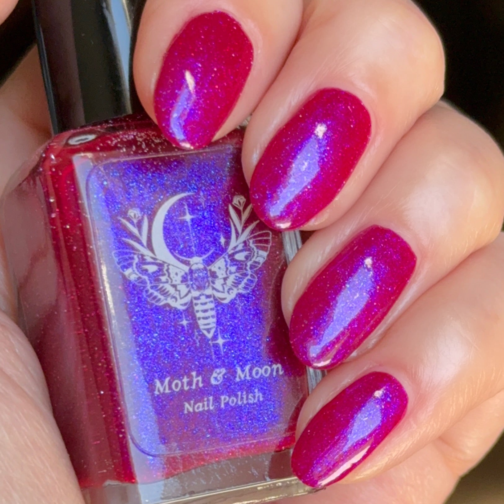 This is a deep magenta shade with blue iridescent shimmers and silver reflective glitter.