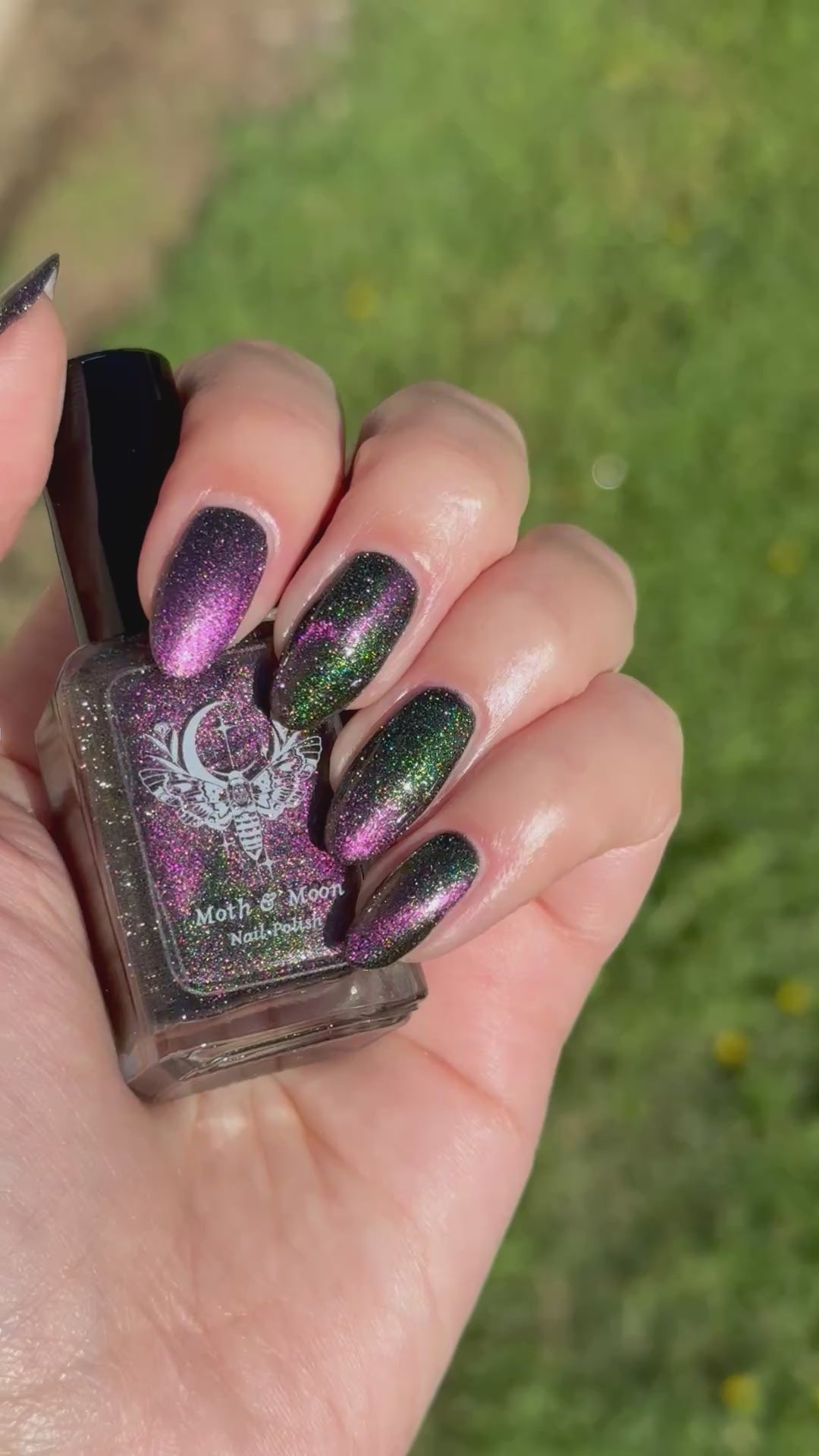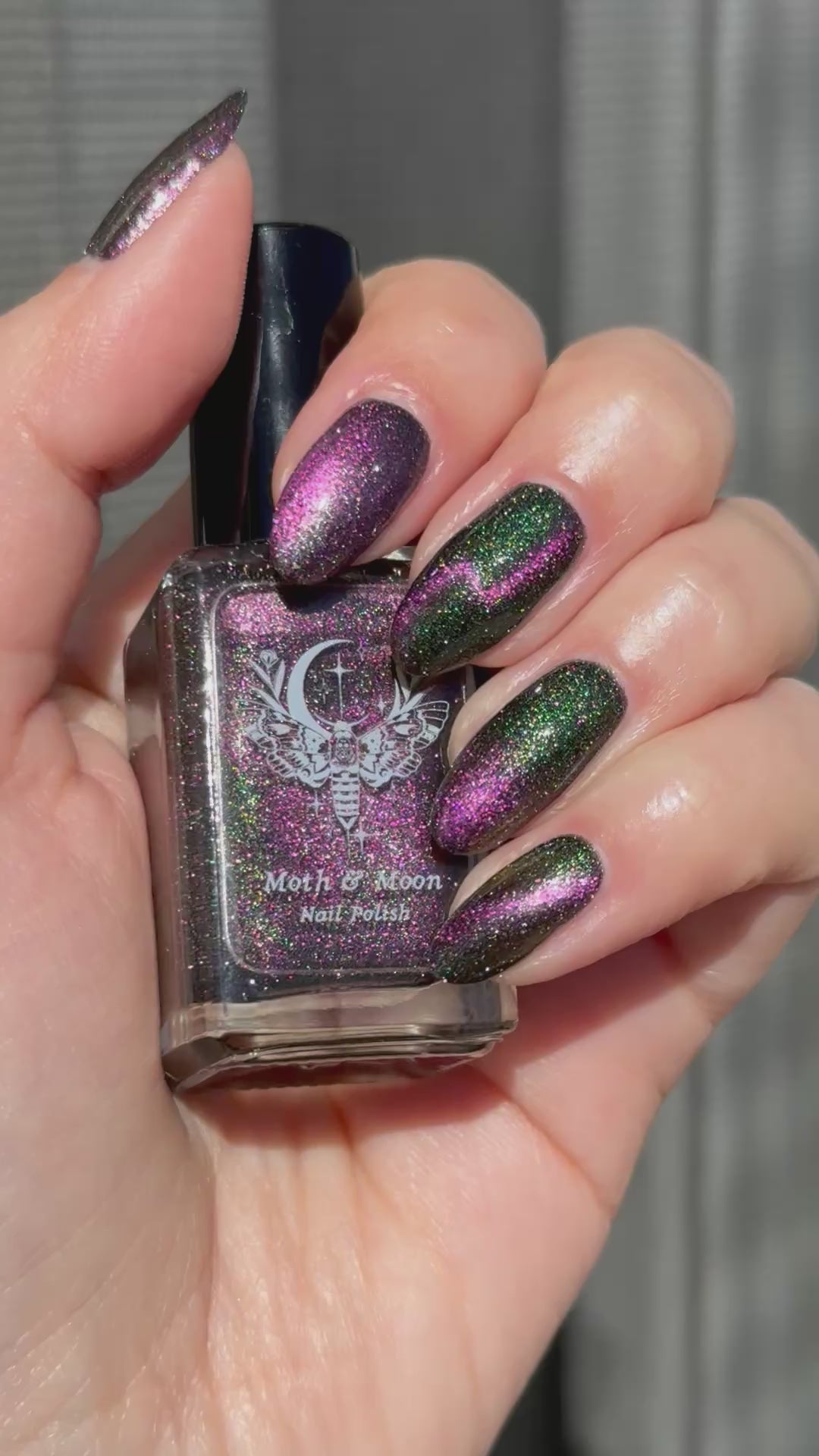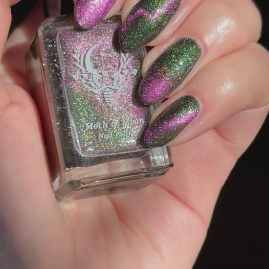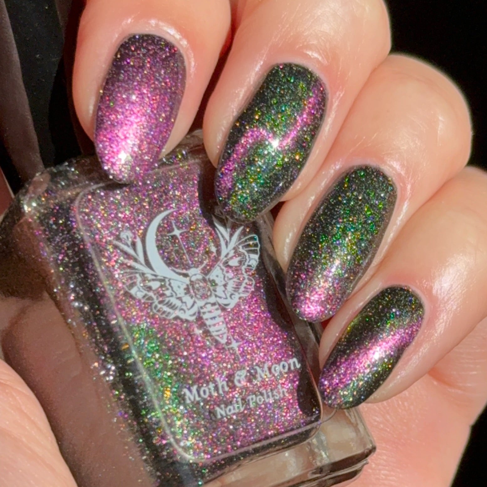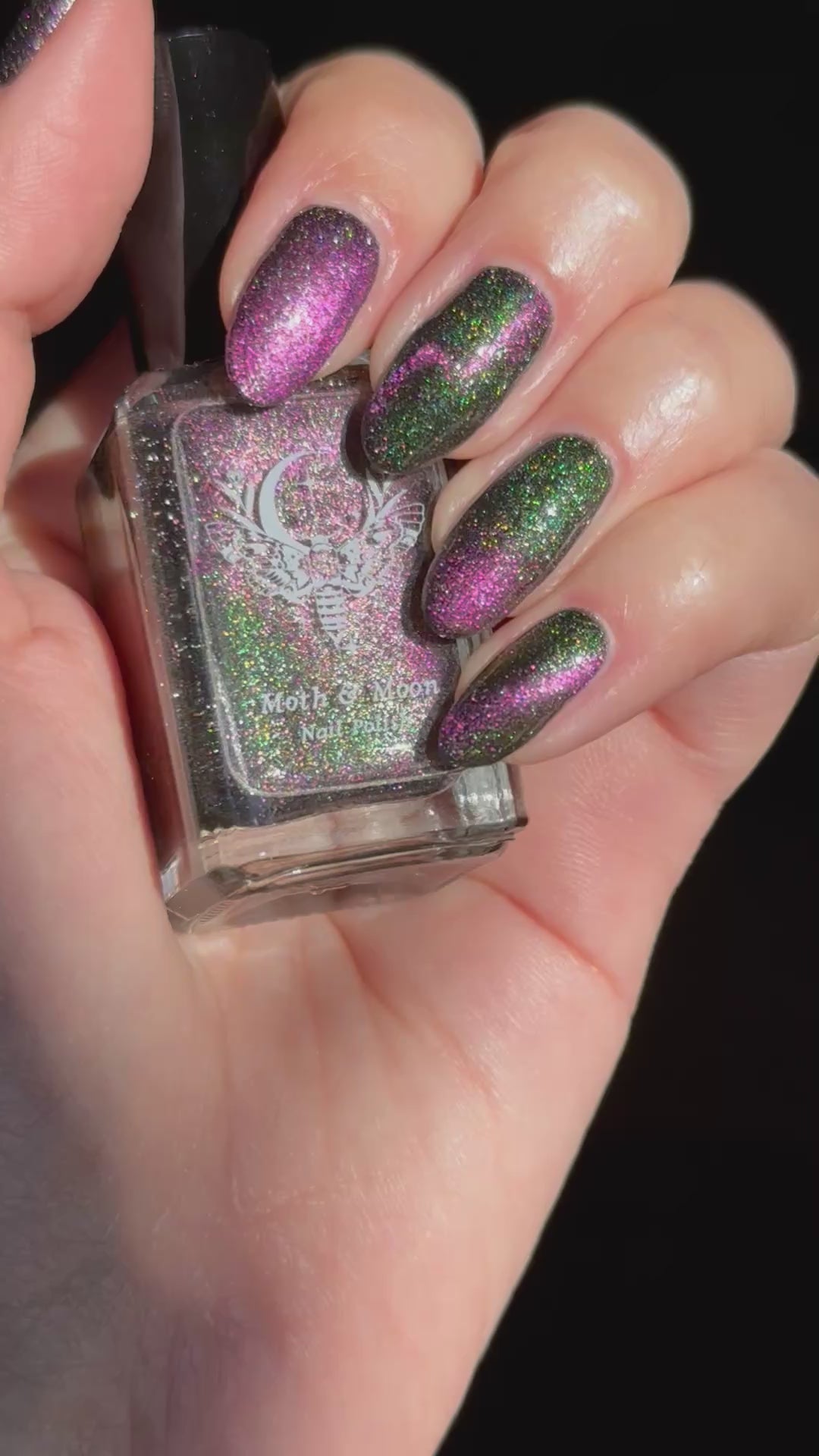 Magenta duochrome magnetic, green duochrome shimmers, and reflective glitter in a black tinted base.