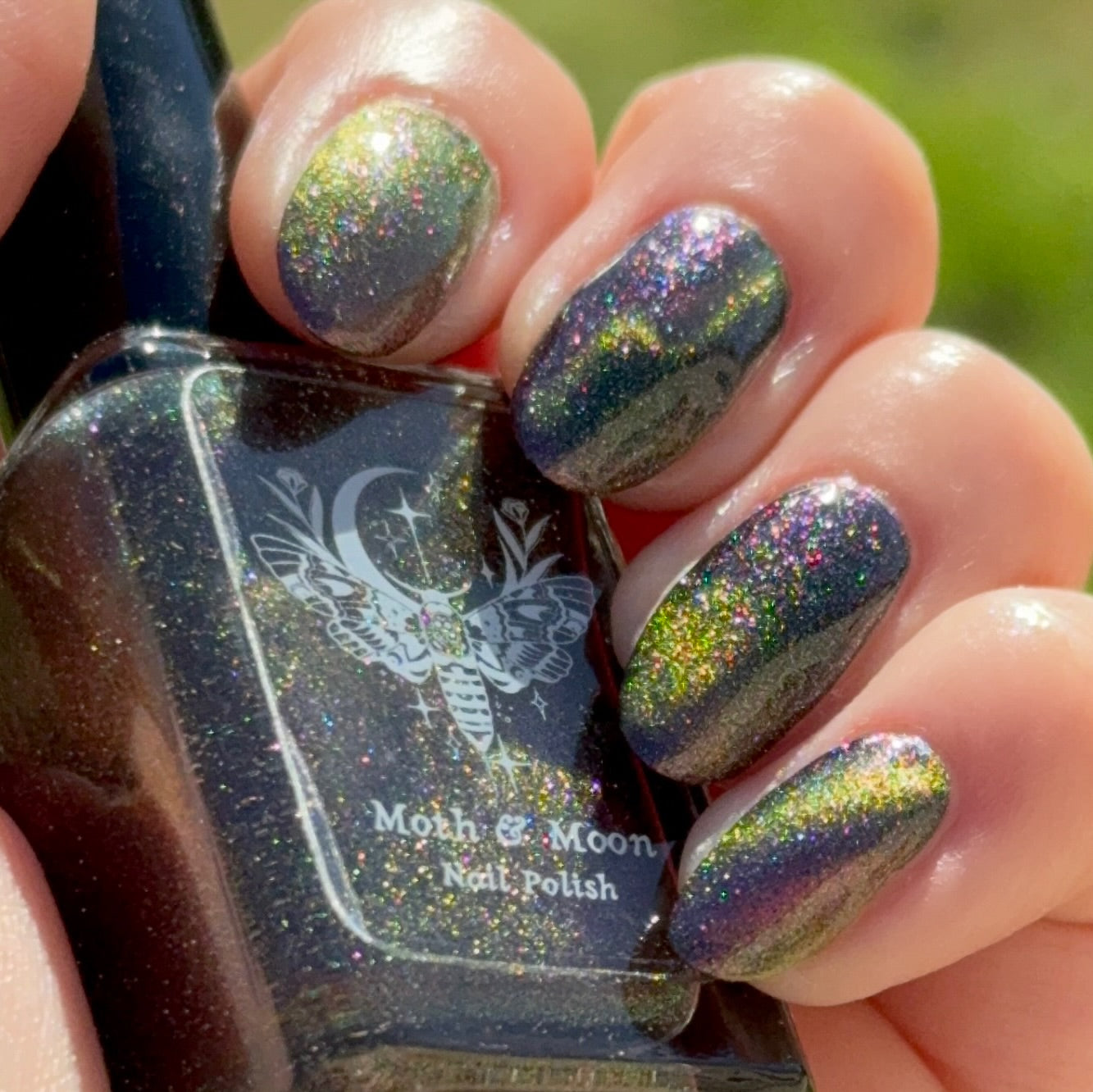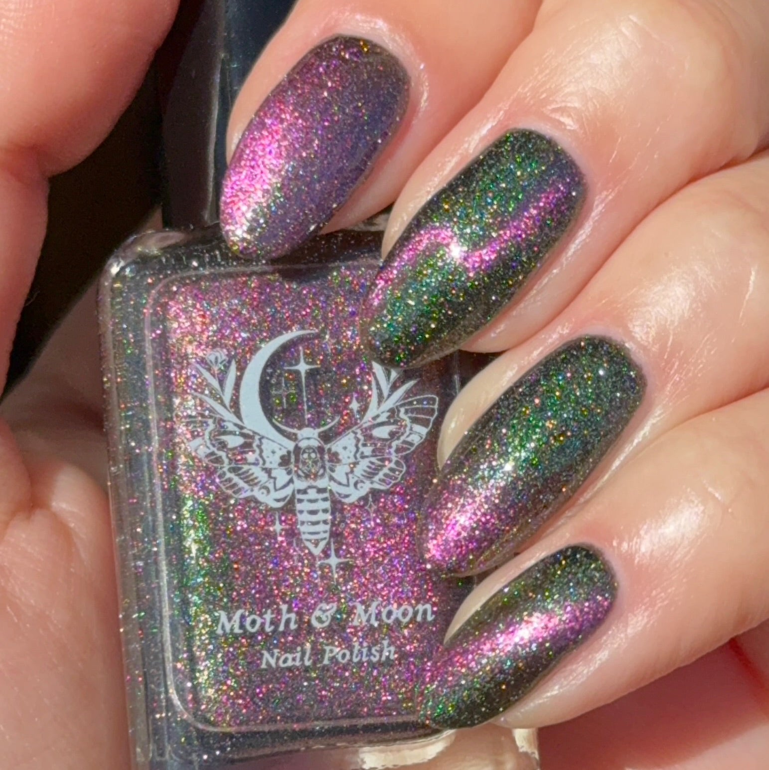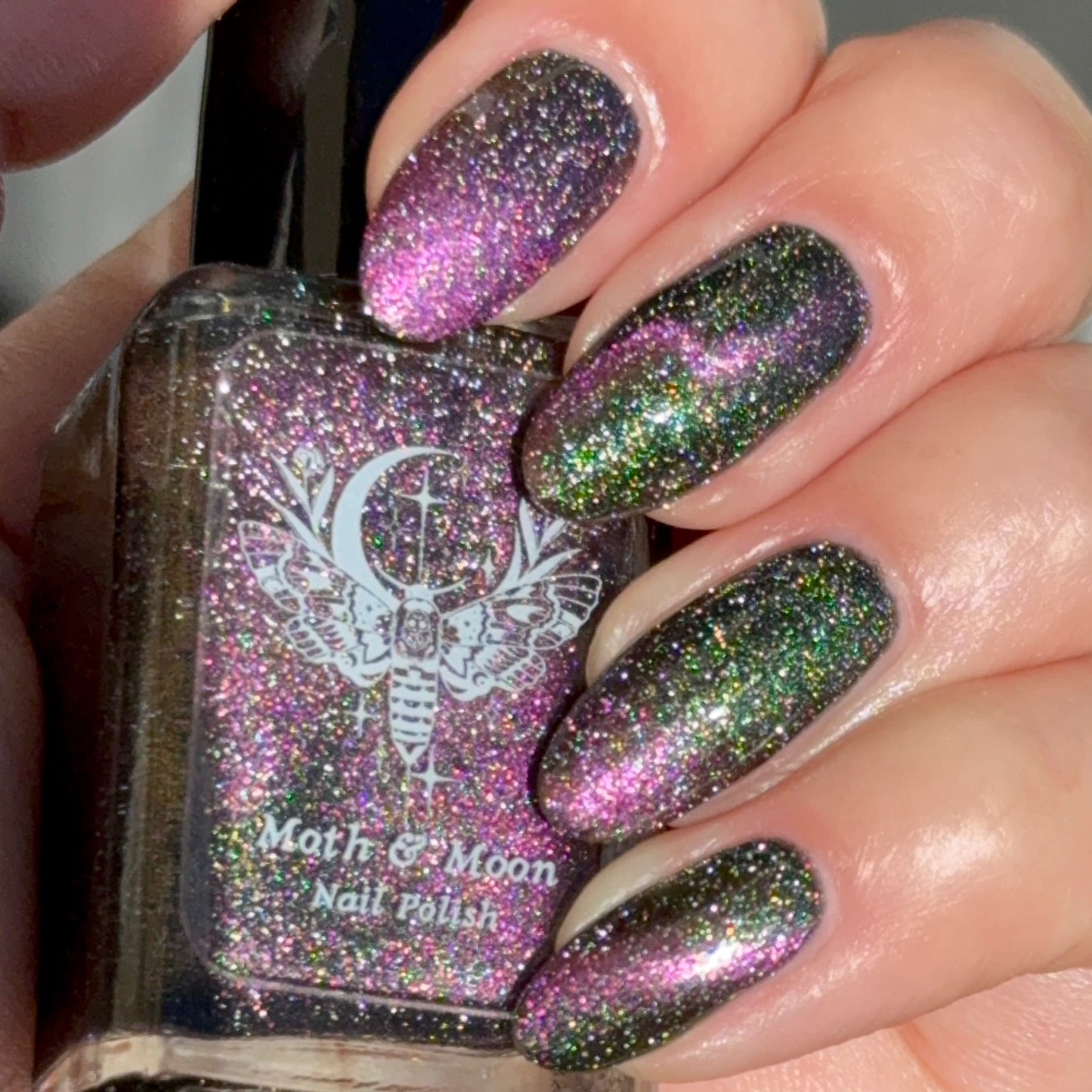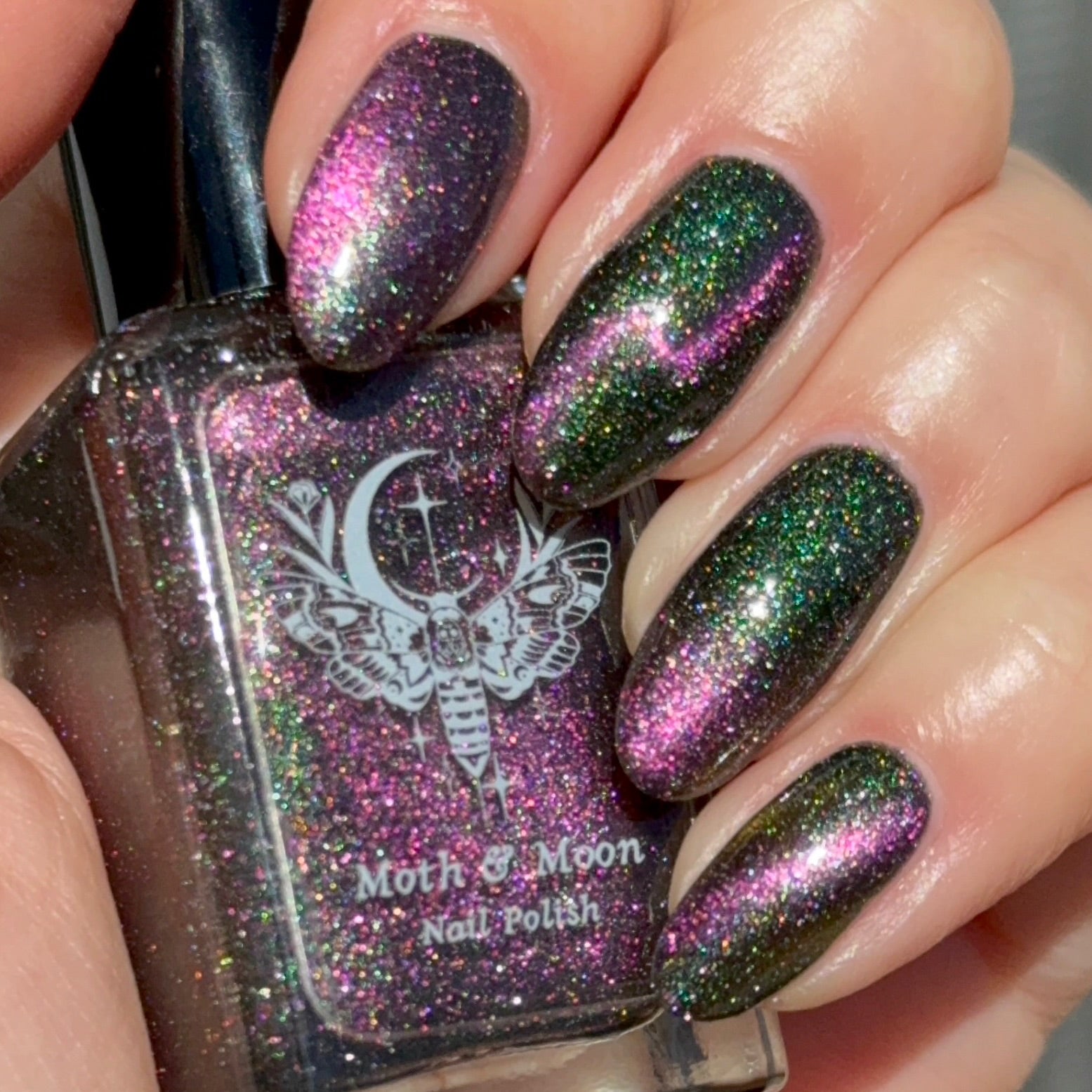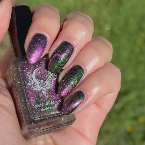 Magenta duochrome magnetic, green duochrome shimmers, and reflective glitter in a black tinted base.