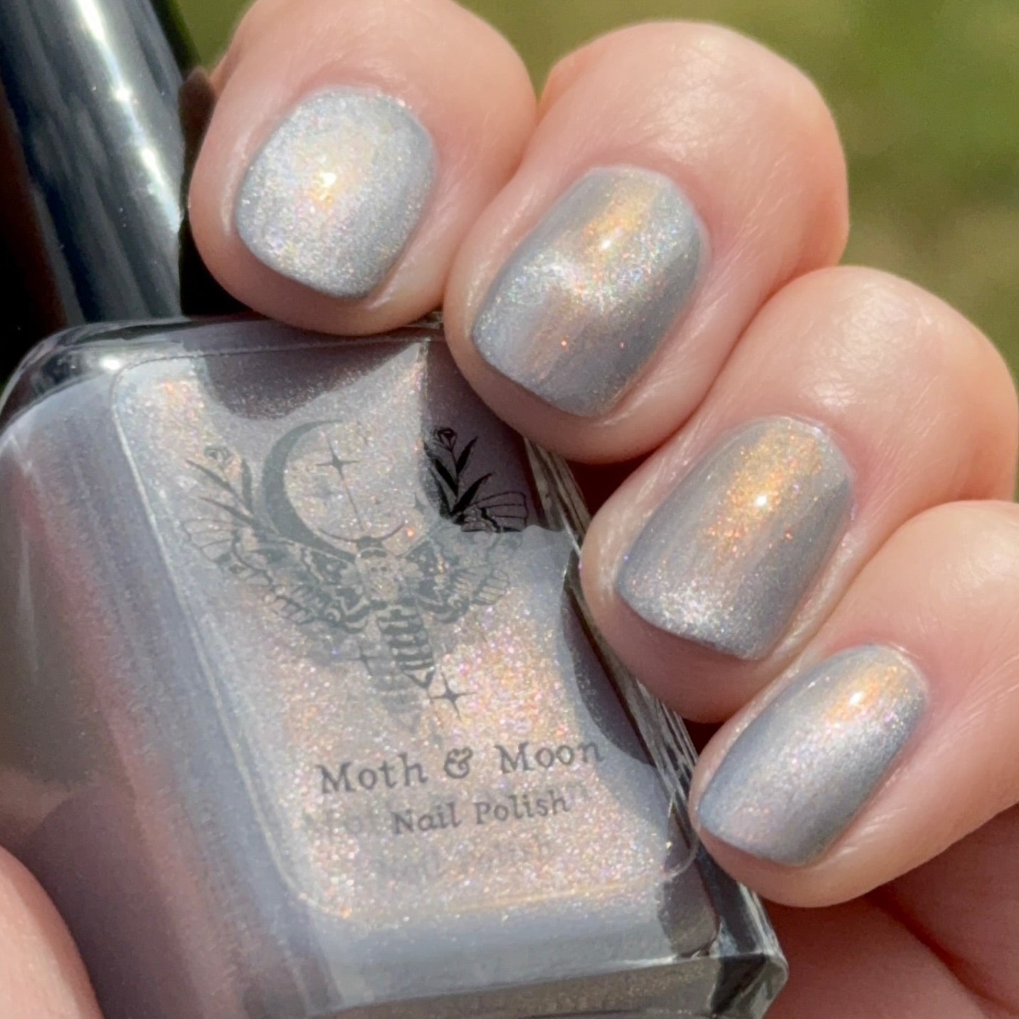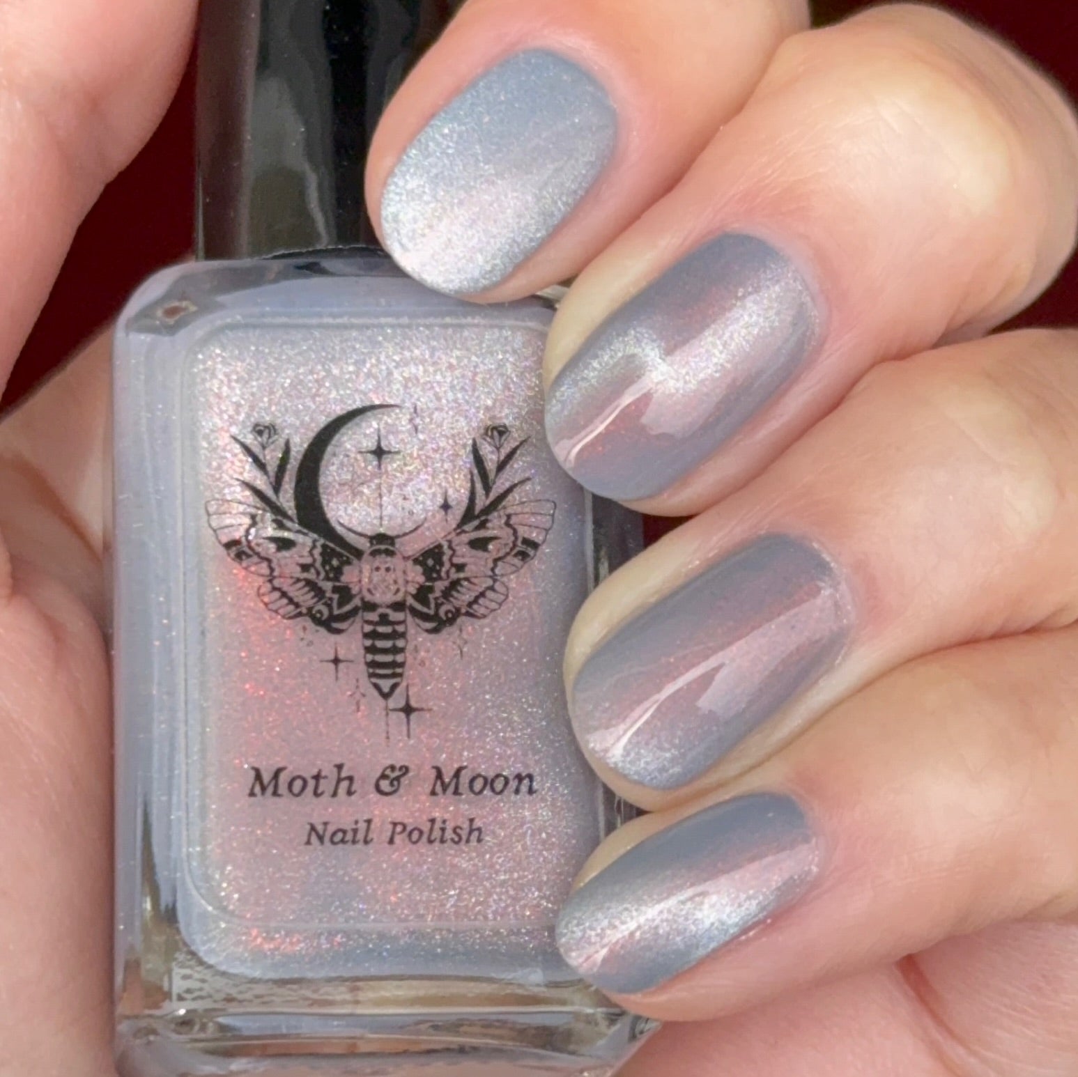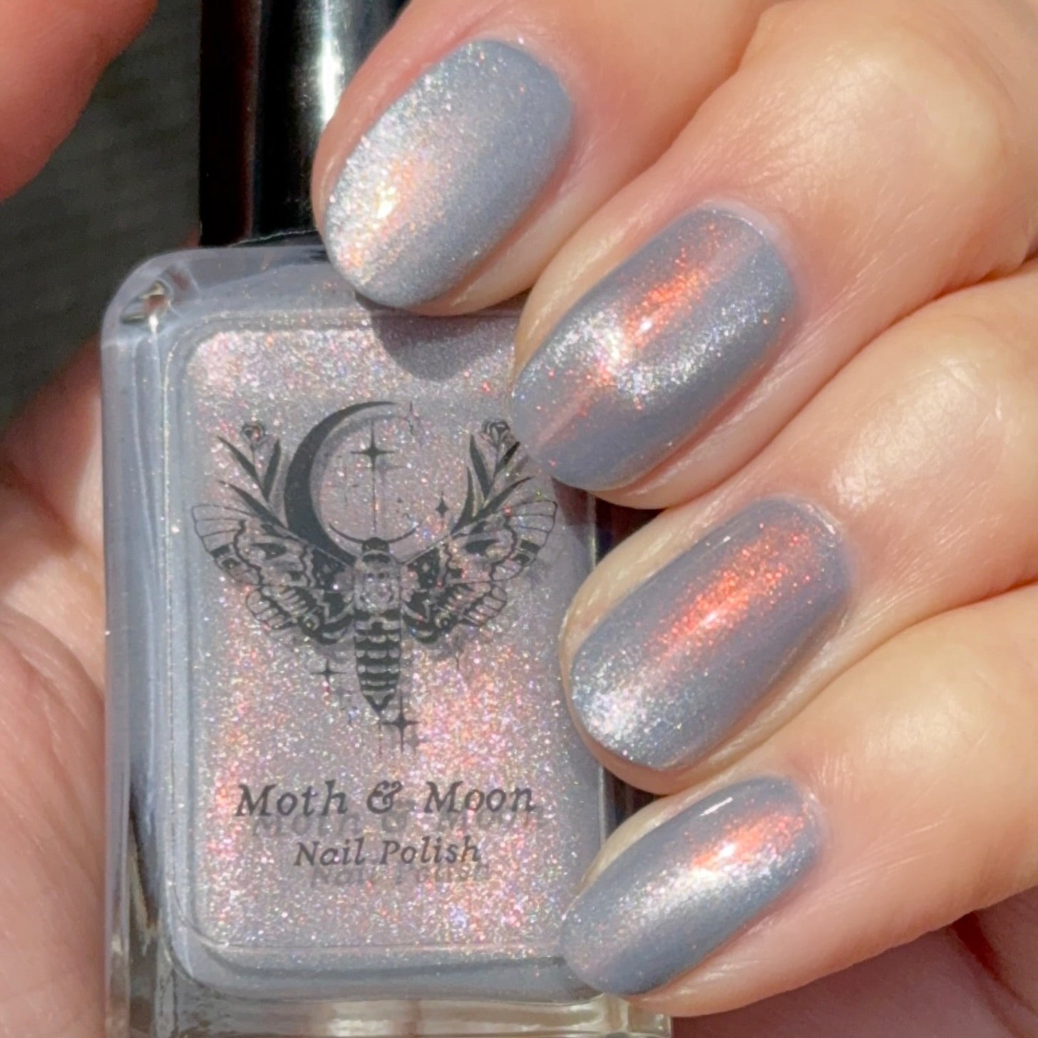 Cool grey with copper and red iridescent shimmers, with silver magnetic pigment.