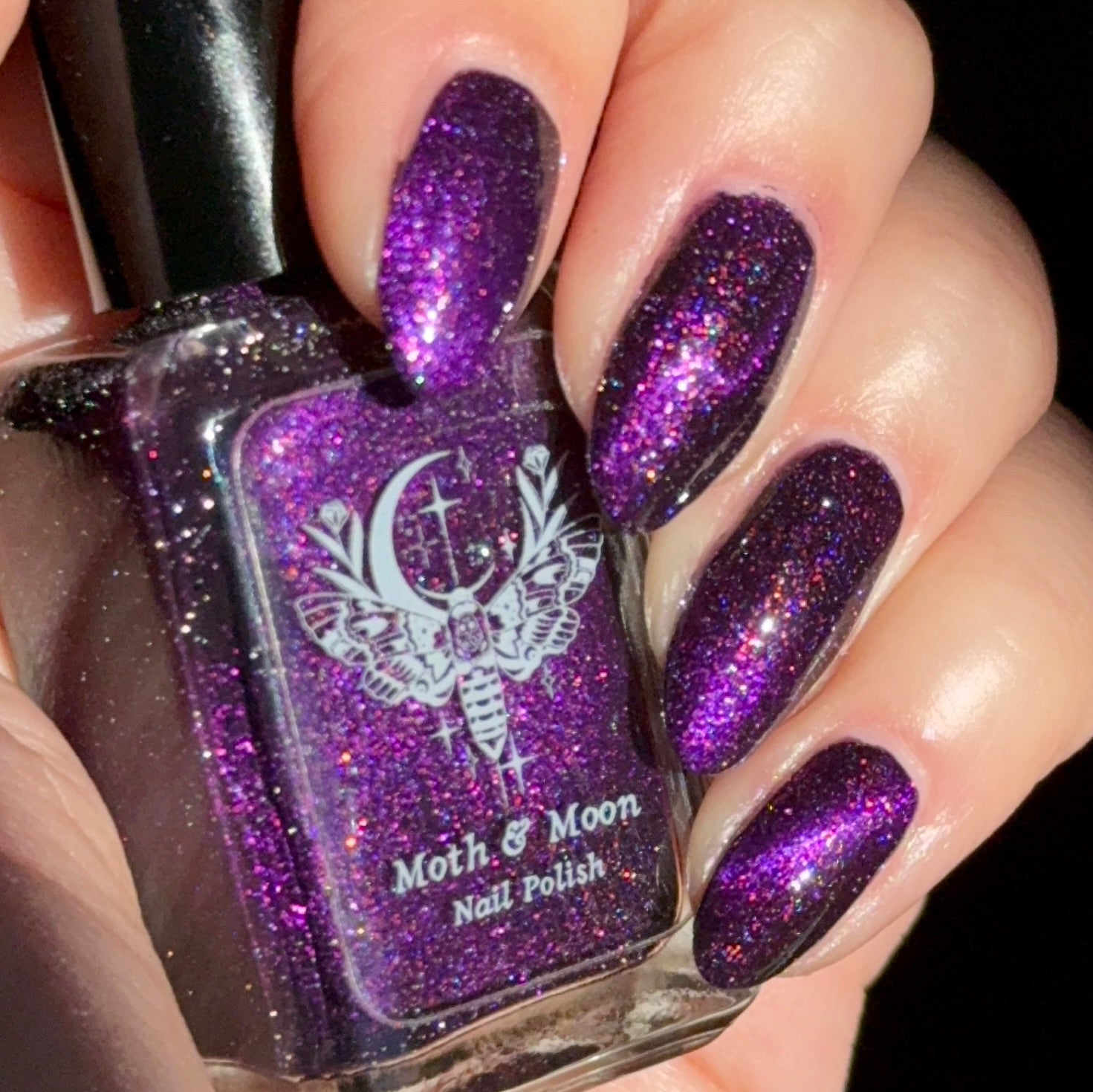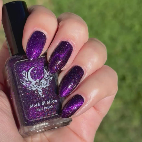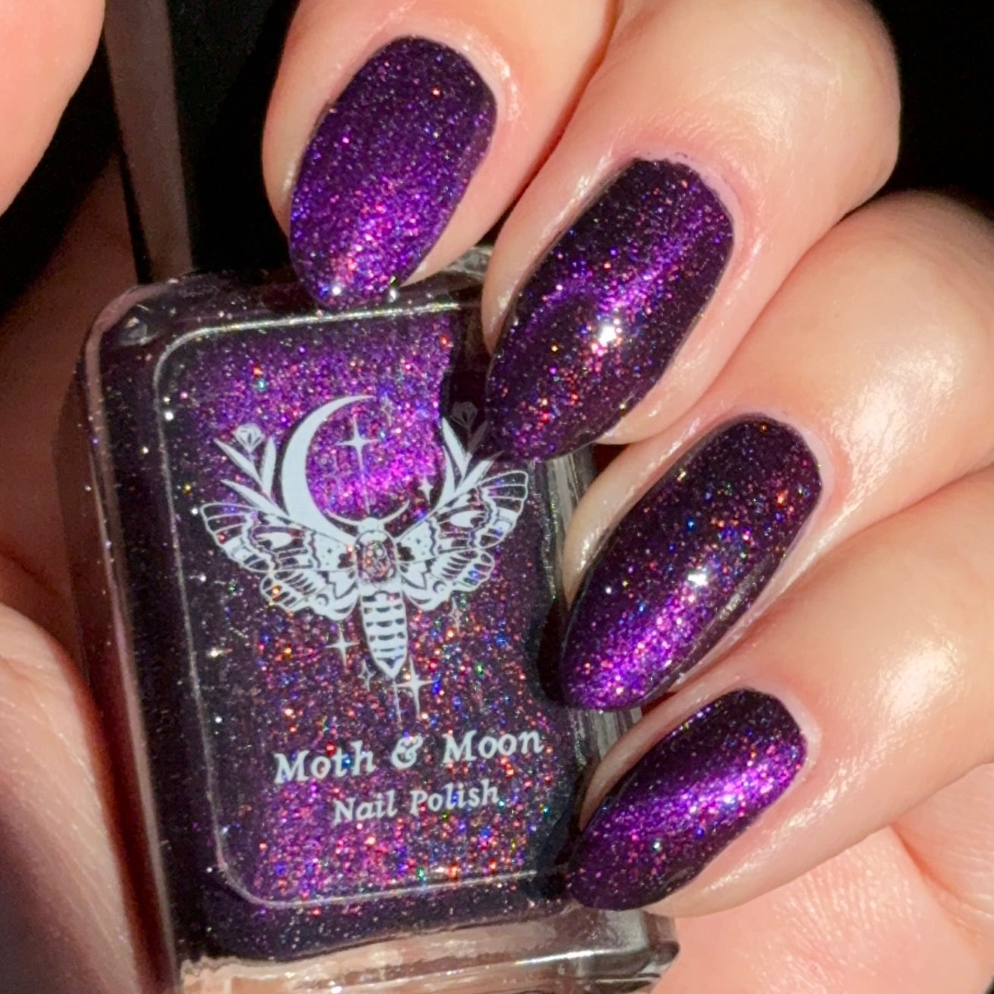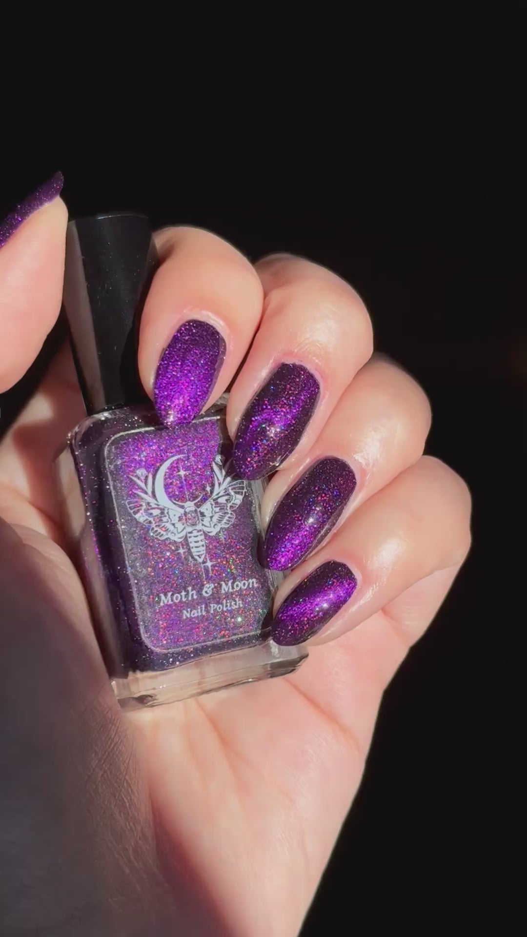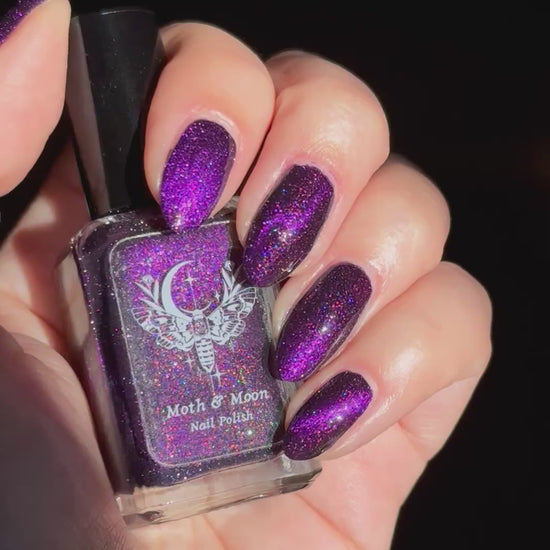 This is a deep eggplant shade with violet duochrome magnetic, multi colored shimmer, and subtle reflective glitter.