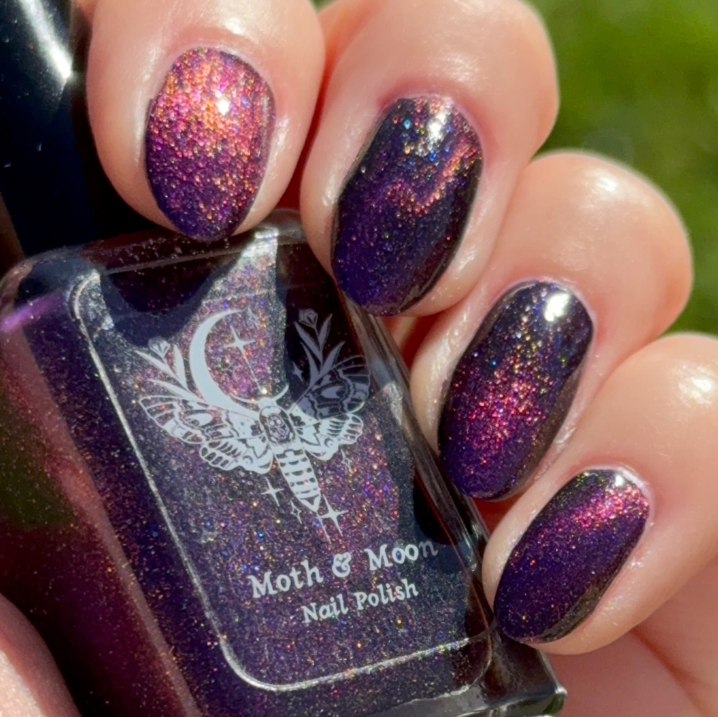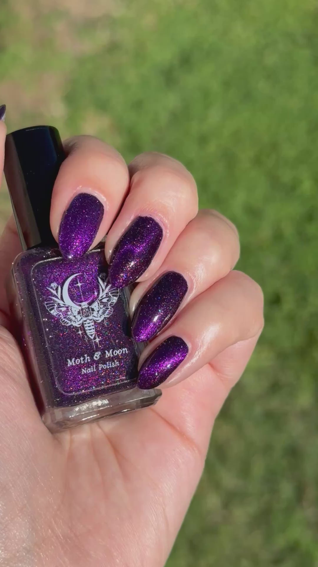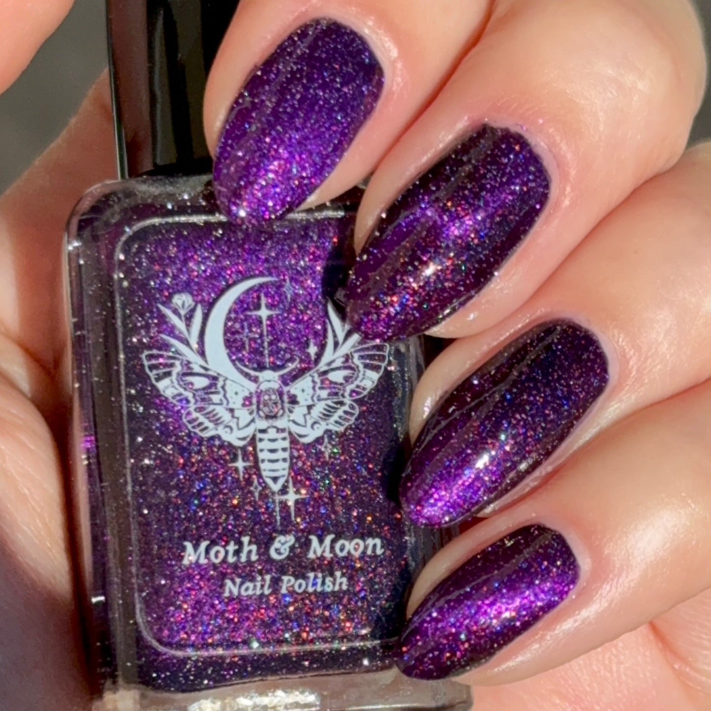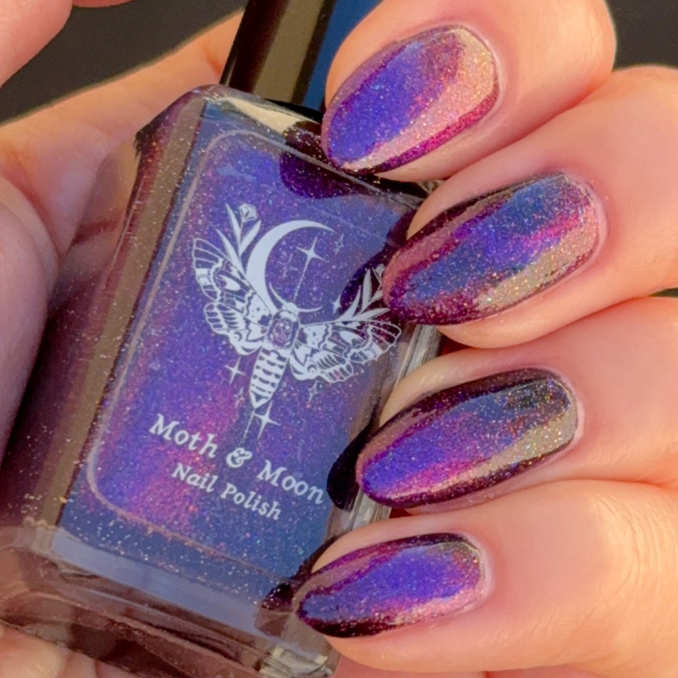This is a deep eggplant shade with violet duochrome magnetic, multi colored shimmer, and subtle reflective glitter.
