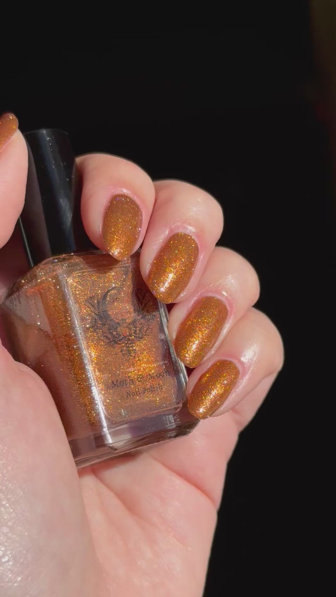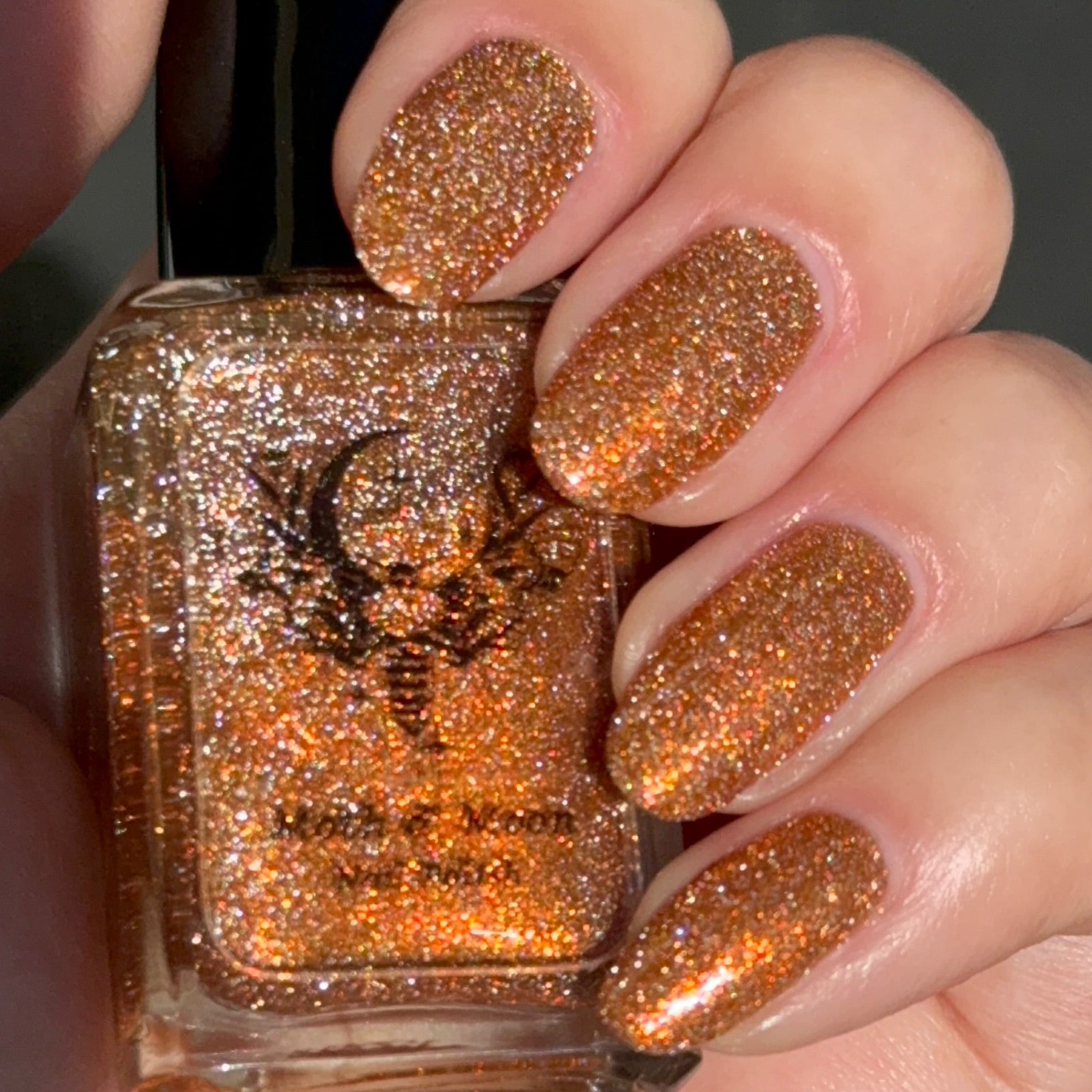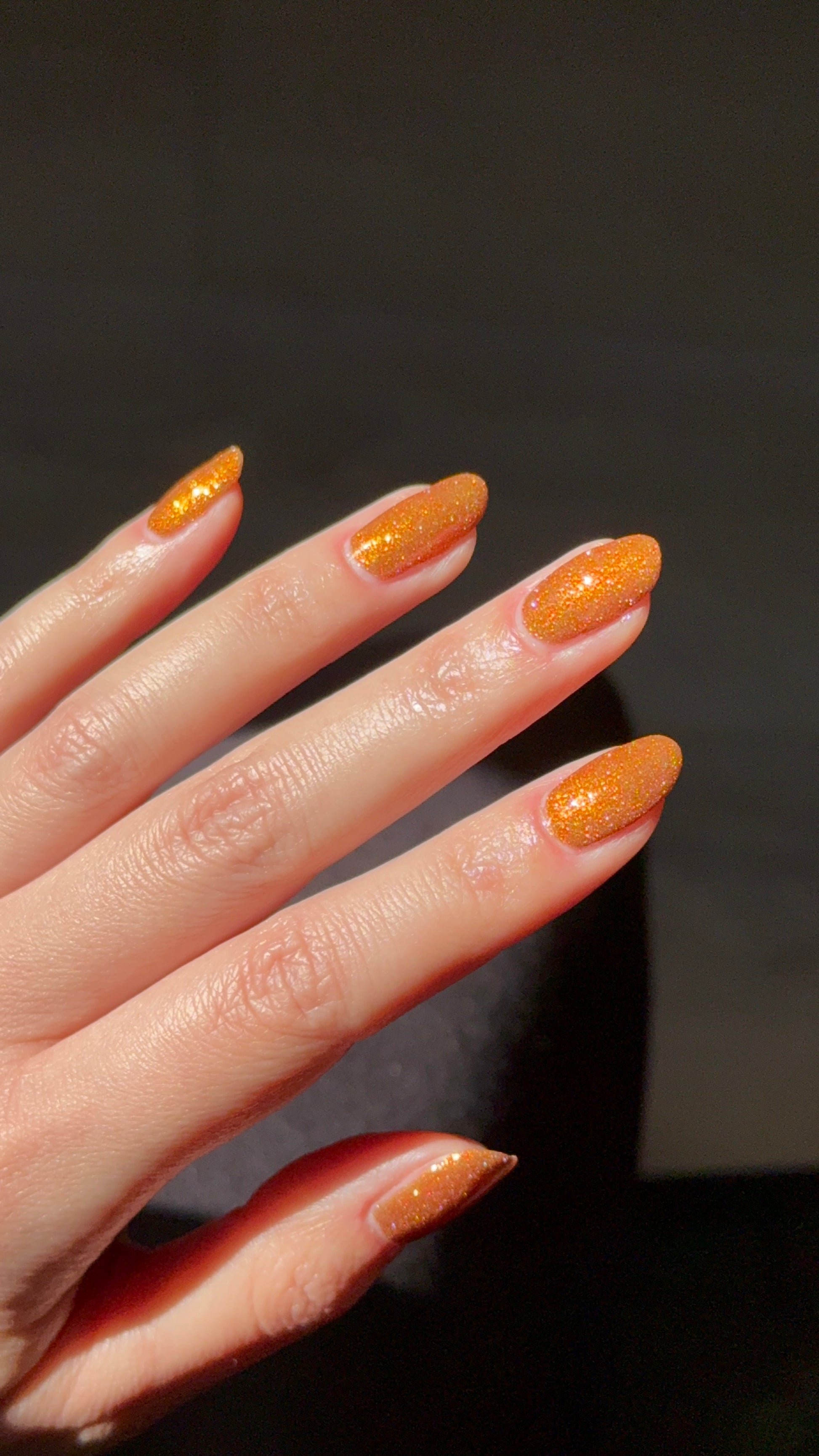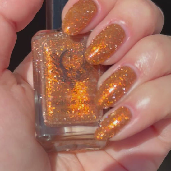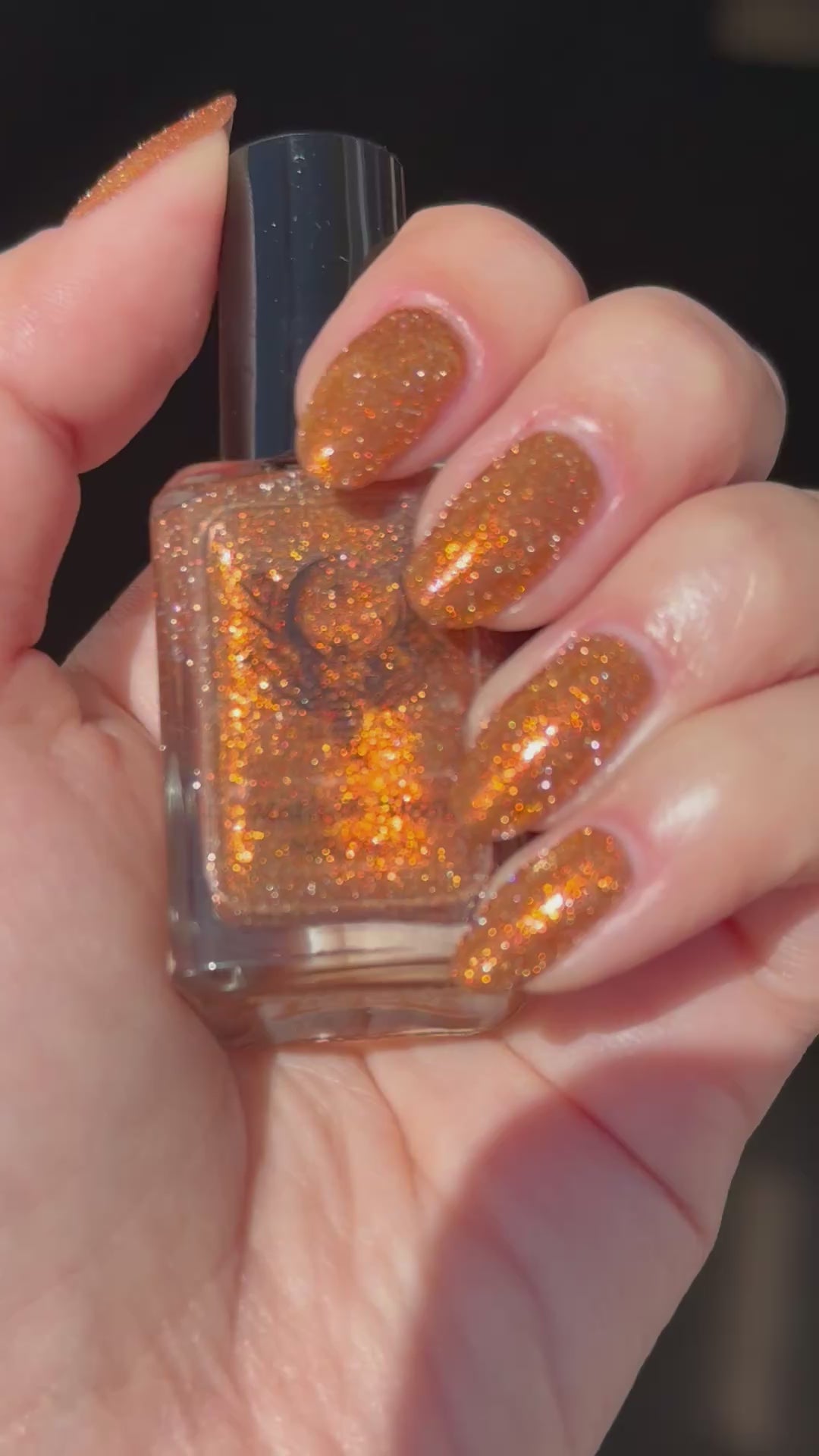 Orange-gold shimmers and silver reflective glitter in a sheer, honey colored base.