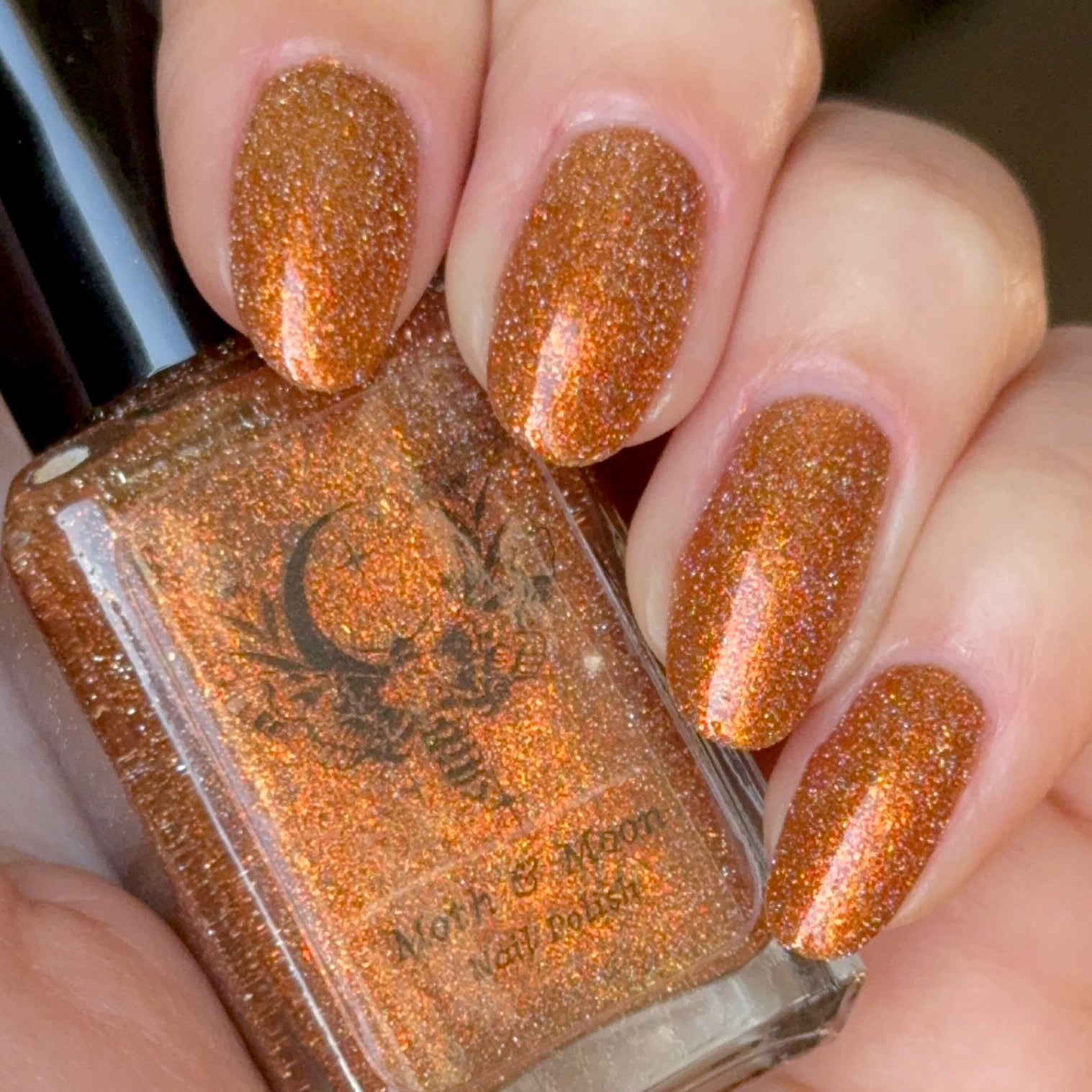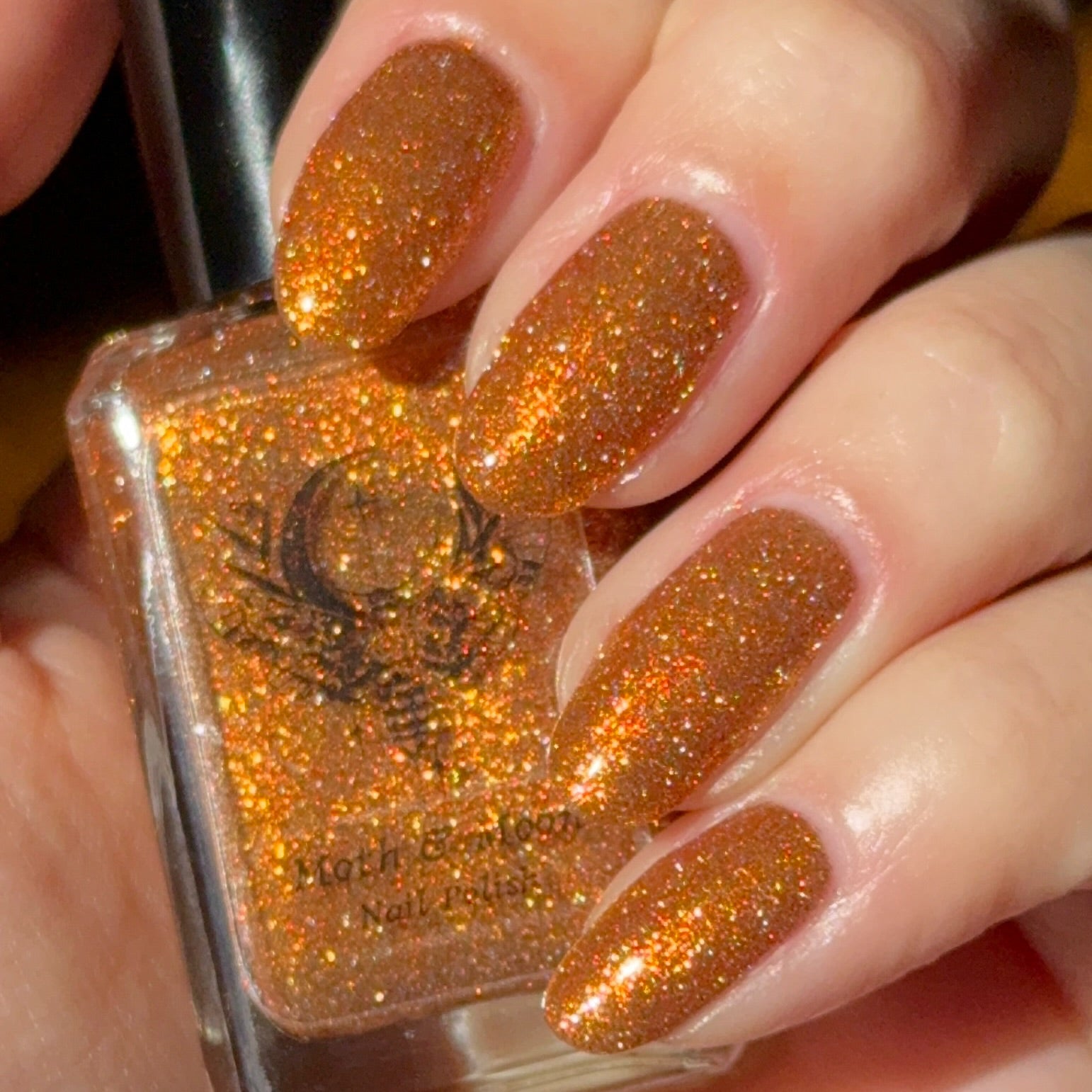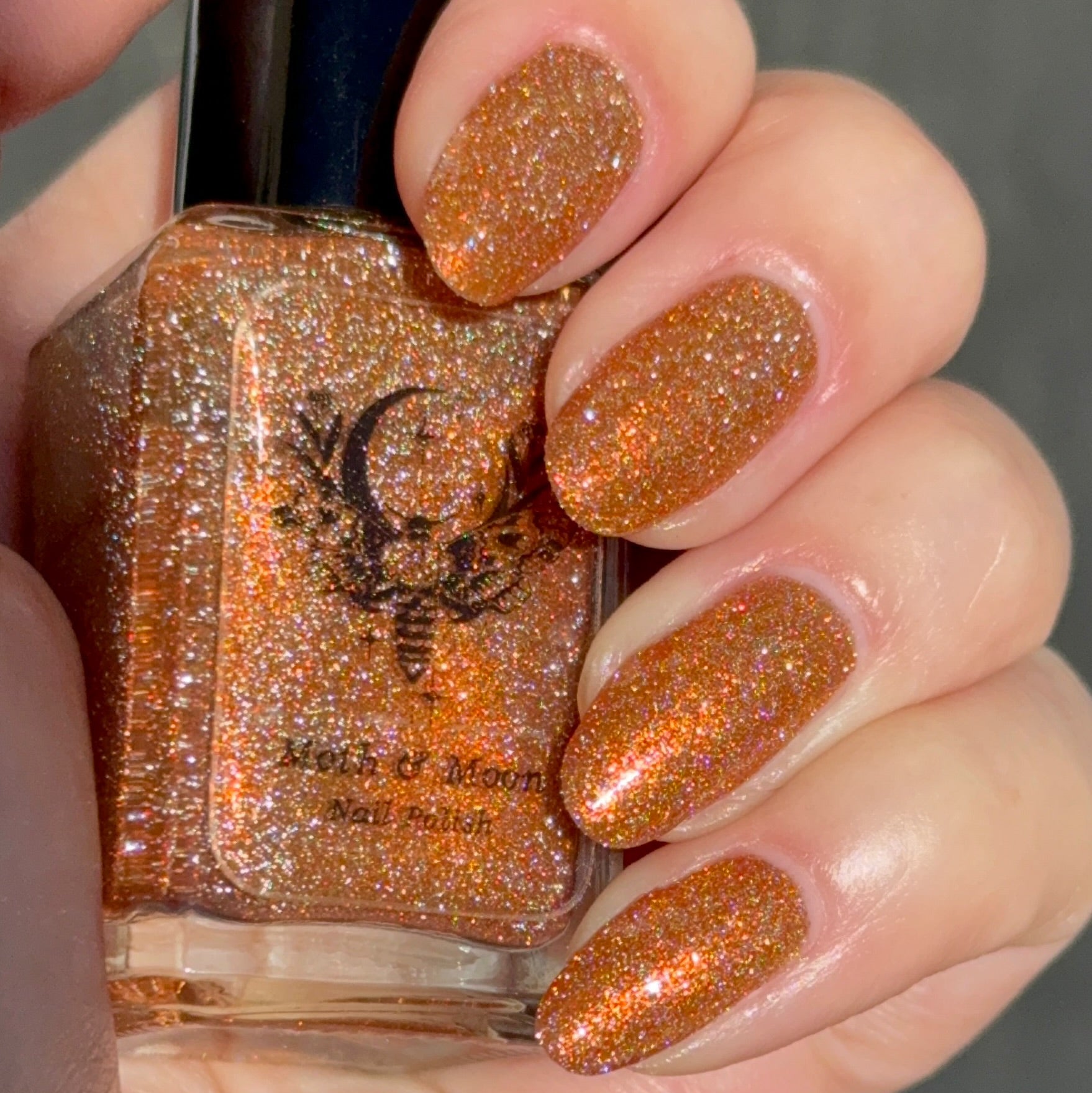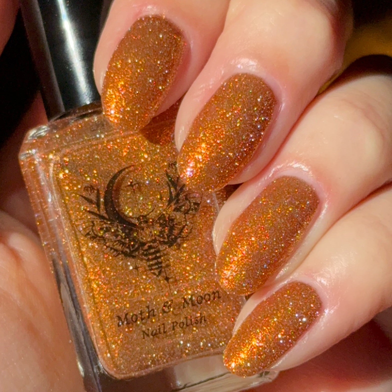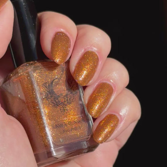 Orange-gold shimmers and silver reflective glitter in a sheer, honey colored base.