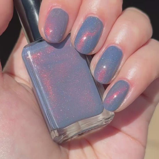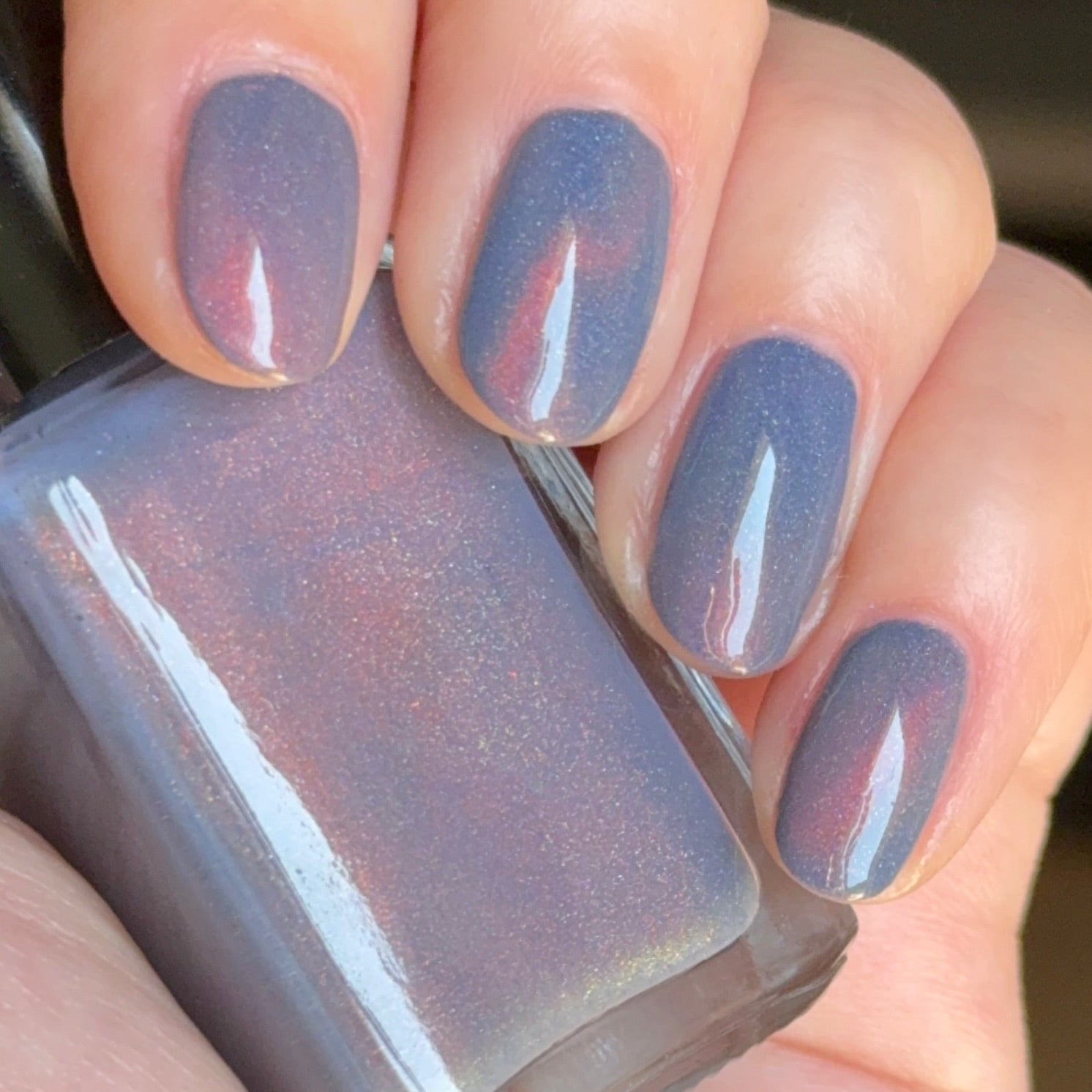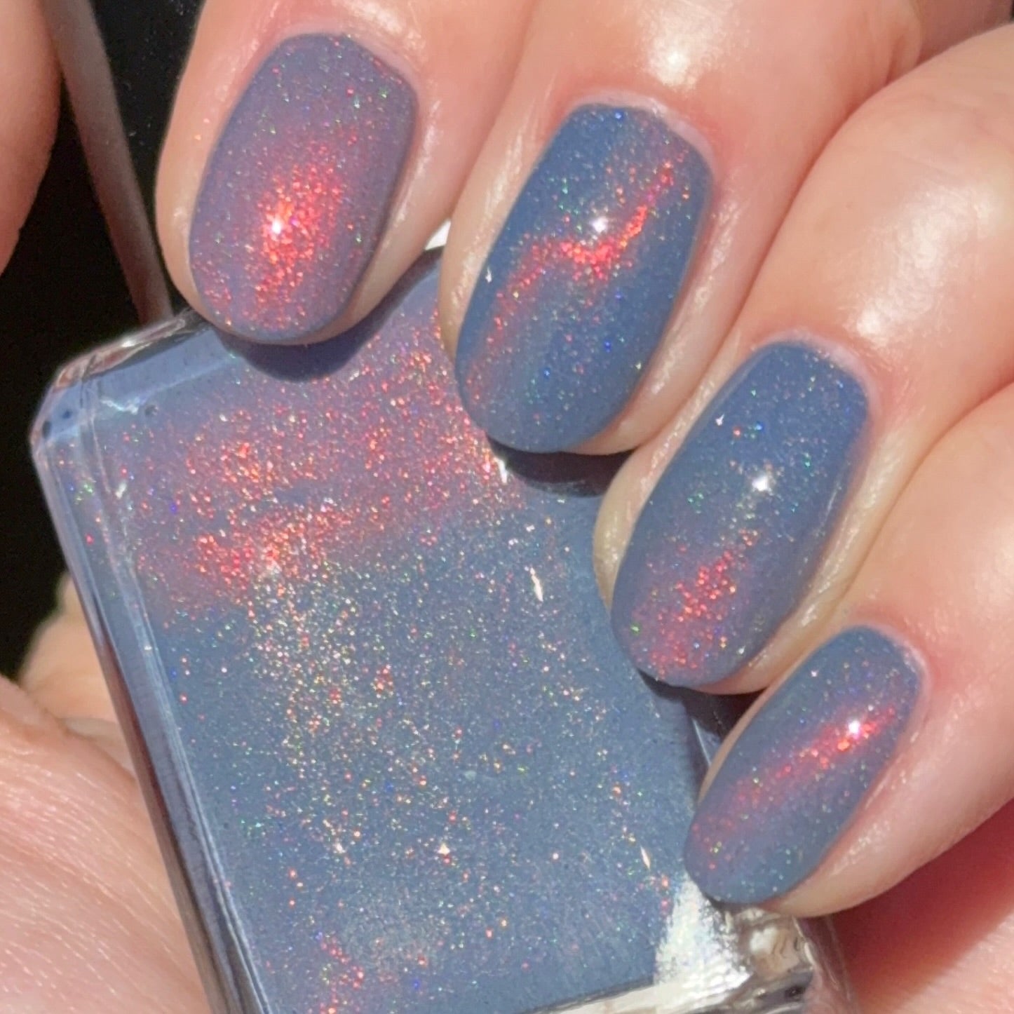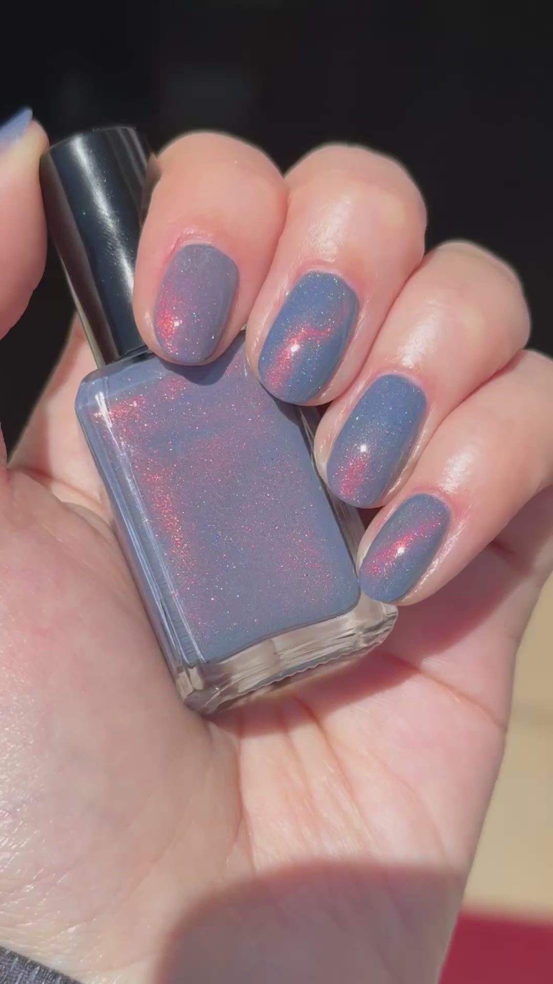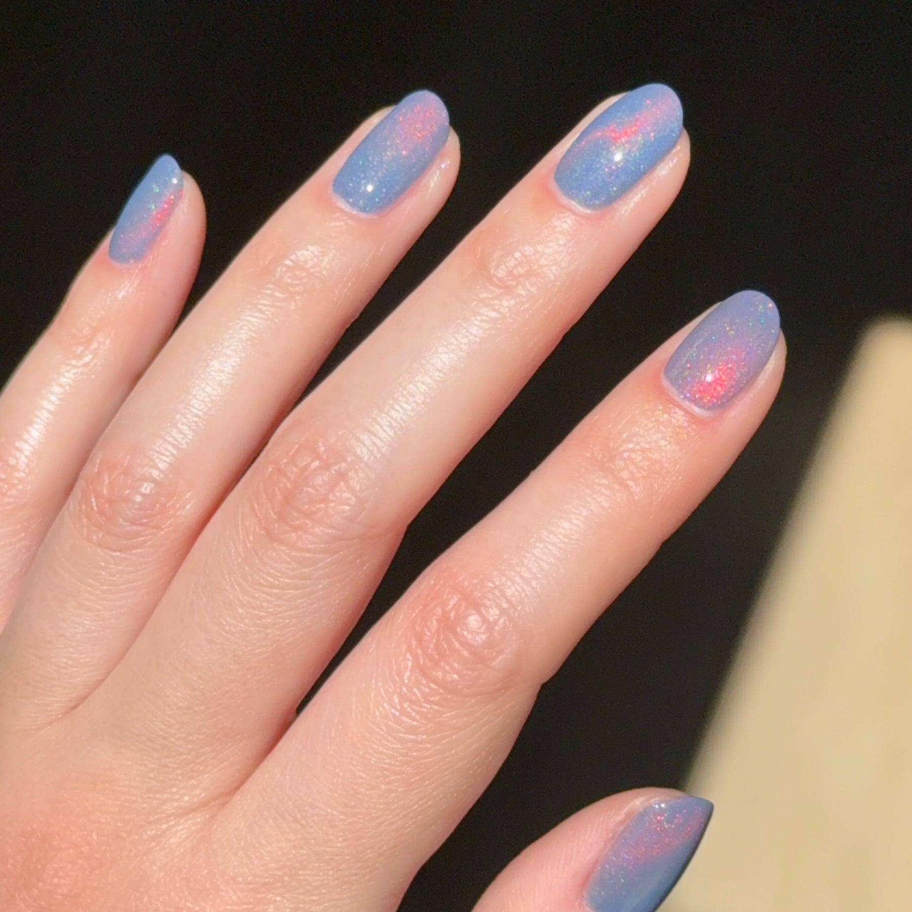 Dusty blue with red duochrome magnetic, and subtle holographic spectraflair.