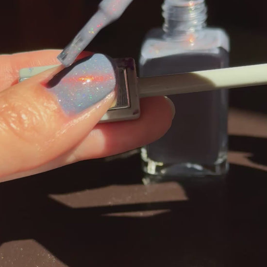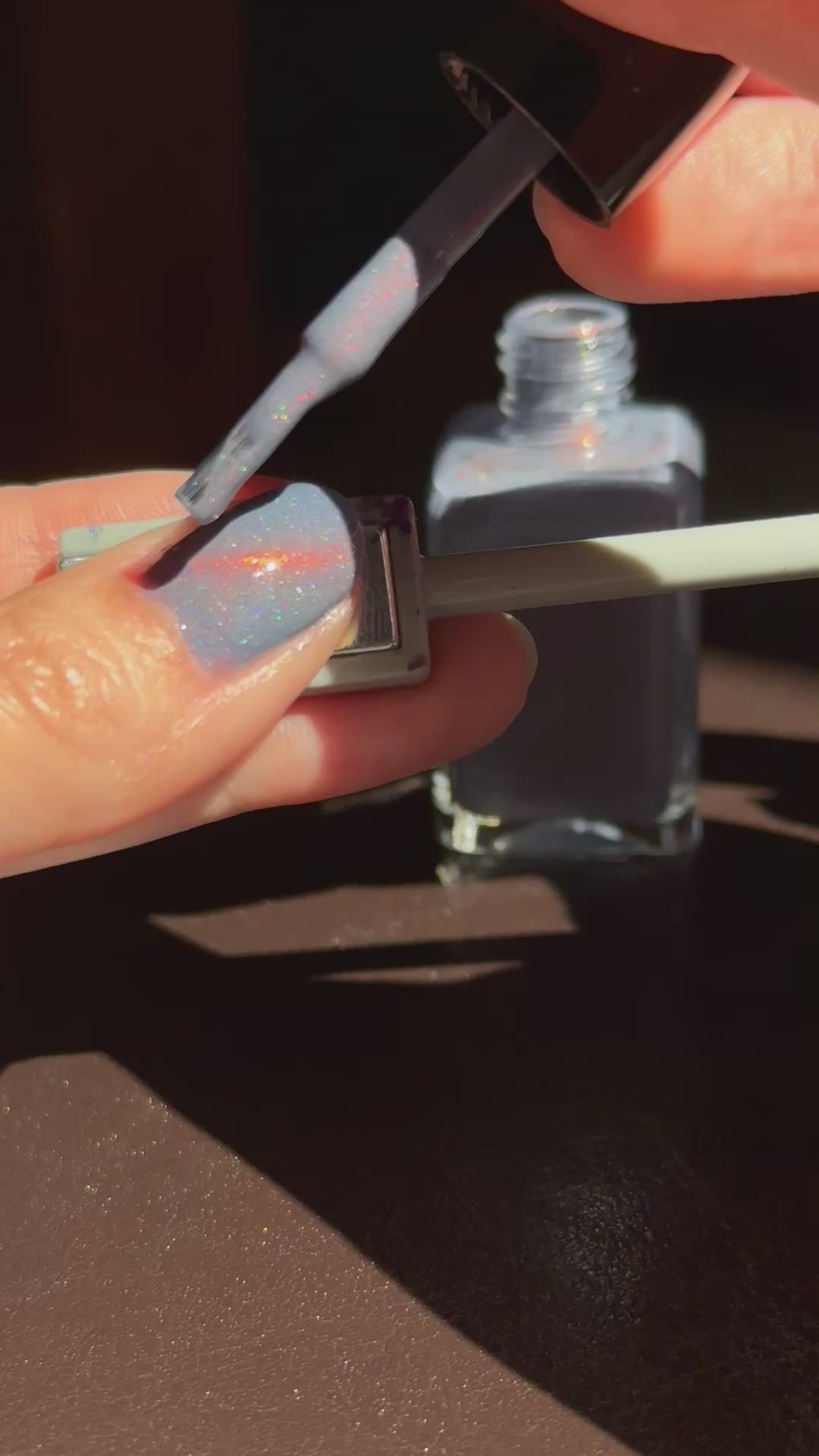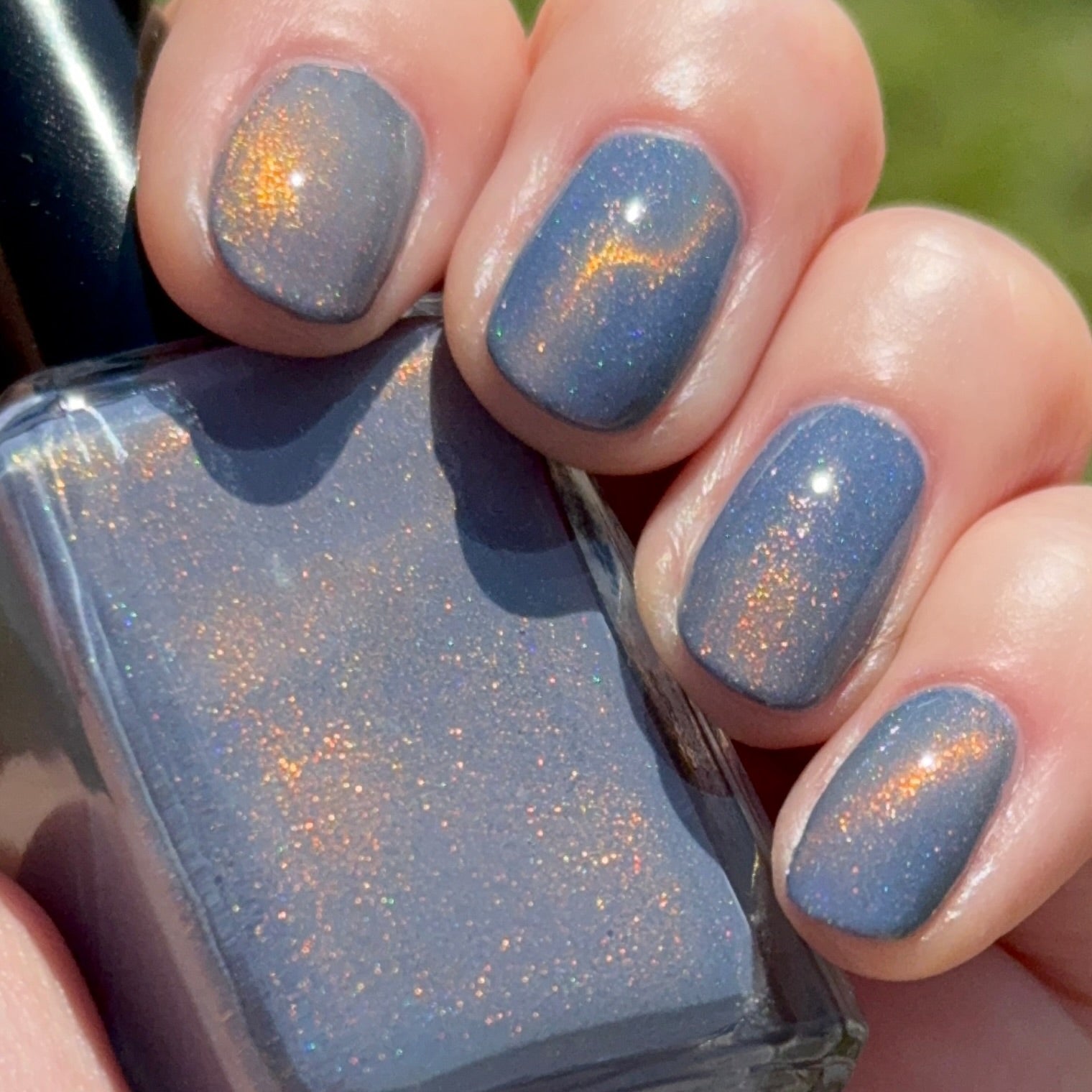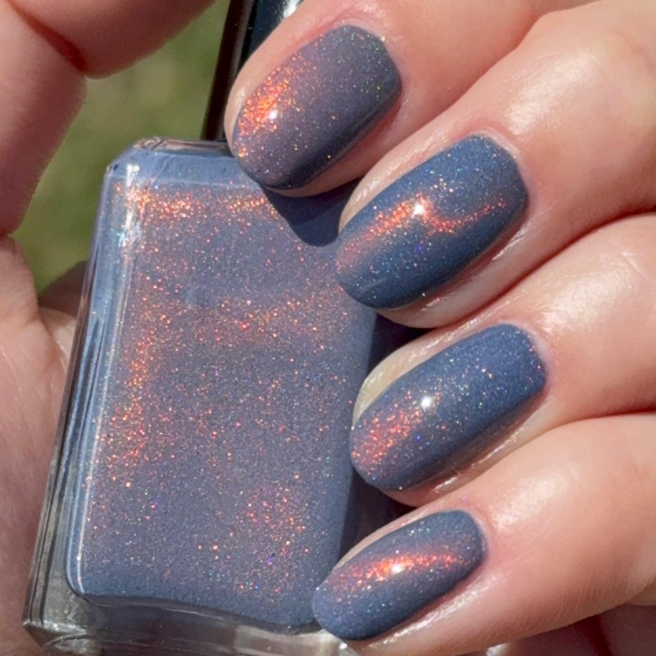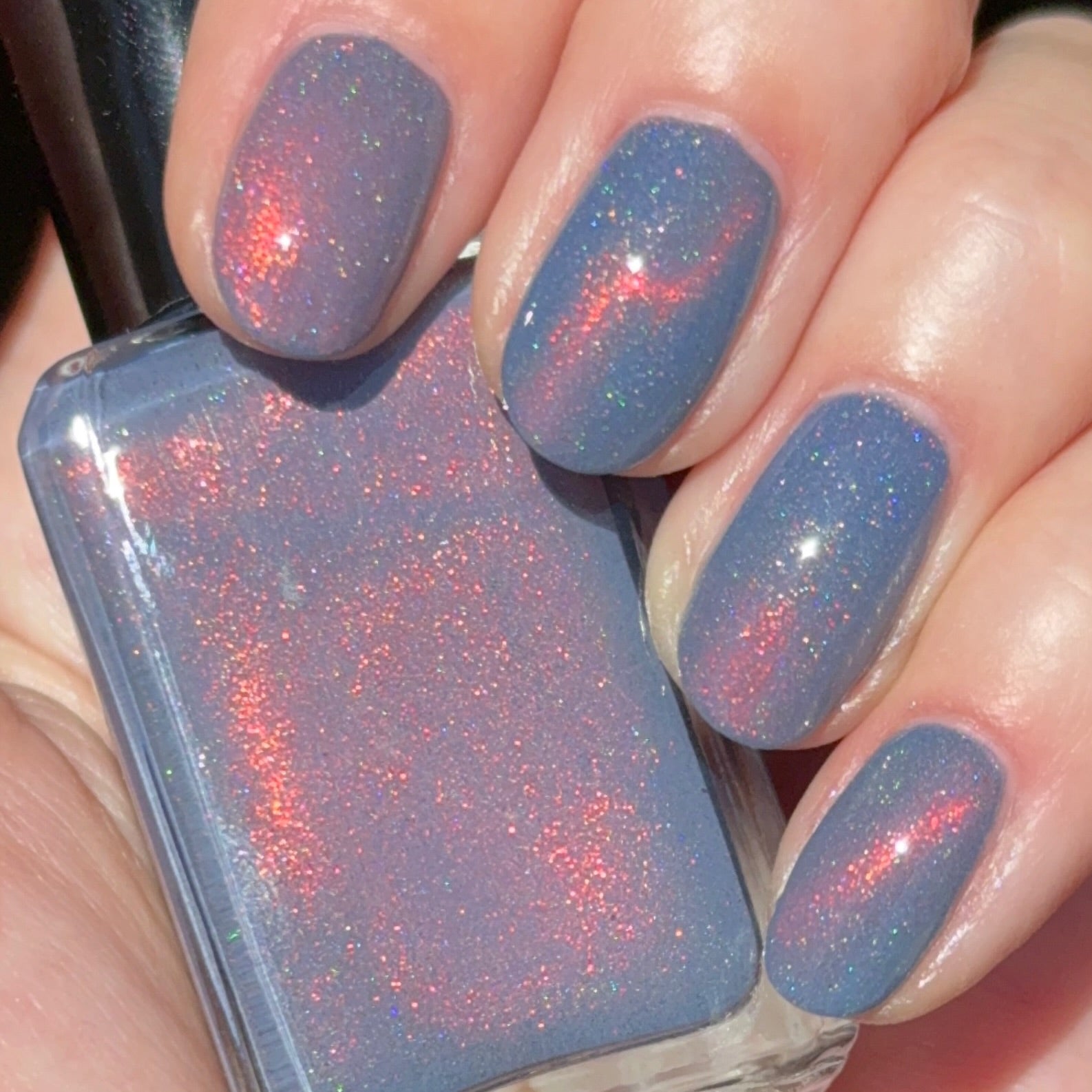 Dusty blue with red duochrome magnetic, and subtle holographic spectraflair.