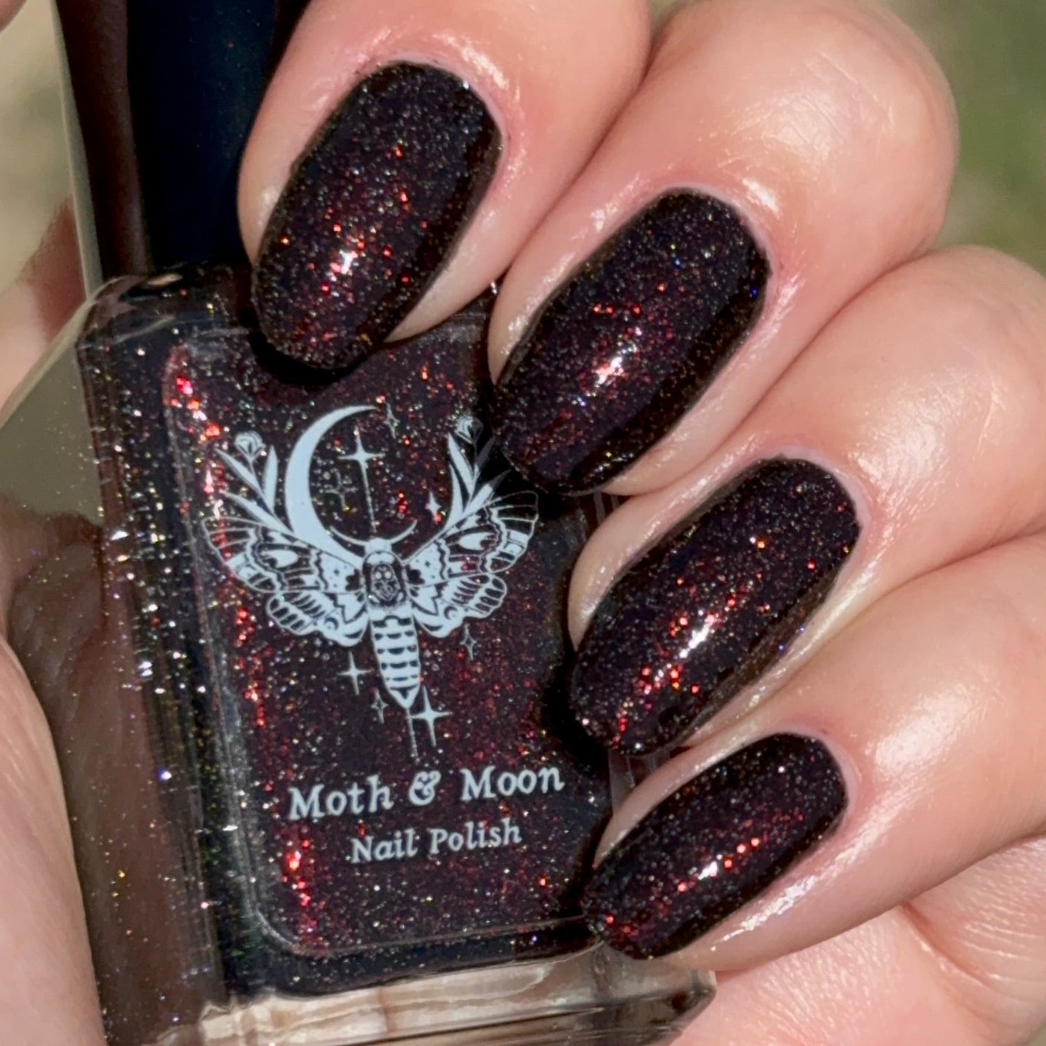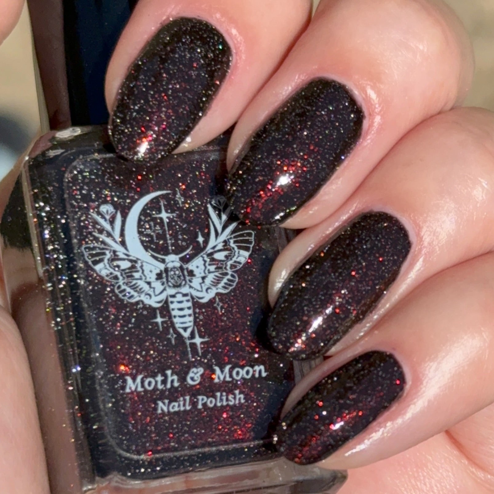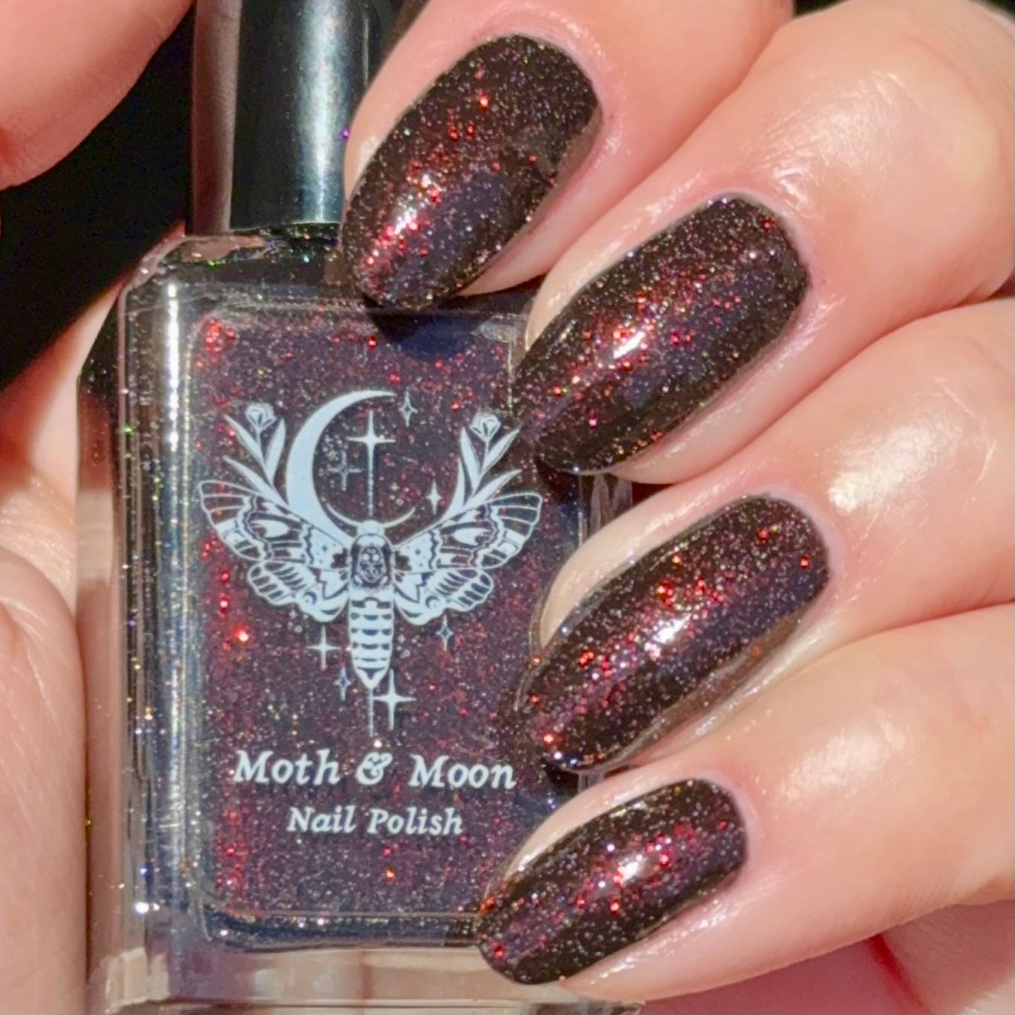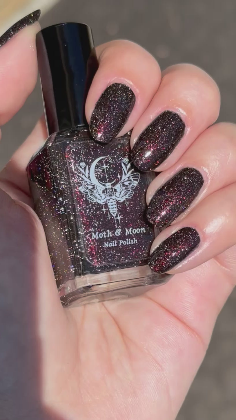 Black with red/orange iridescent micro flecks, and silver reflective glitter.