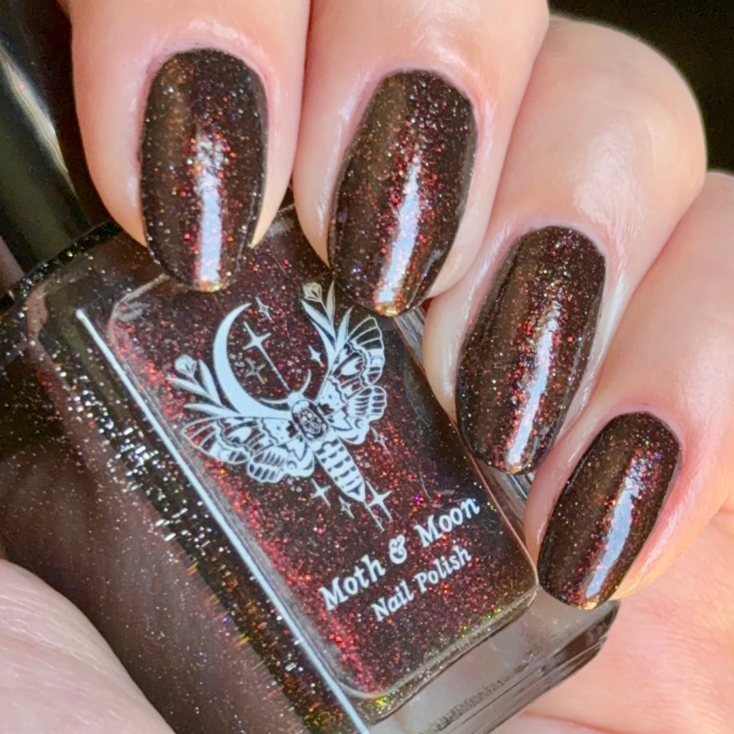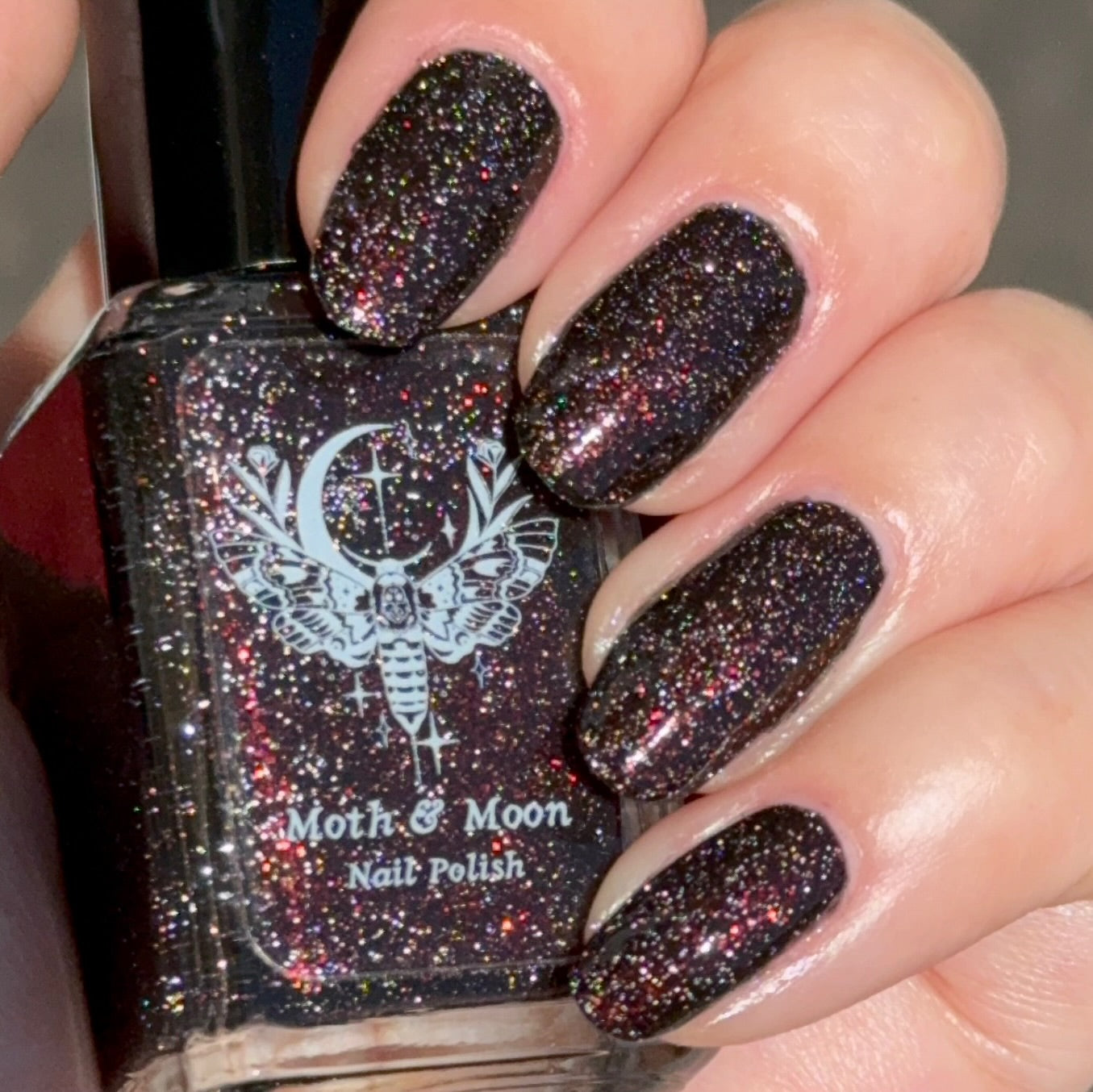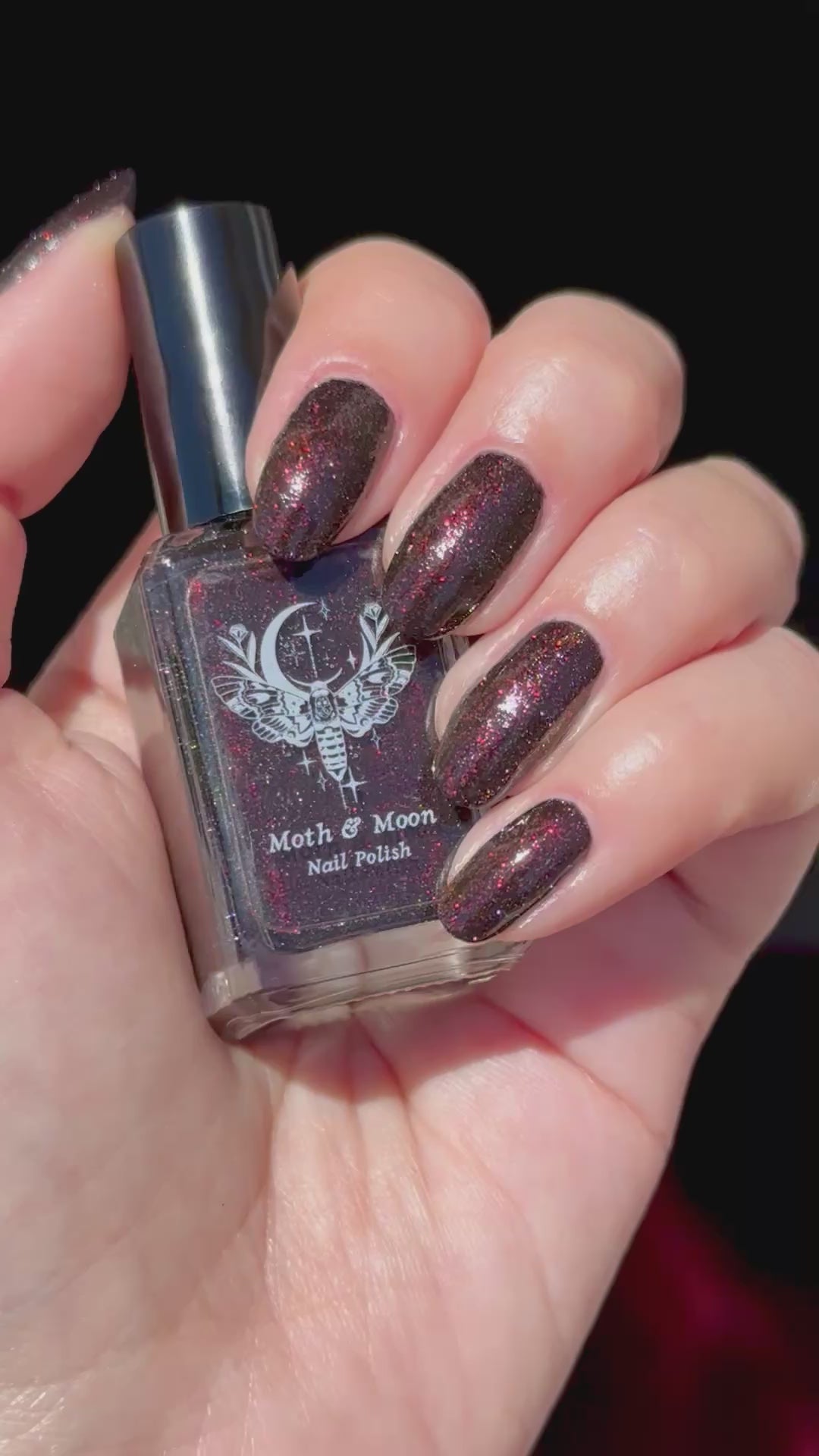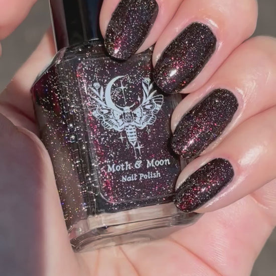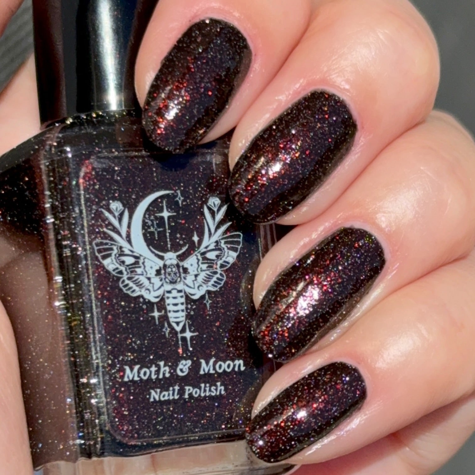 Black with red/orange iridescent micro flecks, and silver reflective glitter.