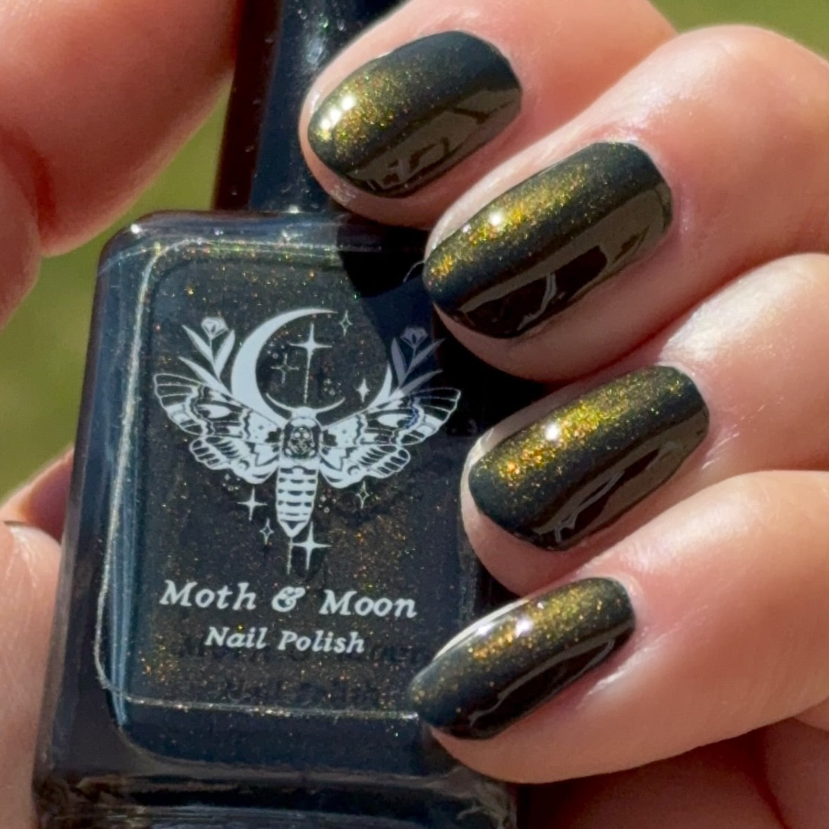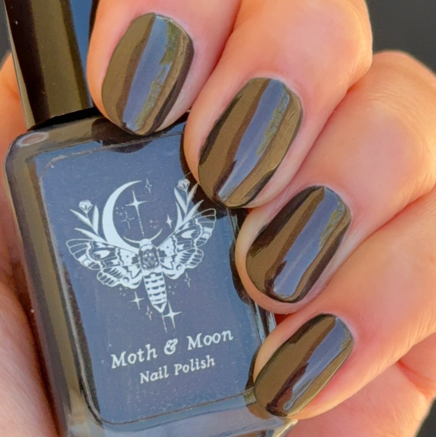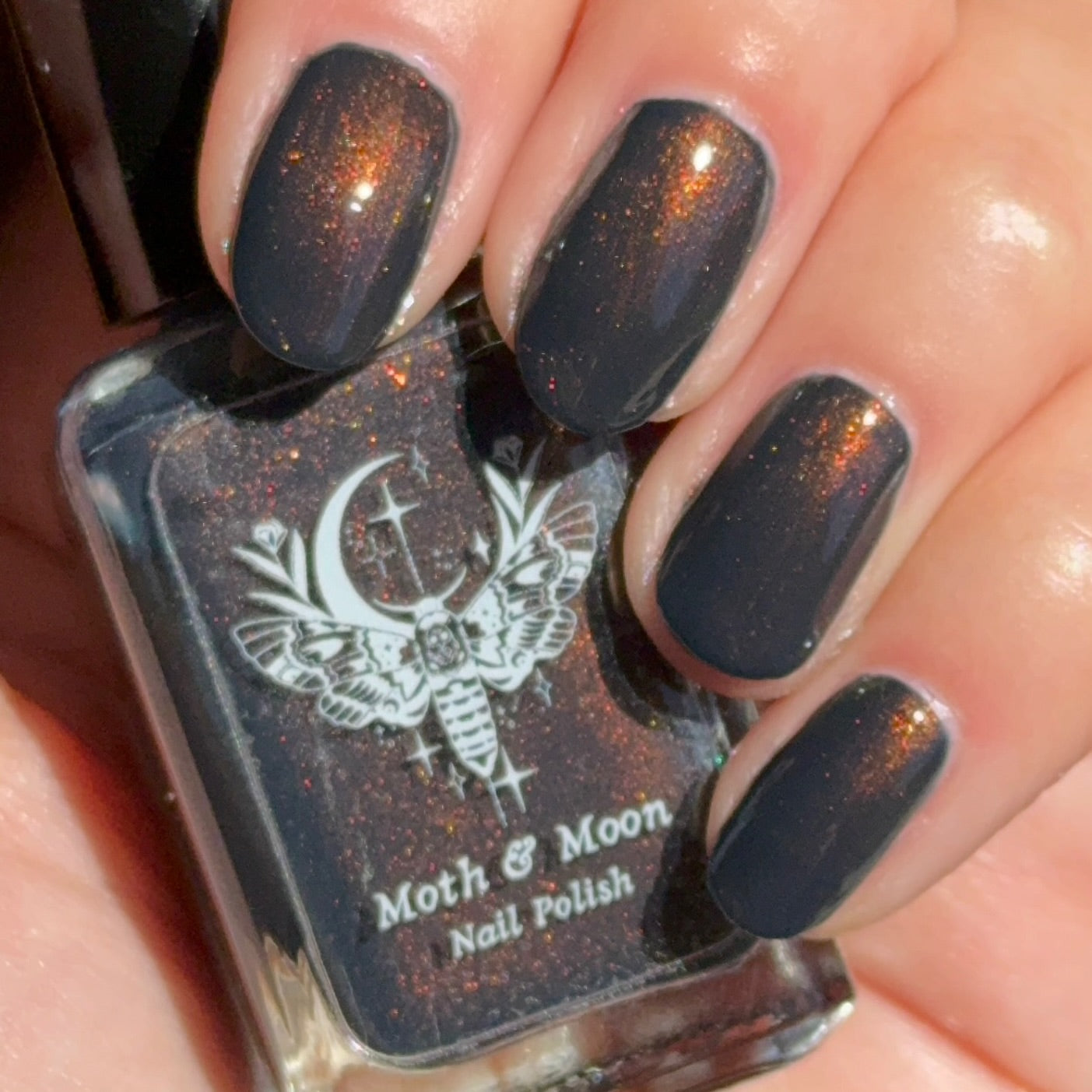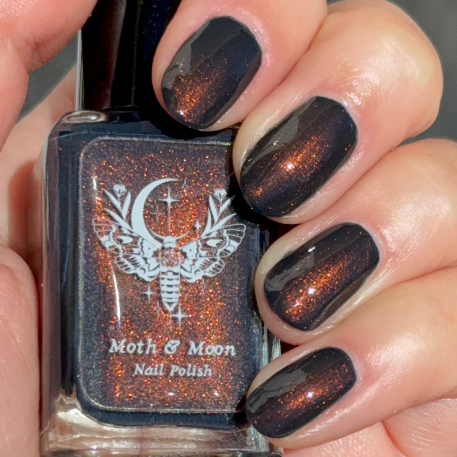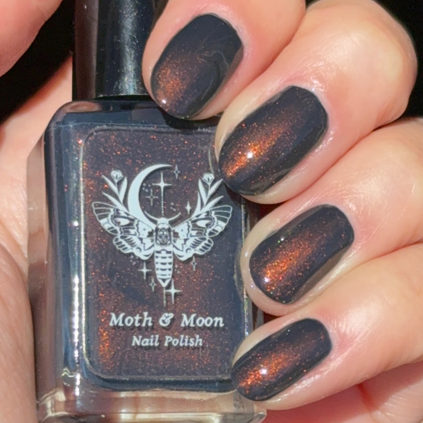 This is a dark navy shade with copper iridescent shimmer. The shimmer is most visible in direct light. It will not look the same in dim or indirect lighting.