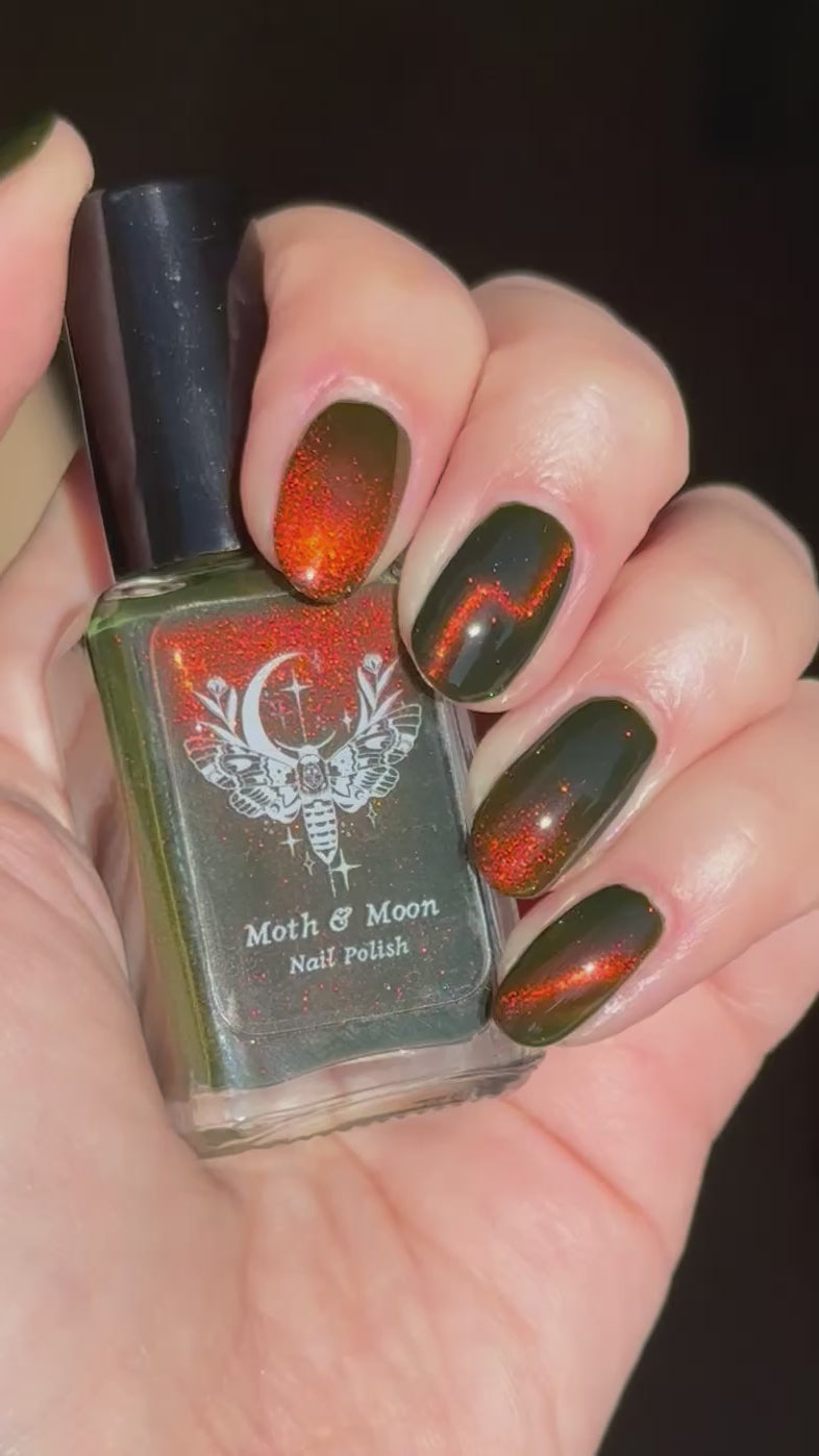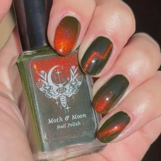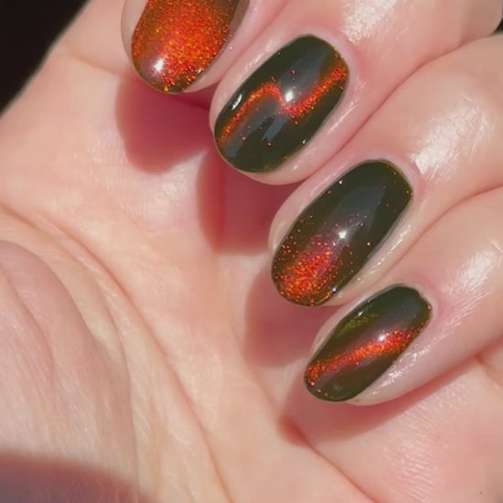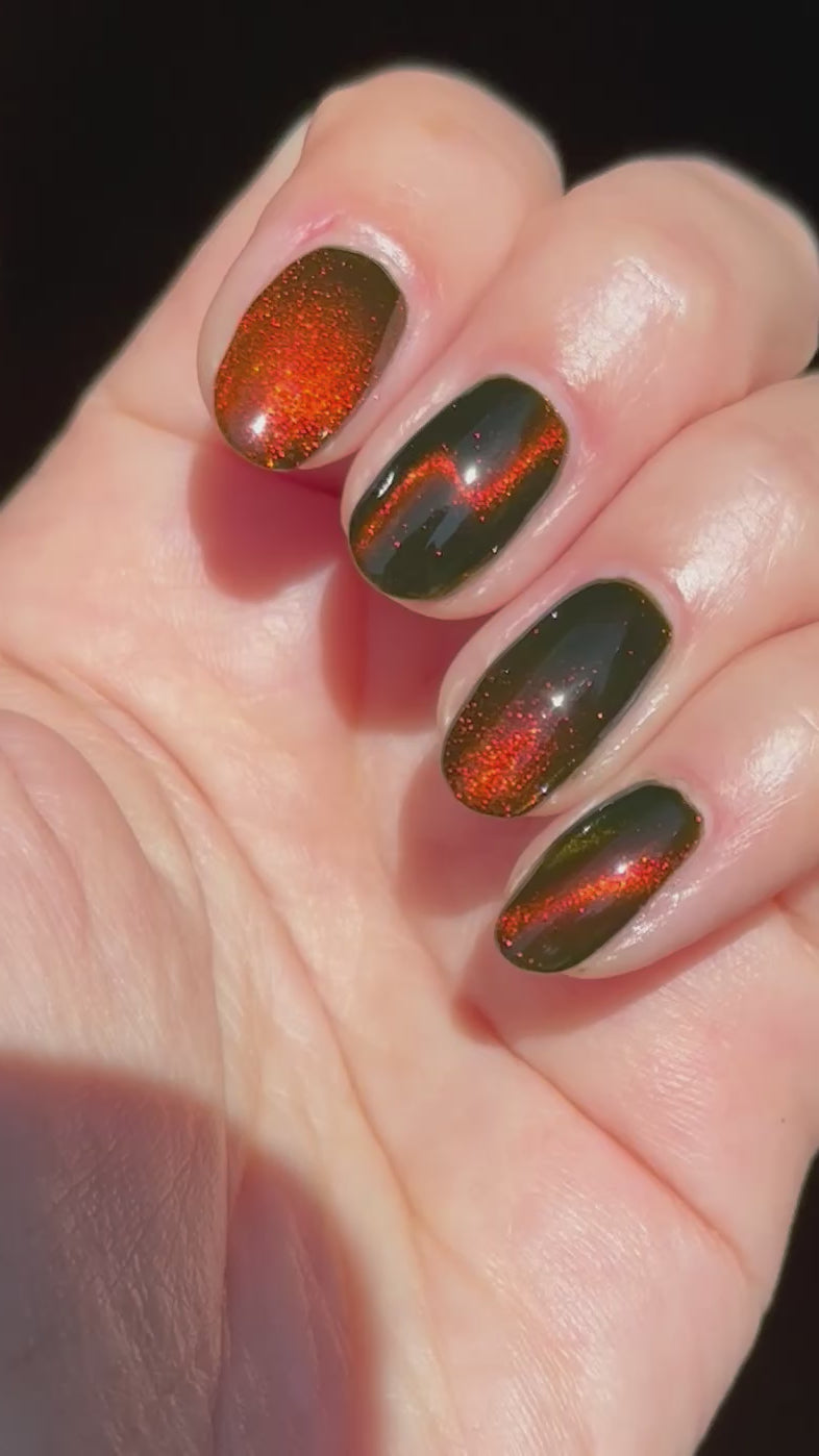 Dark hunter green with red duochrome magnetic. The swatches show three coats with Top Glass top coat. .5 fl oz/15ml, 10 Free, hand mixed nail polish.