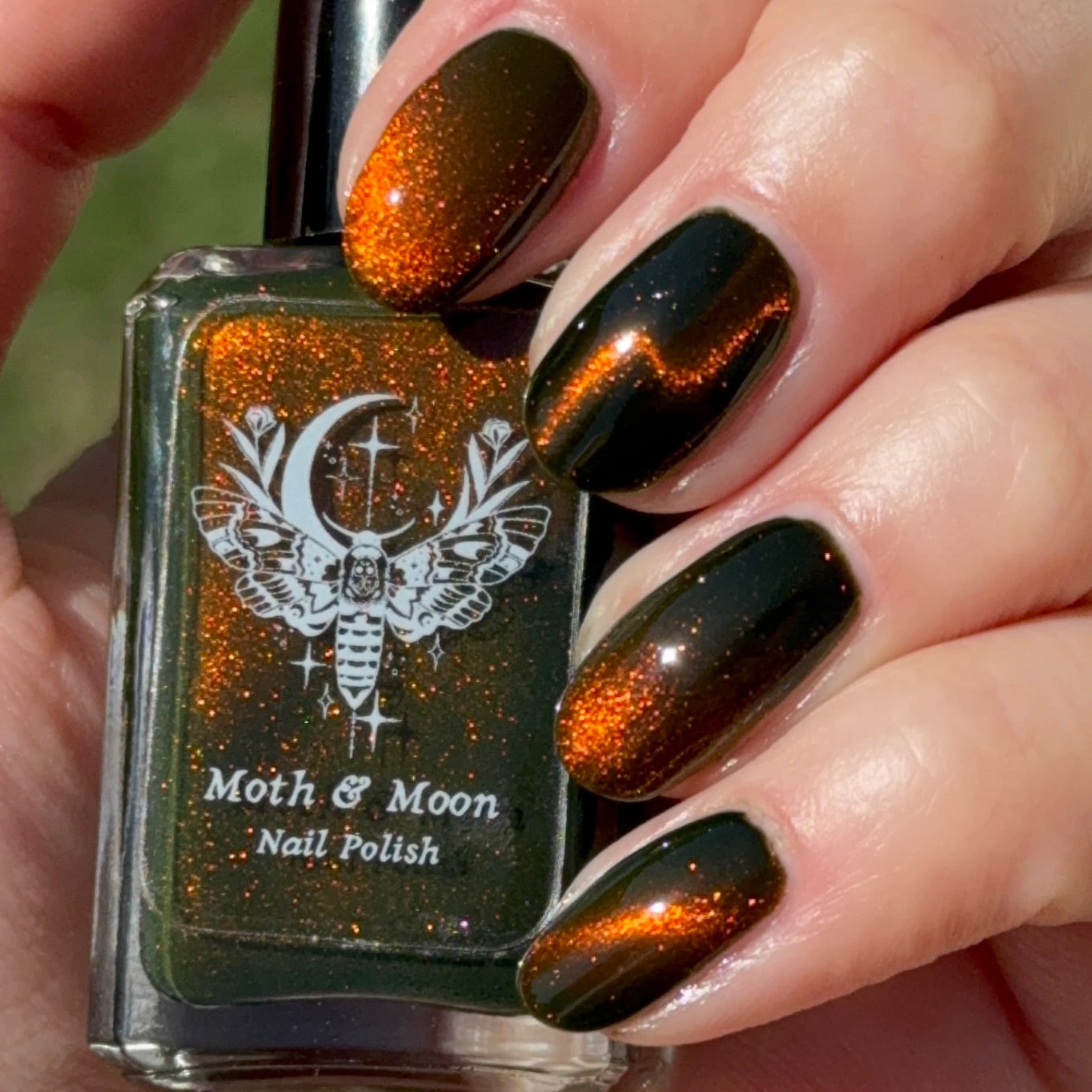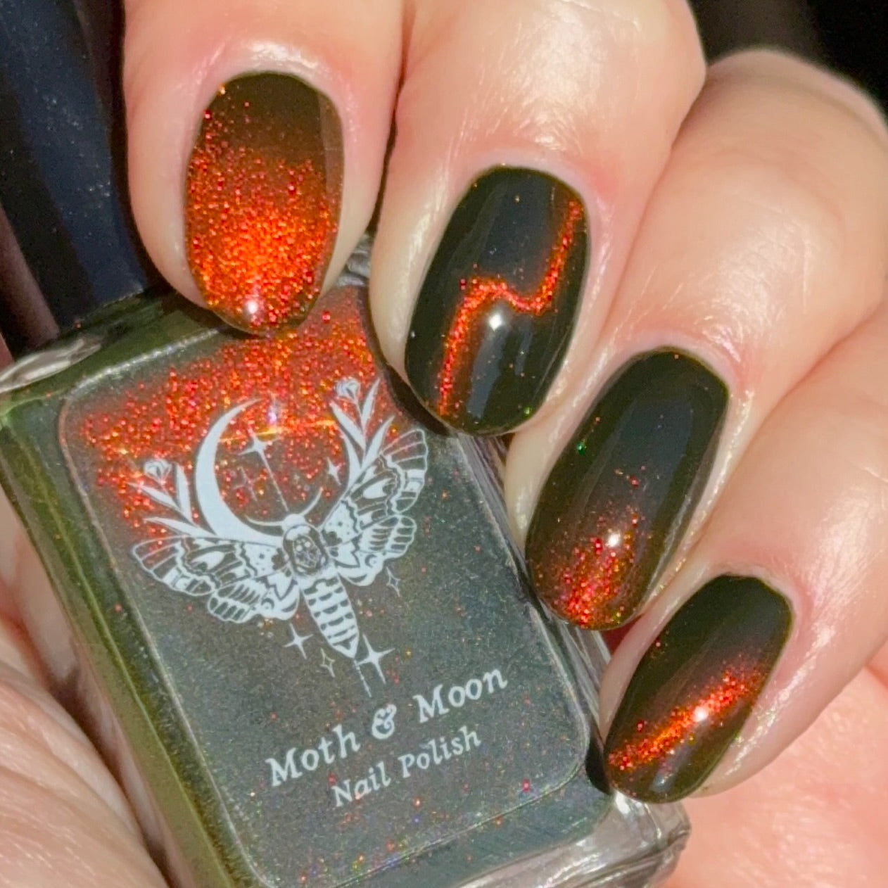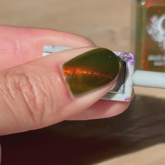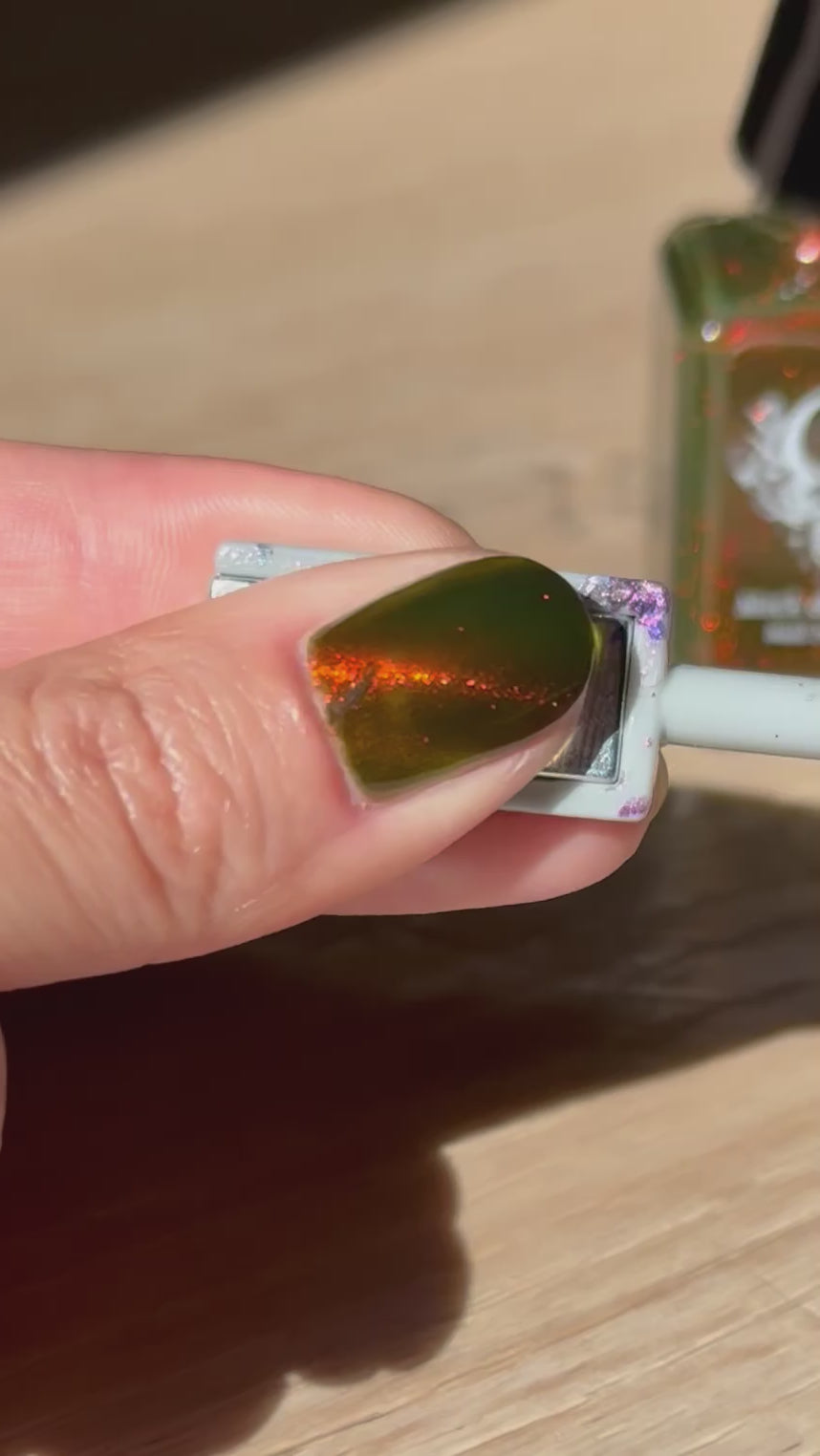 Dark hunter green with red duochrome magnetic. The swatches show three coats with Top Glass top coat. .5 fl oz/15ml, 10 Free, hand mixed nail polish.