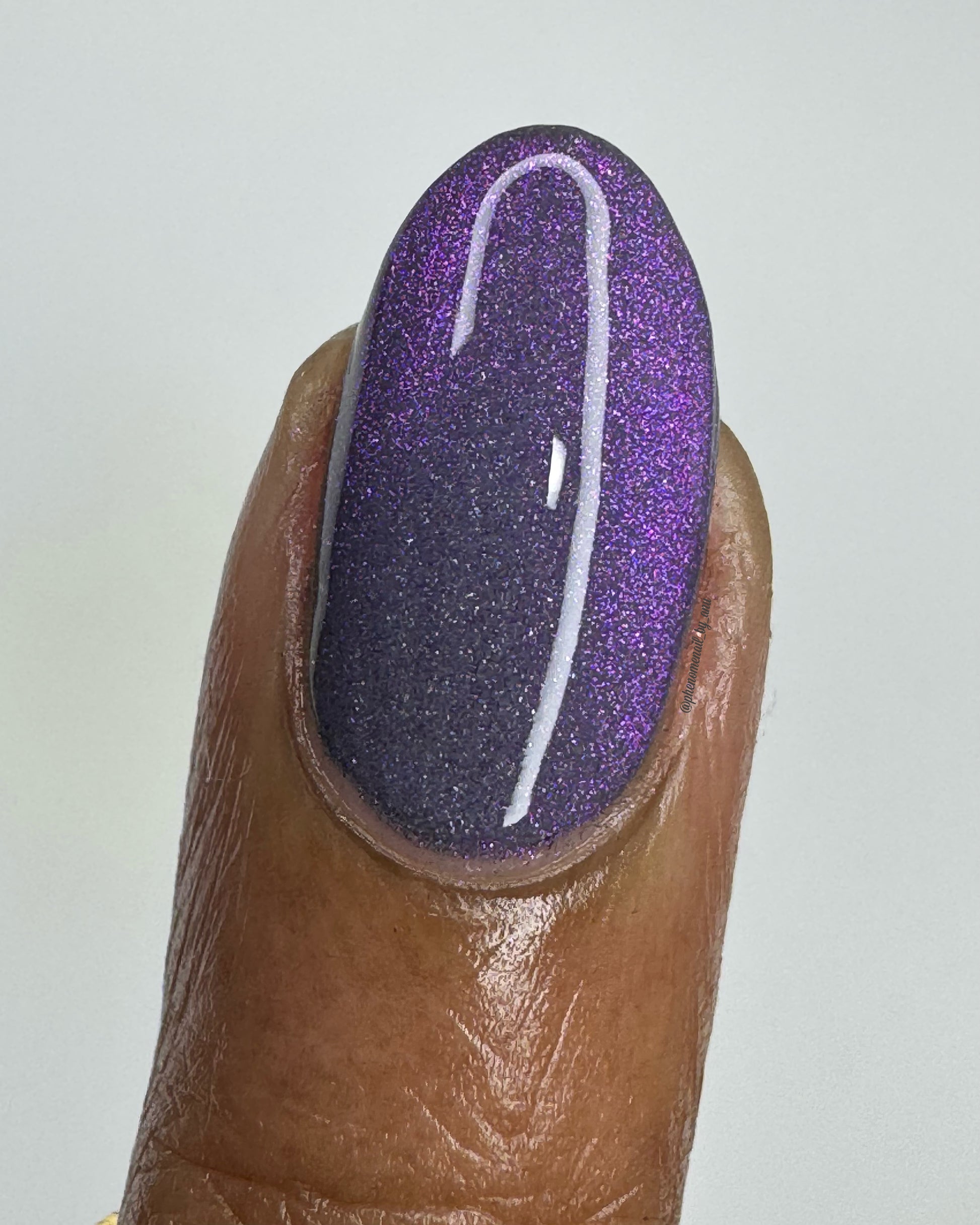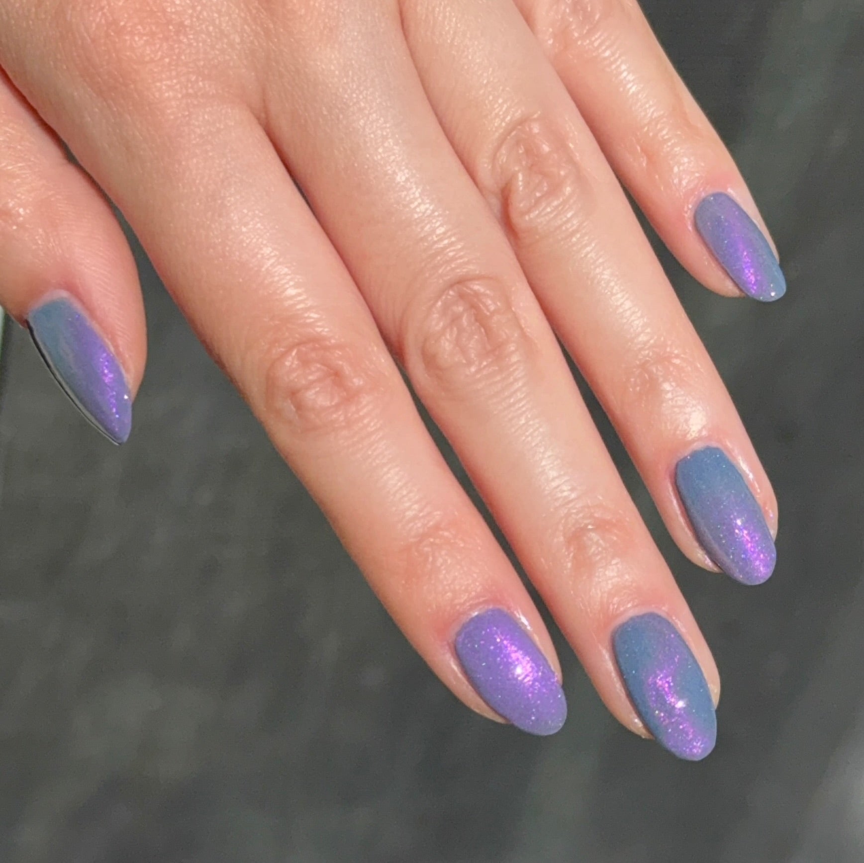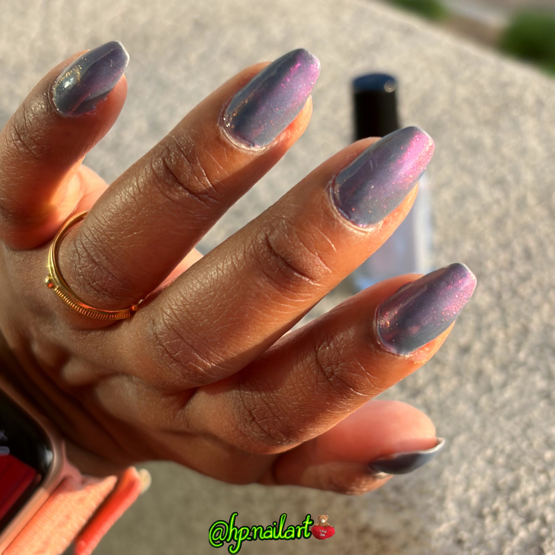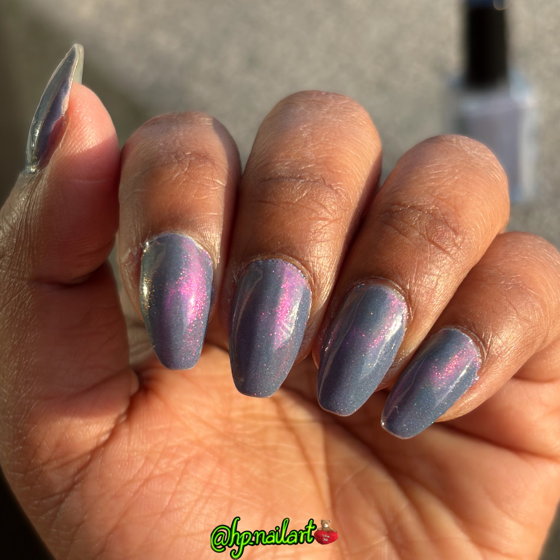 This is a periwinkle grey shade with purple duochrome magnetic, and subtle holographic spectraflair.