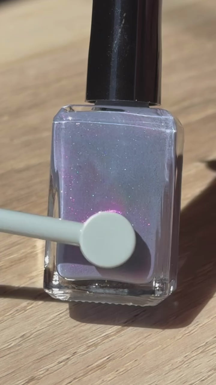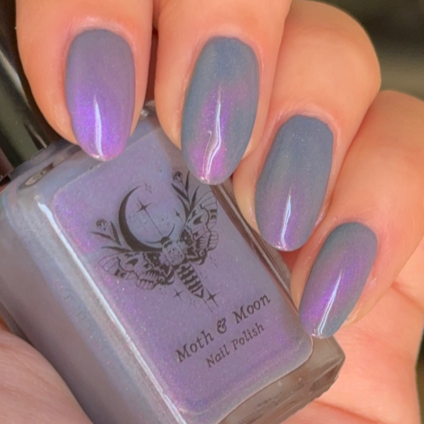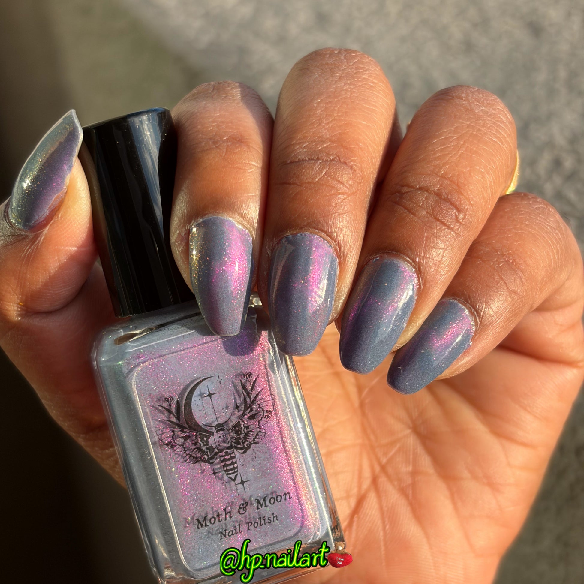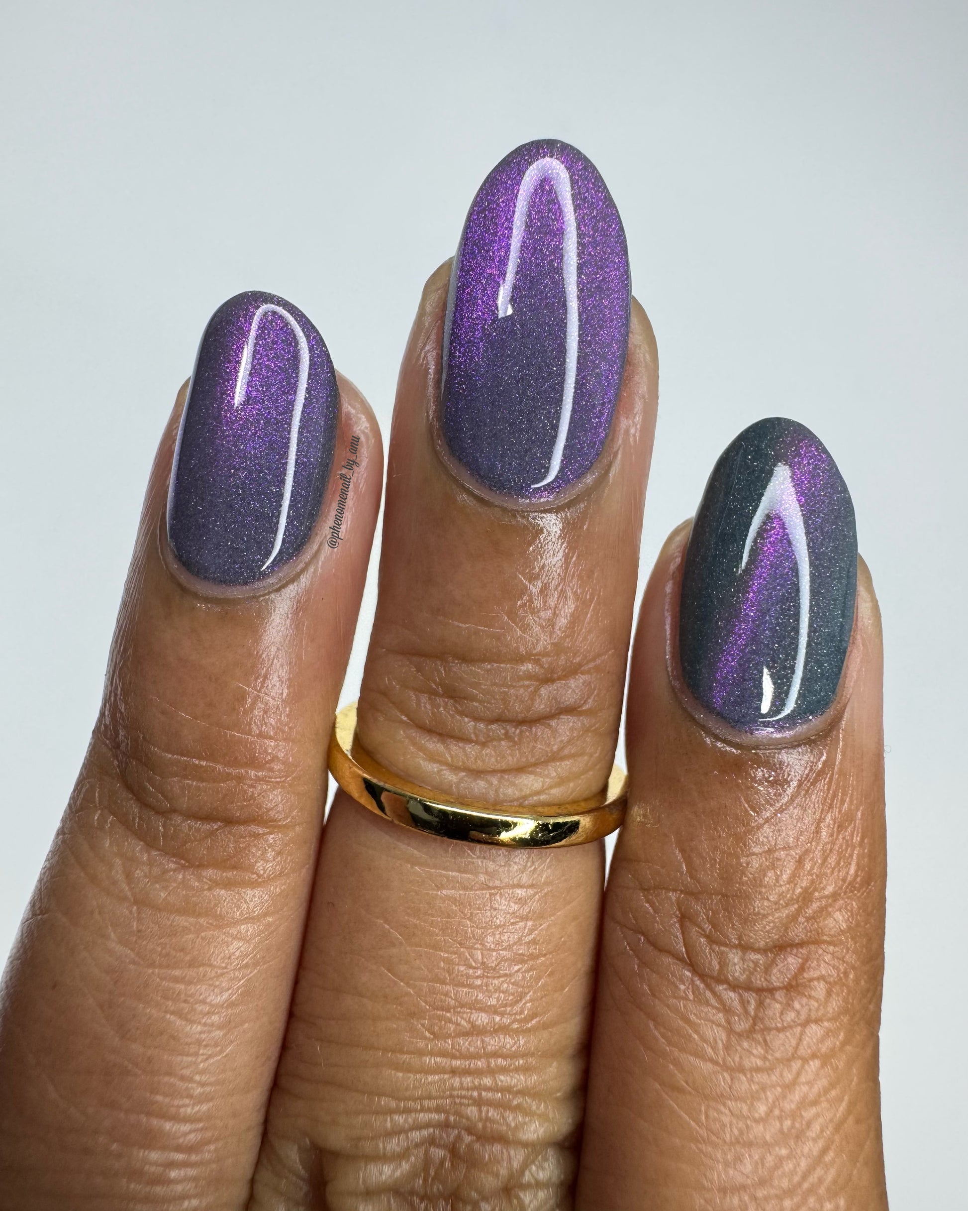 This is a periwinkle grey shade with purple duochrome magnetic, and subtle holographic spectraflair.