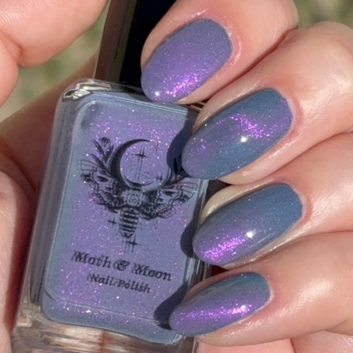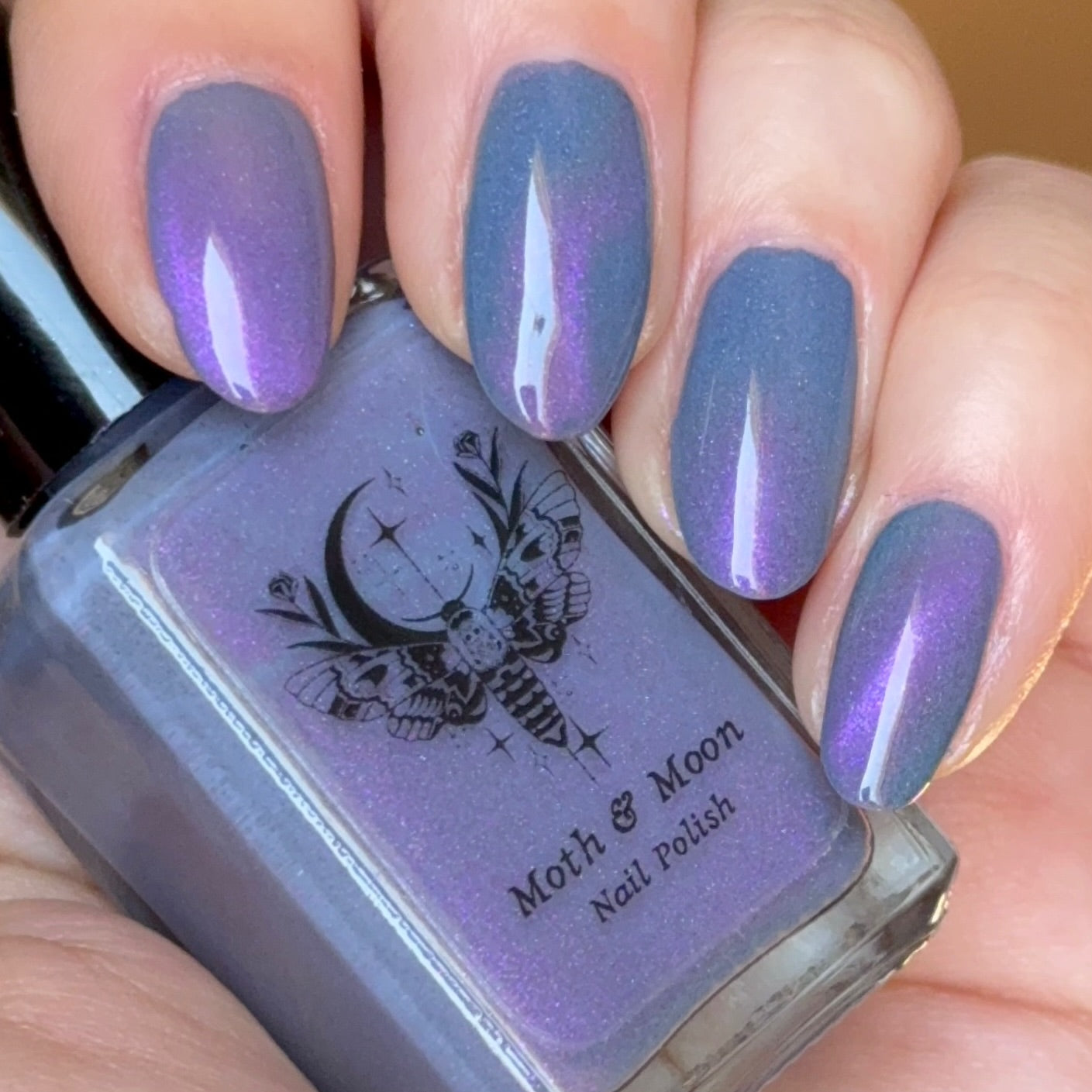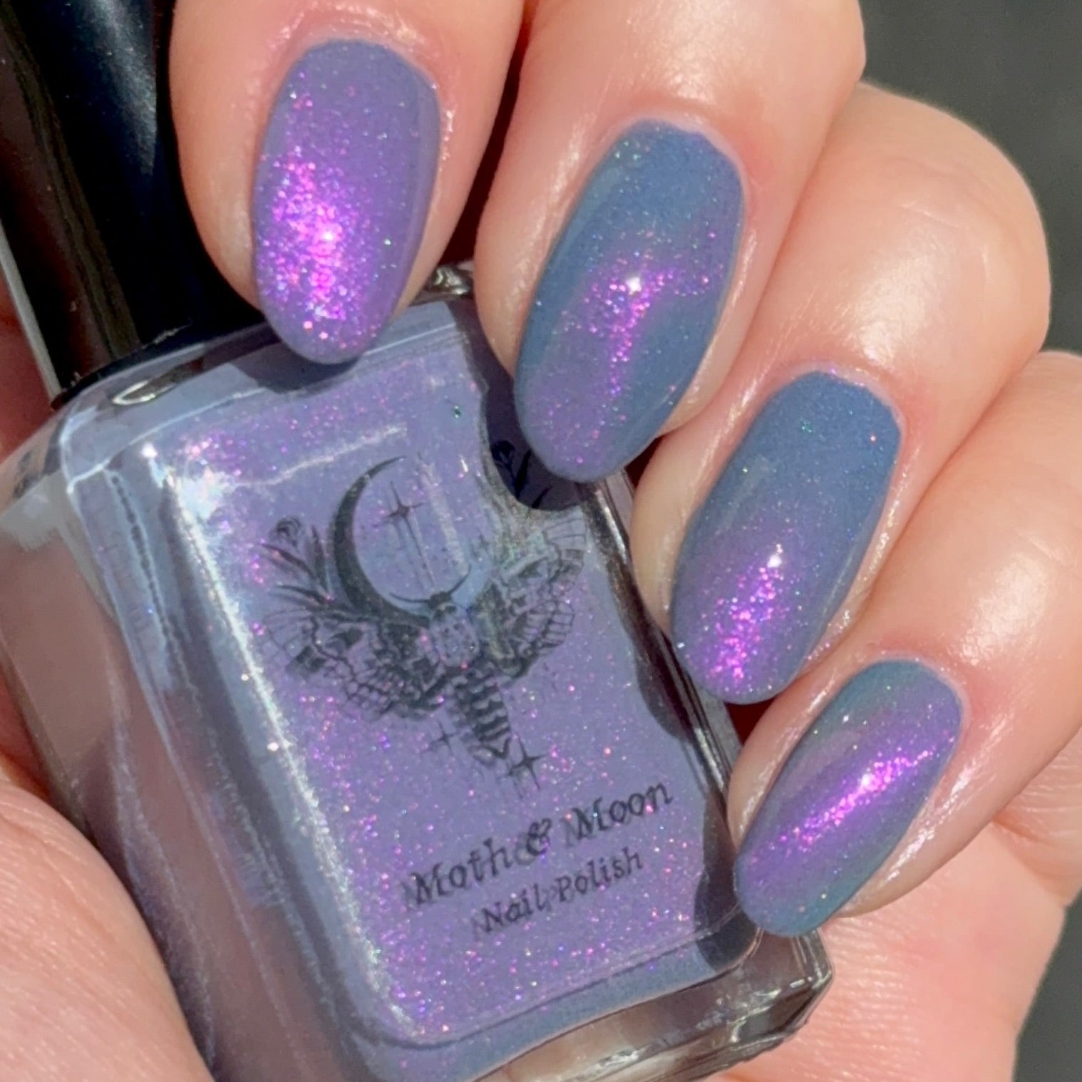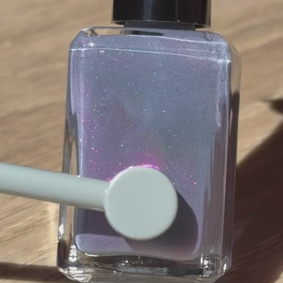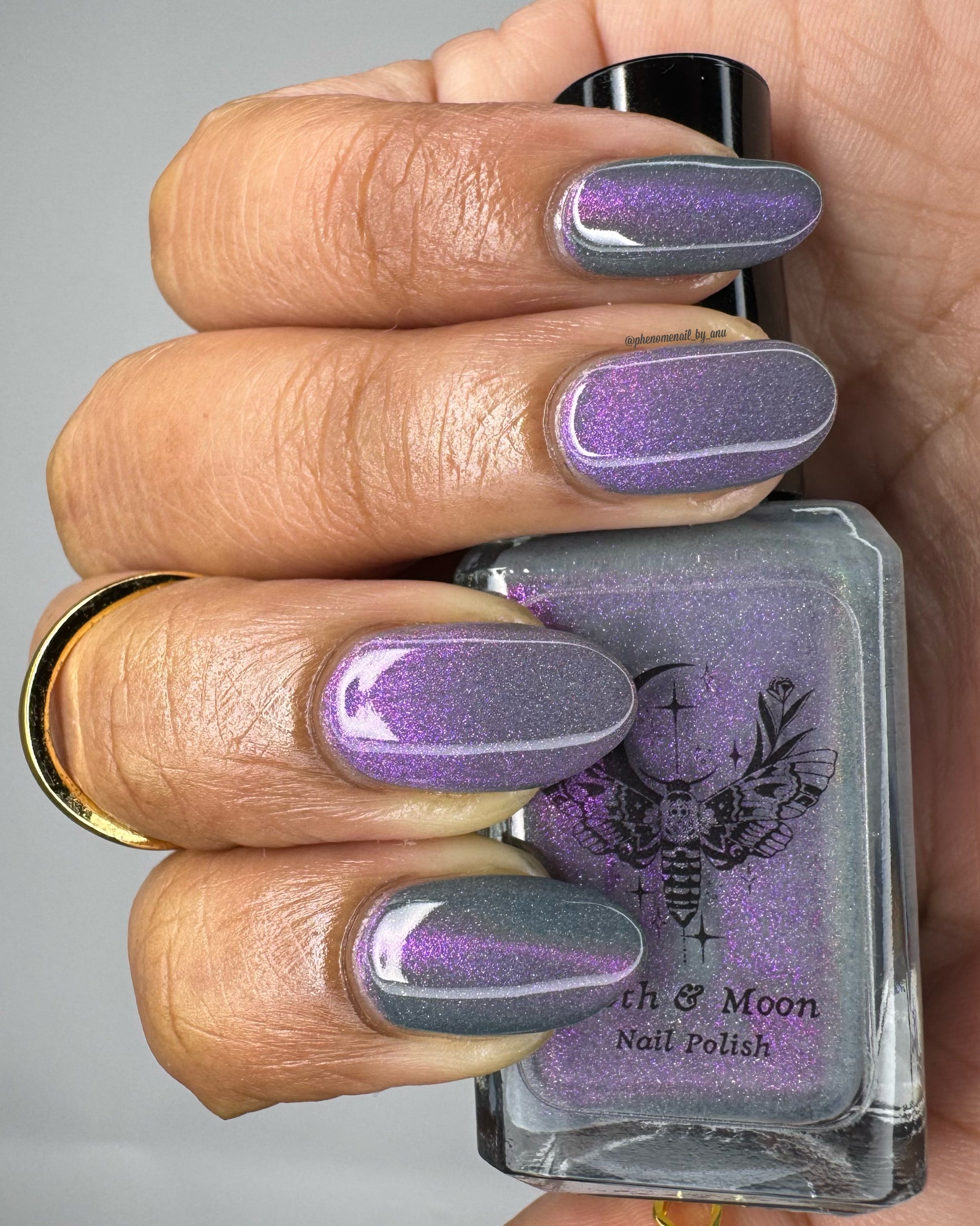 This is a periwinkle grey shade with purple duochrome magnetic, and subtle holographic spectraflair.