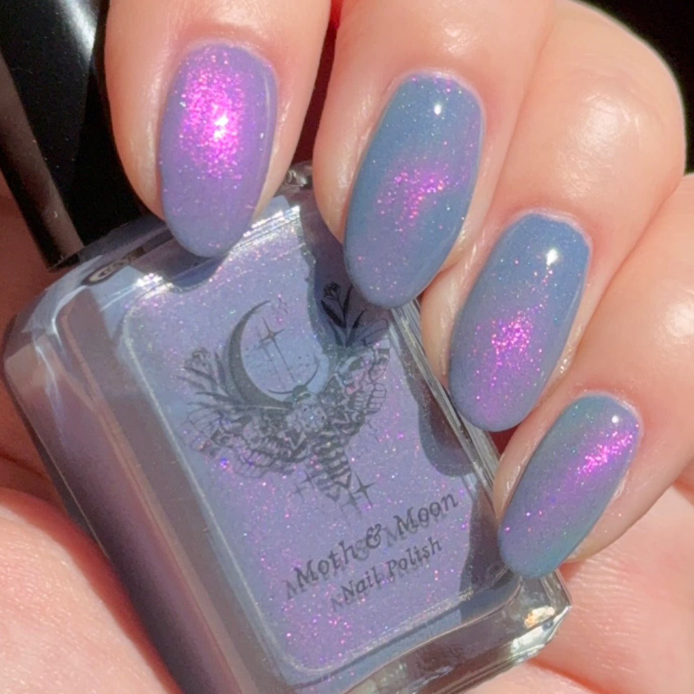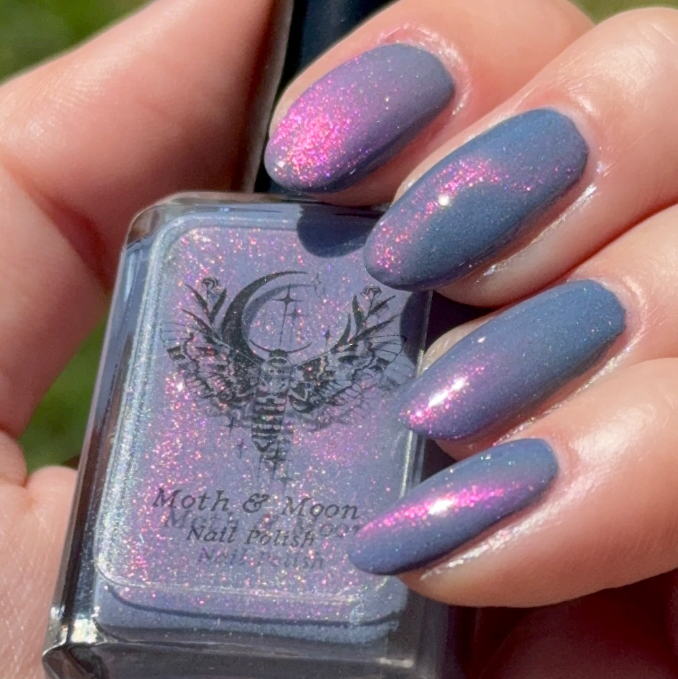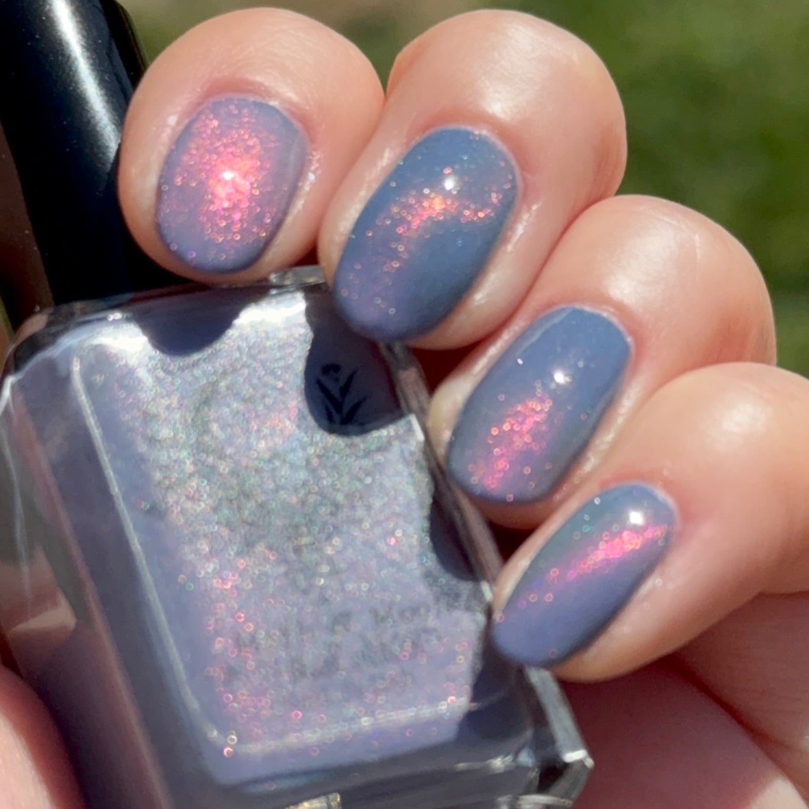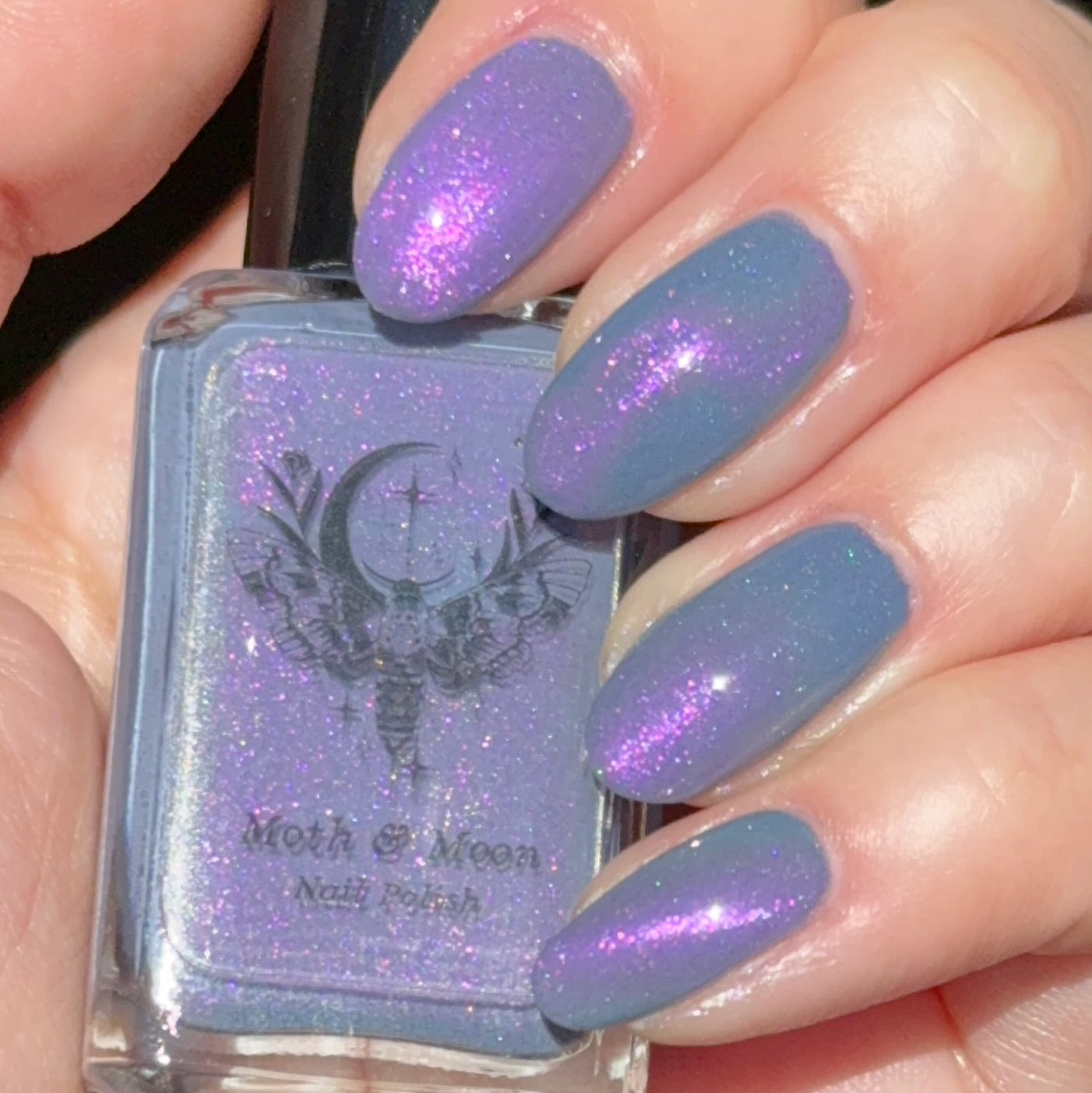 This is a periwinkle grey shade with purple duochrome magnetic, and subtle holographic spectraflair.