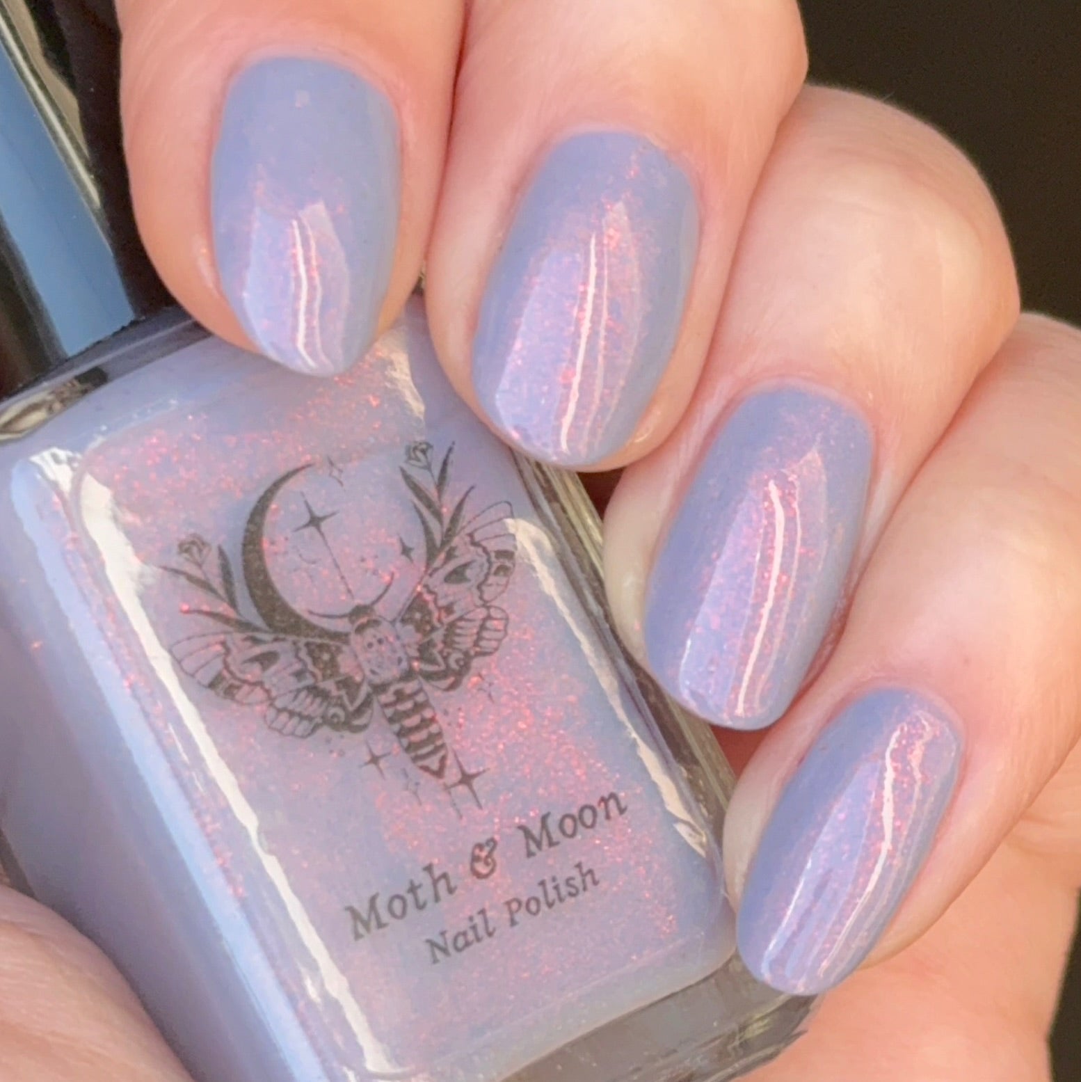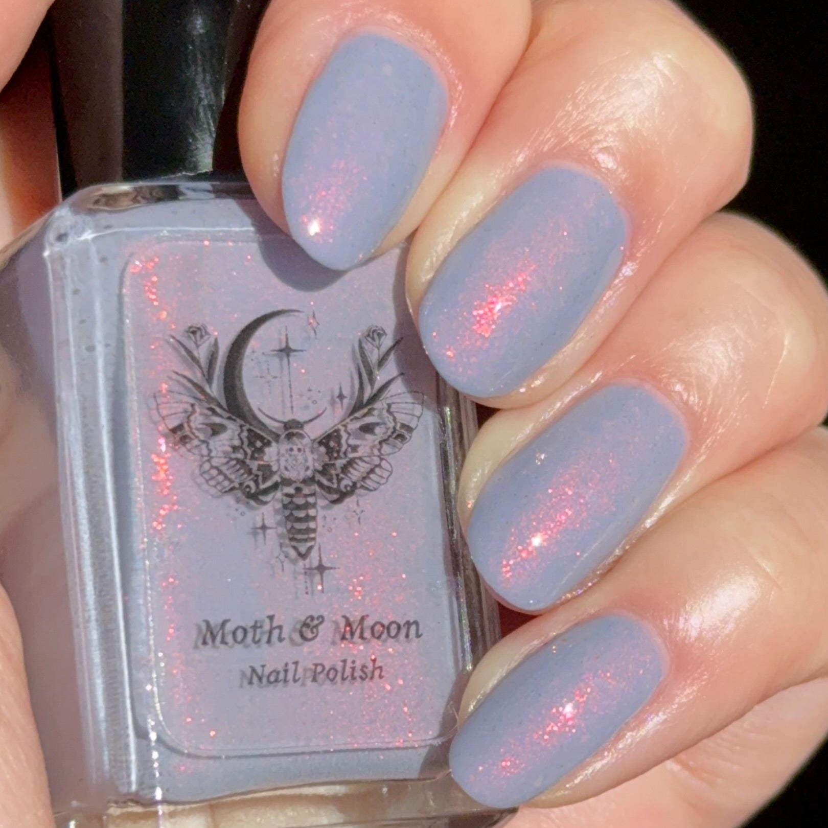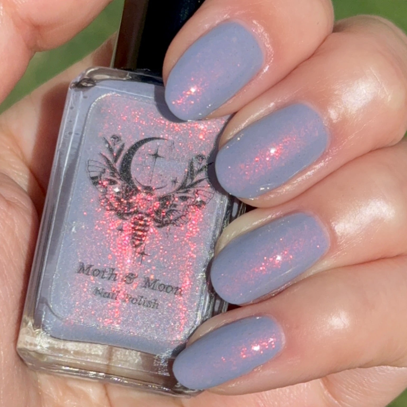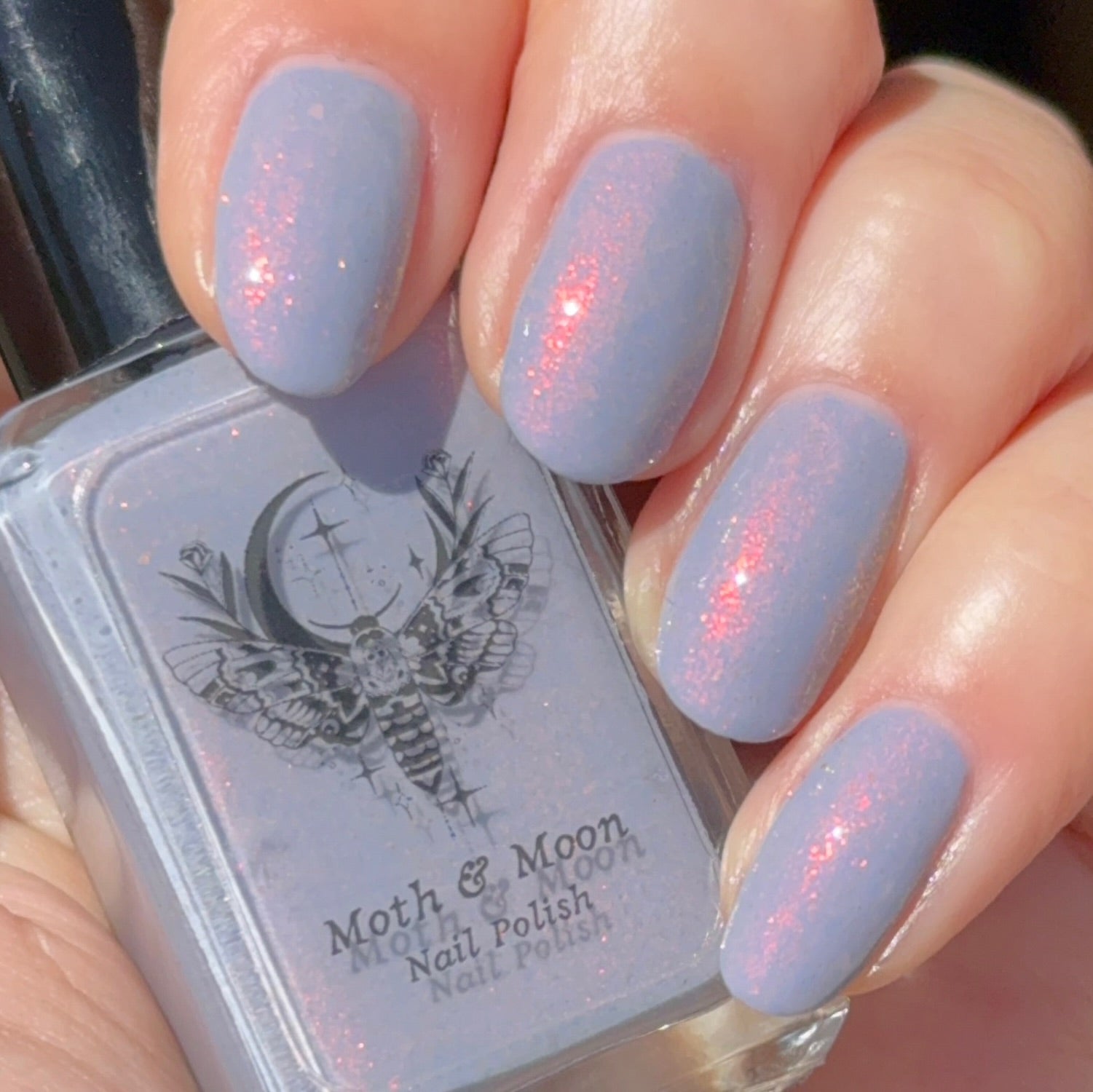 Light dusty blue with bright red-orange iridescent shimmer and micro flecks.
