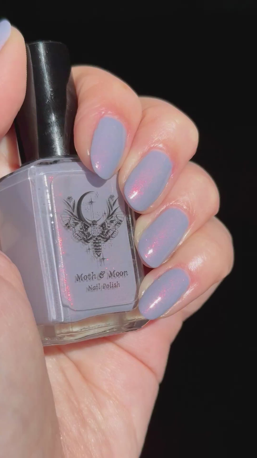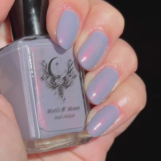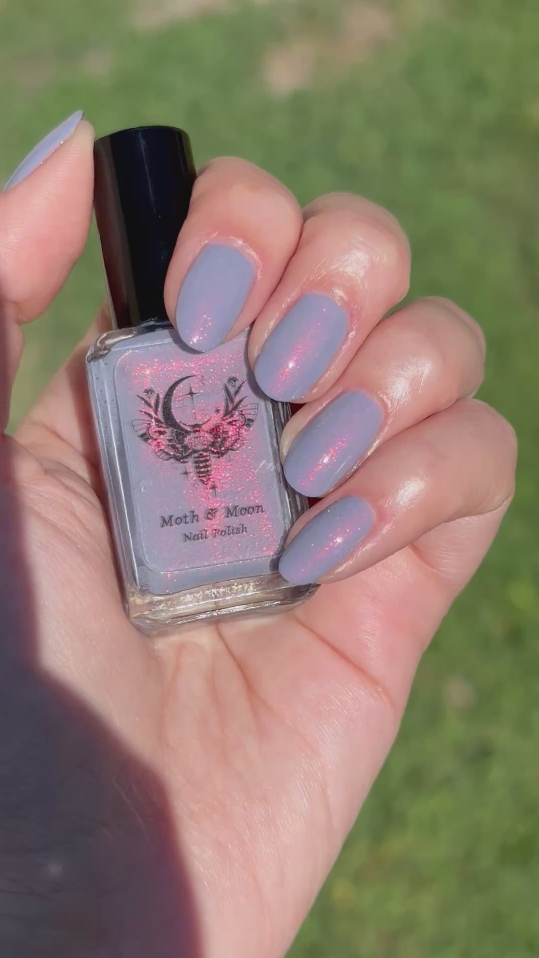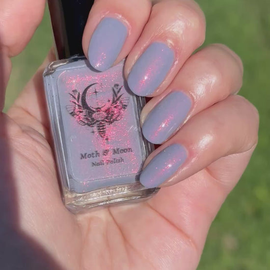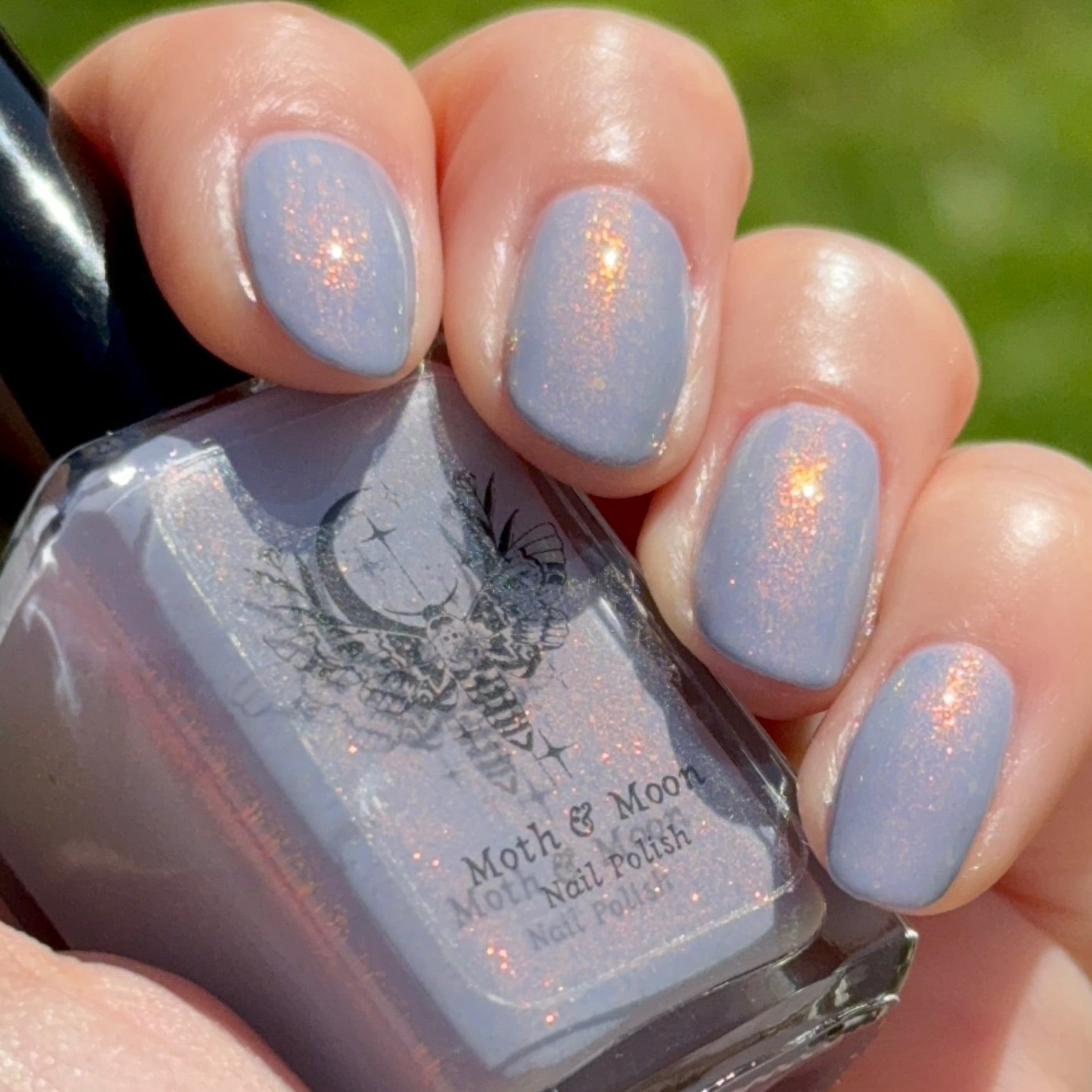 Light dusty blue with bright red-orange iridescent shimmer and micro flecks.